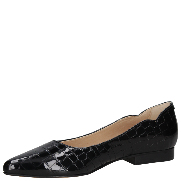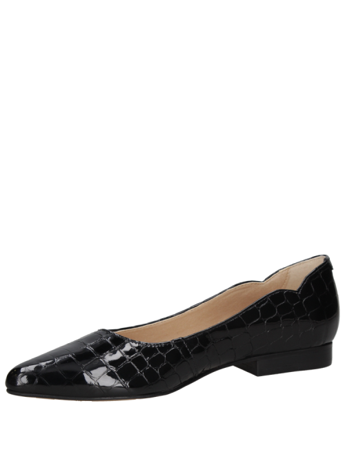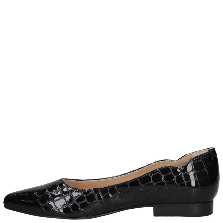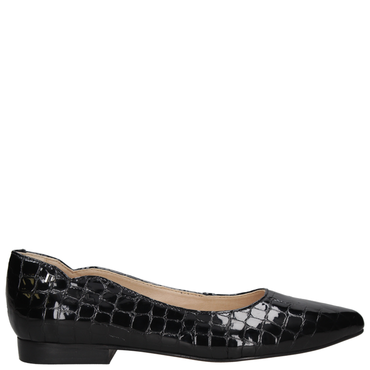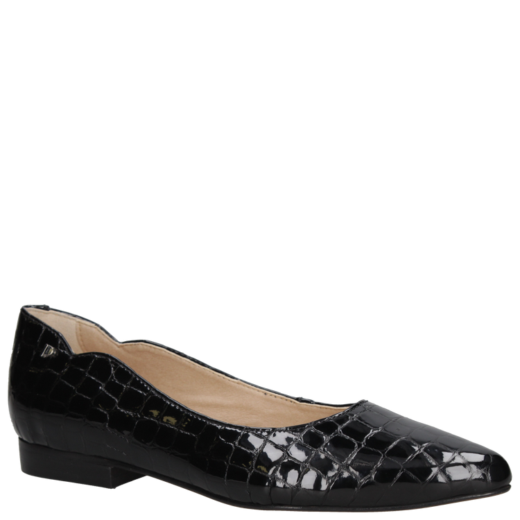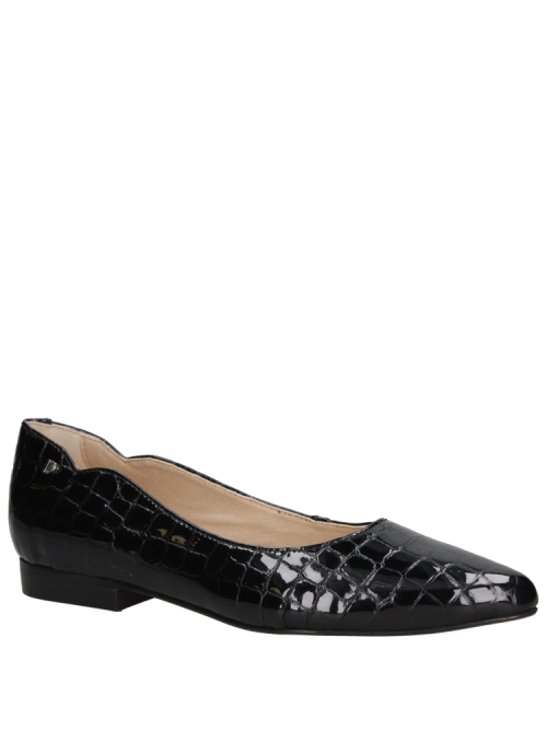 Confeccionada en cuero premium con acabado brillante charol y forro de microfibra on steam, cuenta con punta puntiaguda, taco plano de 1.5 cm y caña de 6 cm, ofreciendo confort y presencia en cada paso. Explora nuestro catálogo y encuentra la ballerina perfecta que combine estilo, sofisticación y practicidad para cualquier ocasión.