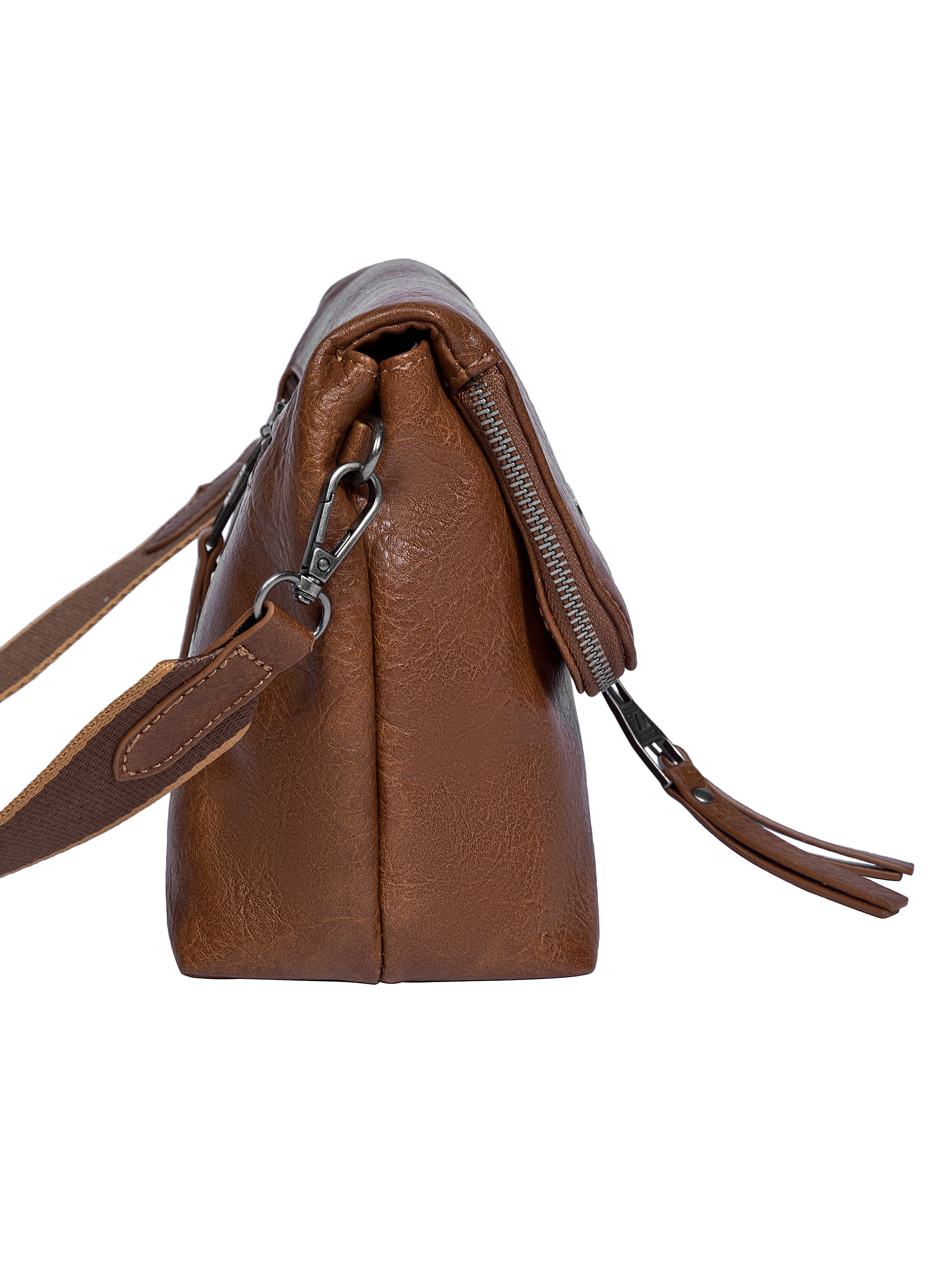 La bandolera Zappa en un elegante color café se convierte en tu aliada perfecta para cualquier ocasión. Con un diseño audaz y vanguardista, esta pieza cuenta con dimensiones de 18 cm de altura y 31 cm de largo. Su acabado en cuero texturizado aporta una textura sofisticada que destaca. Con 3 prácticos bolsillos, uno con cierre, y una correa extraíble y ajustable, es ideal para llevar tus esenciales en el trabajo o la universidad. Cada detalle, como el broche de imán y los acabados en metal, añade carácter a tu look.