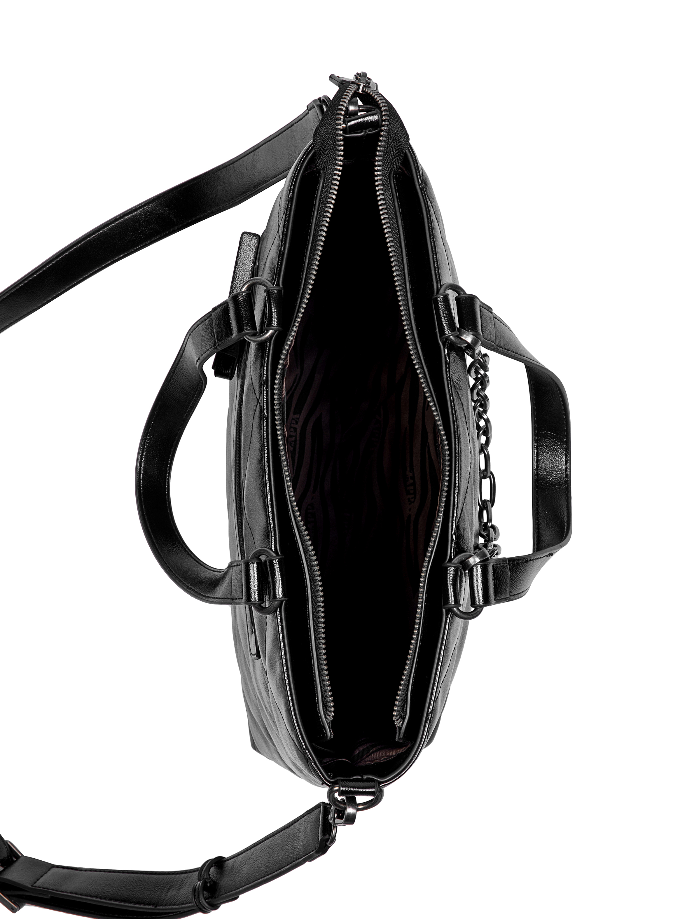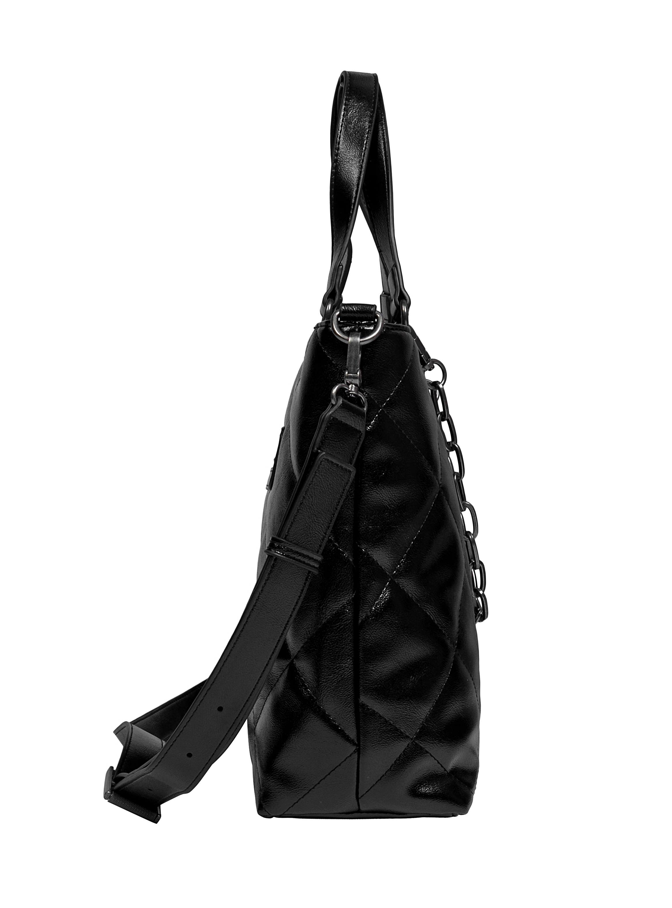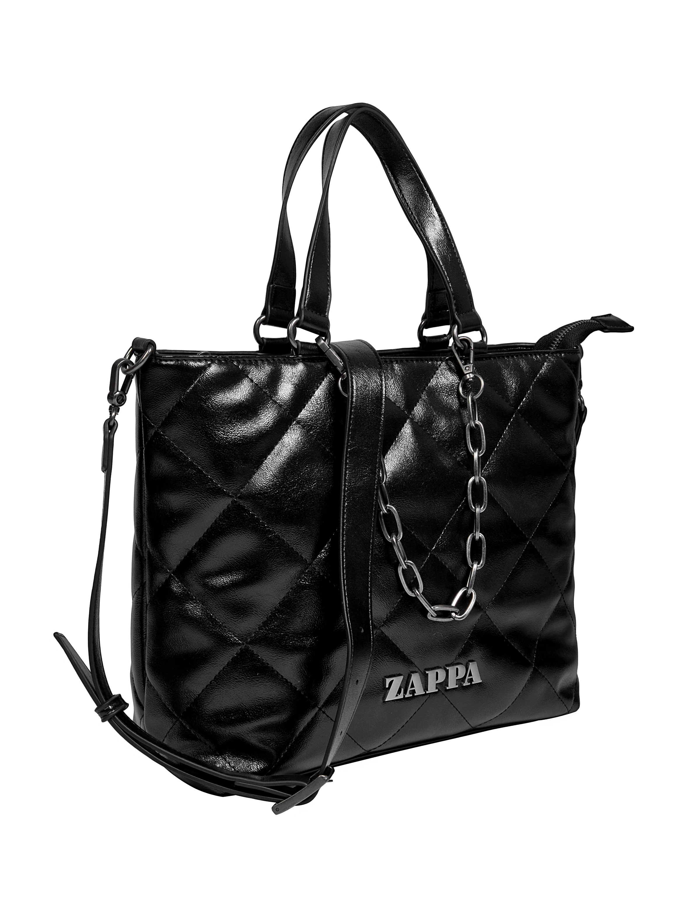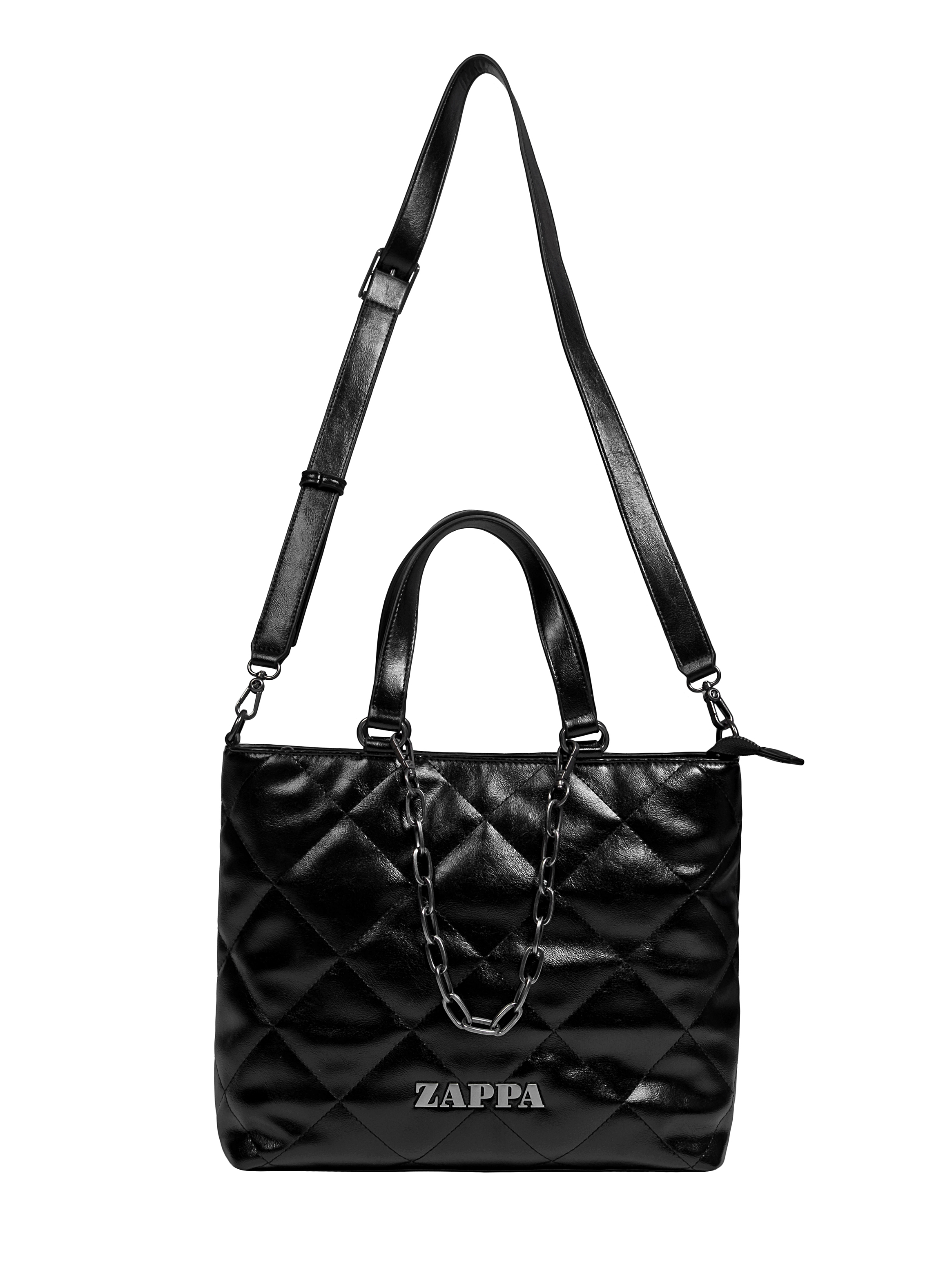 Descubre la Bandolera Zappa en un elegante negro que resalta su personalidad audaz. Con medidas de 28 cm de alto, 37 cm de ancho desde el centro y 47 cm desde la parte superior, y 10 cm de profundidad, es perfecta para cargar lo esencial en el trabajo o la academia. Su diseño acolchado de textura brillante y su cierre metálico grueso añaden un toque moderno, mientras que la cadena le da un giro contemporáneo. Con 3 bolsillos, uno con cierre, mantendrás tus objetos organizados. No solo es una bandolera, es una declaración de estilo. ¡Hazla tuya!