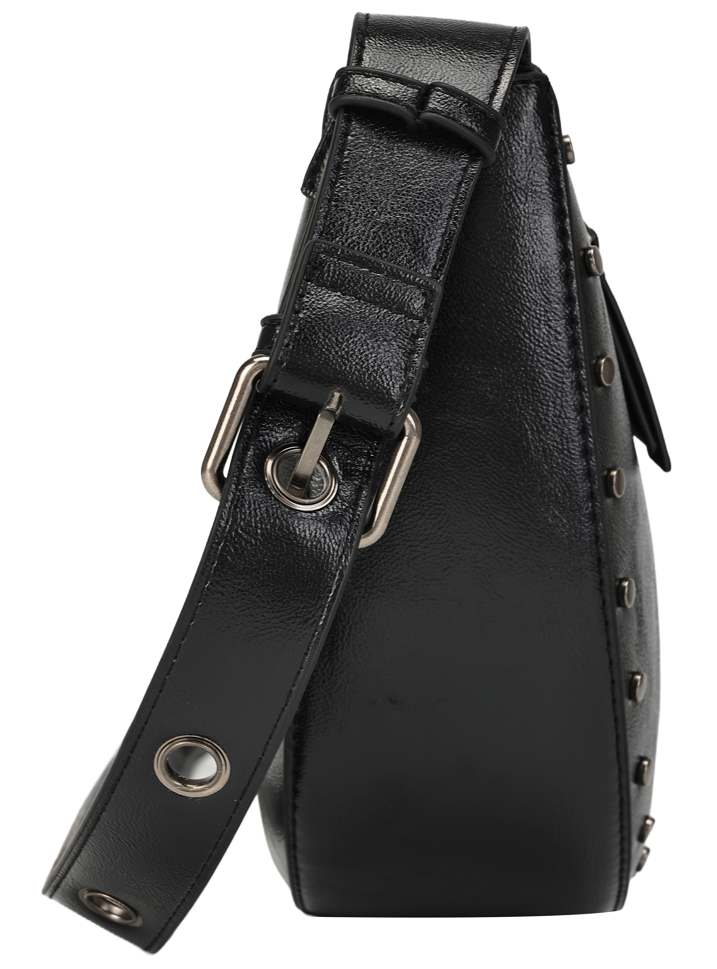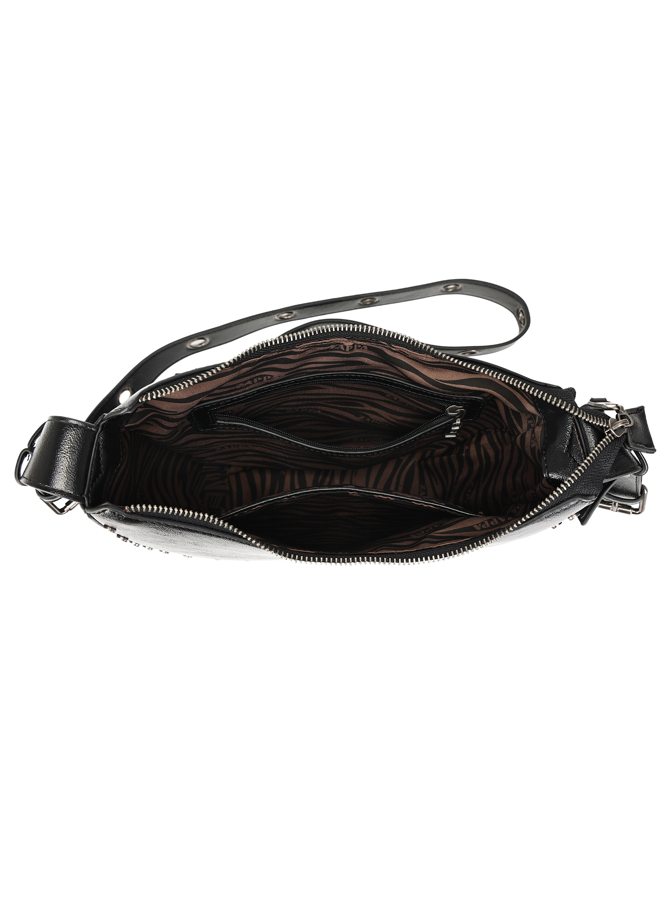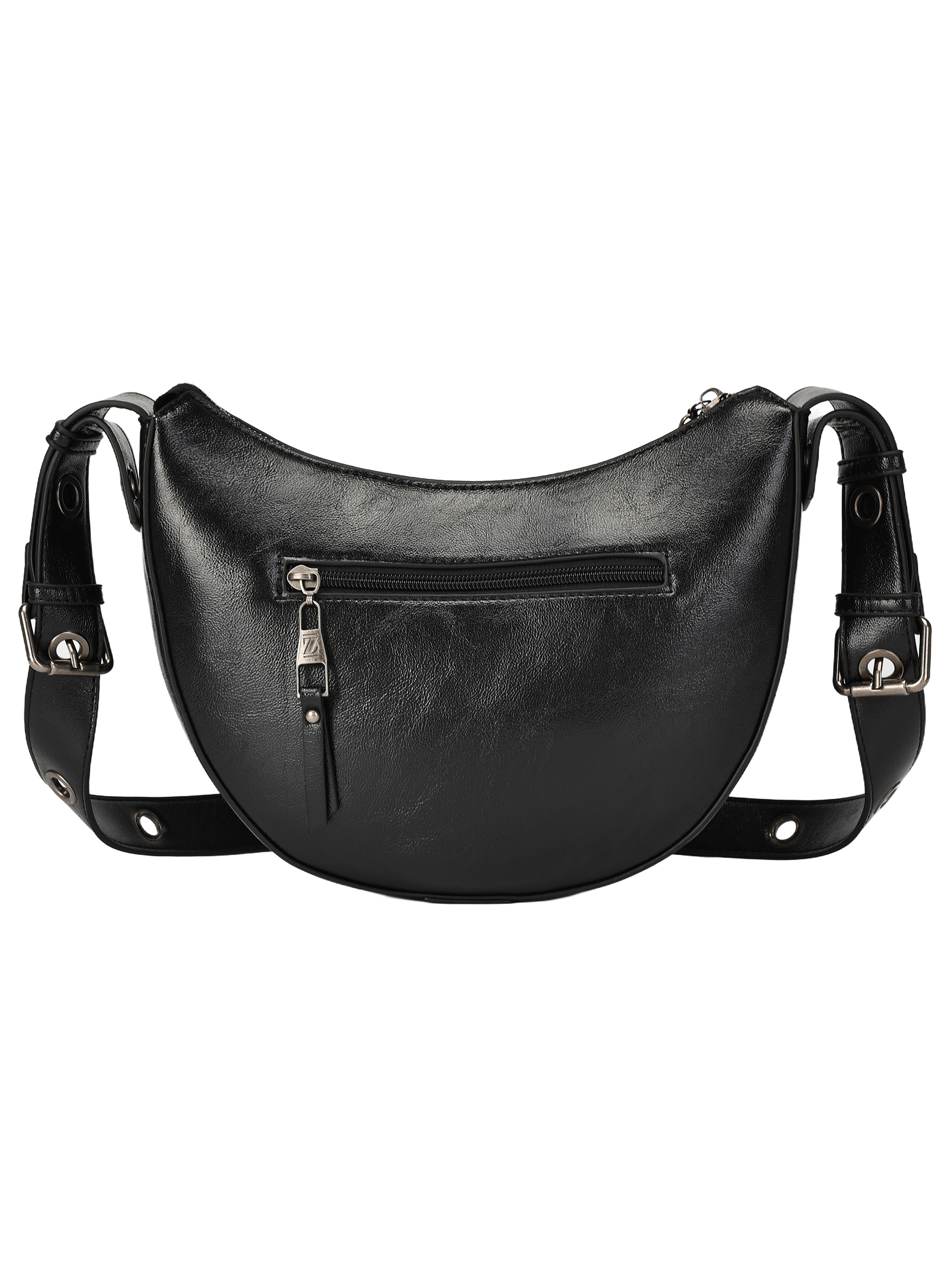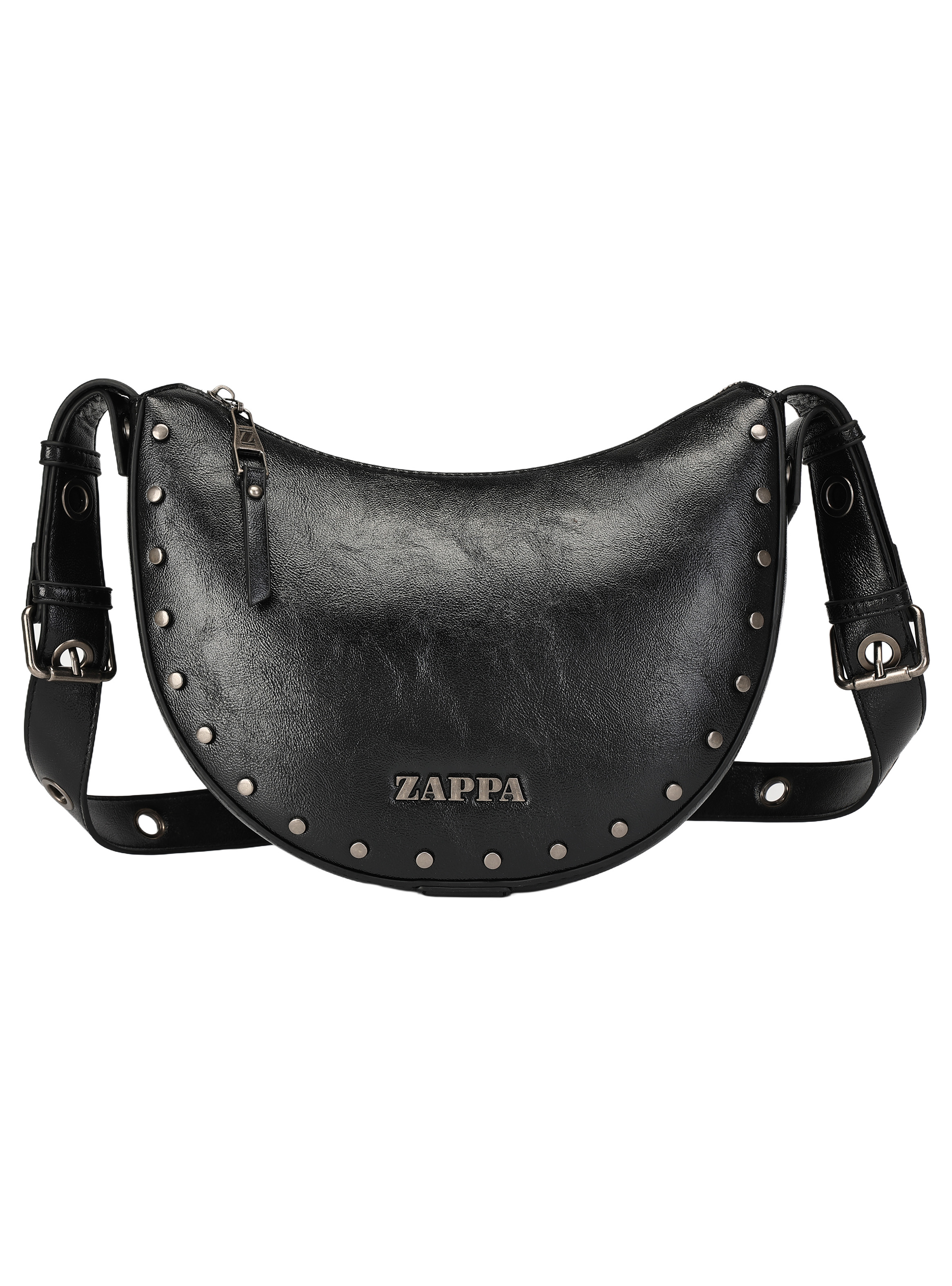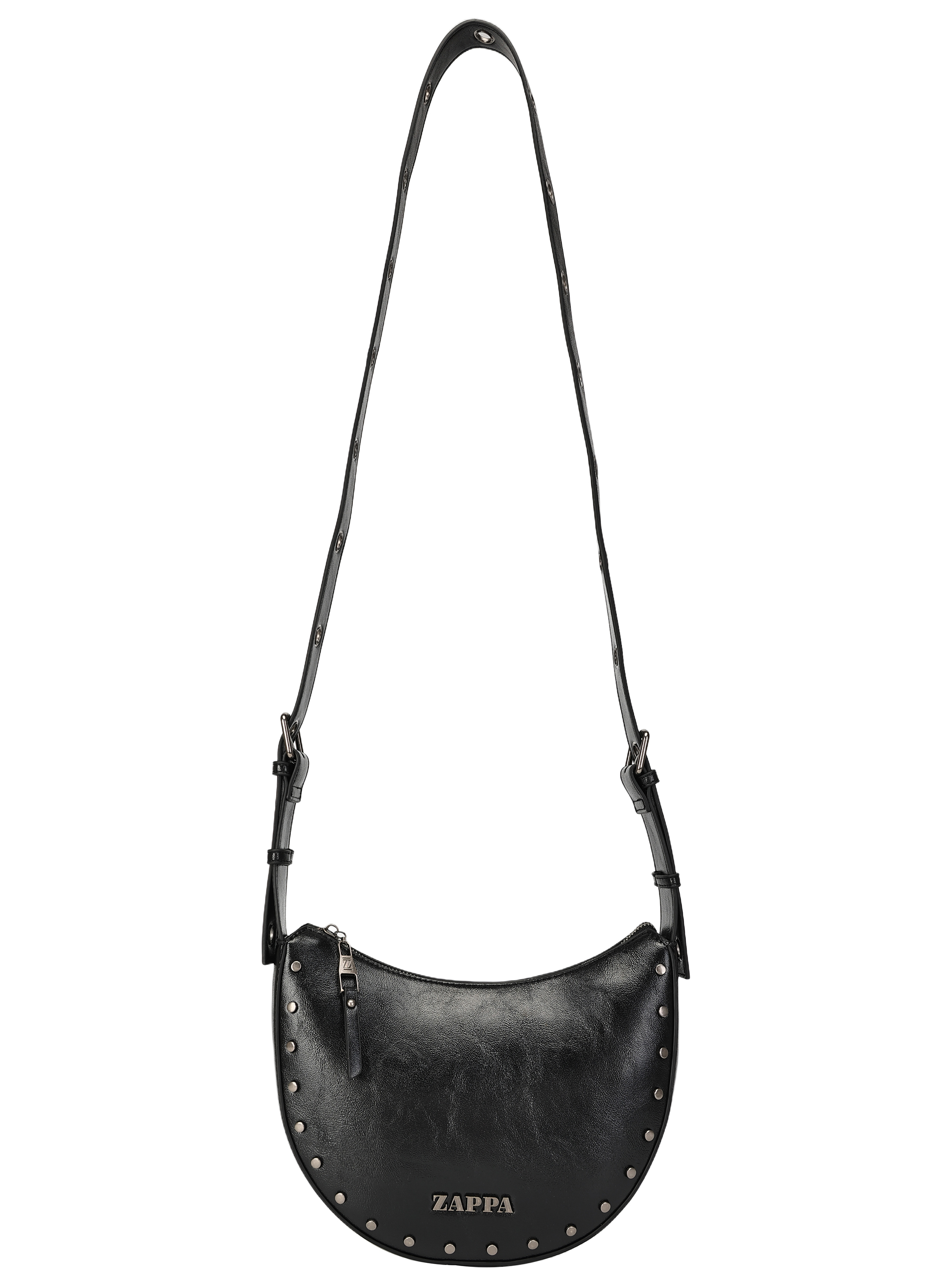 La bandolera Zappa es el complemento perfecto para cualquier look audaz. Diseñada en negro brillante con detalles metálicos, su forma curva y los ojetillos grandes le otorgan un carácter único. Con medidas de 14 cm de alto, 18 cm de ancho y profundidad de 26 cm, es ideal para llevar tus esenciales. Su correa ajustable, que incorpora una cadena metálica, combina confort y estilo. Con un bolsillo interior y cierre metálico, esta bandolera es tan funcional como chic. ¡Atrévete a destacar con Zappa!