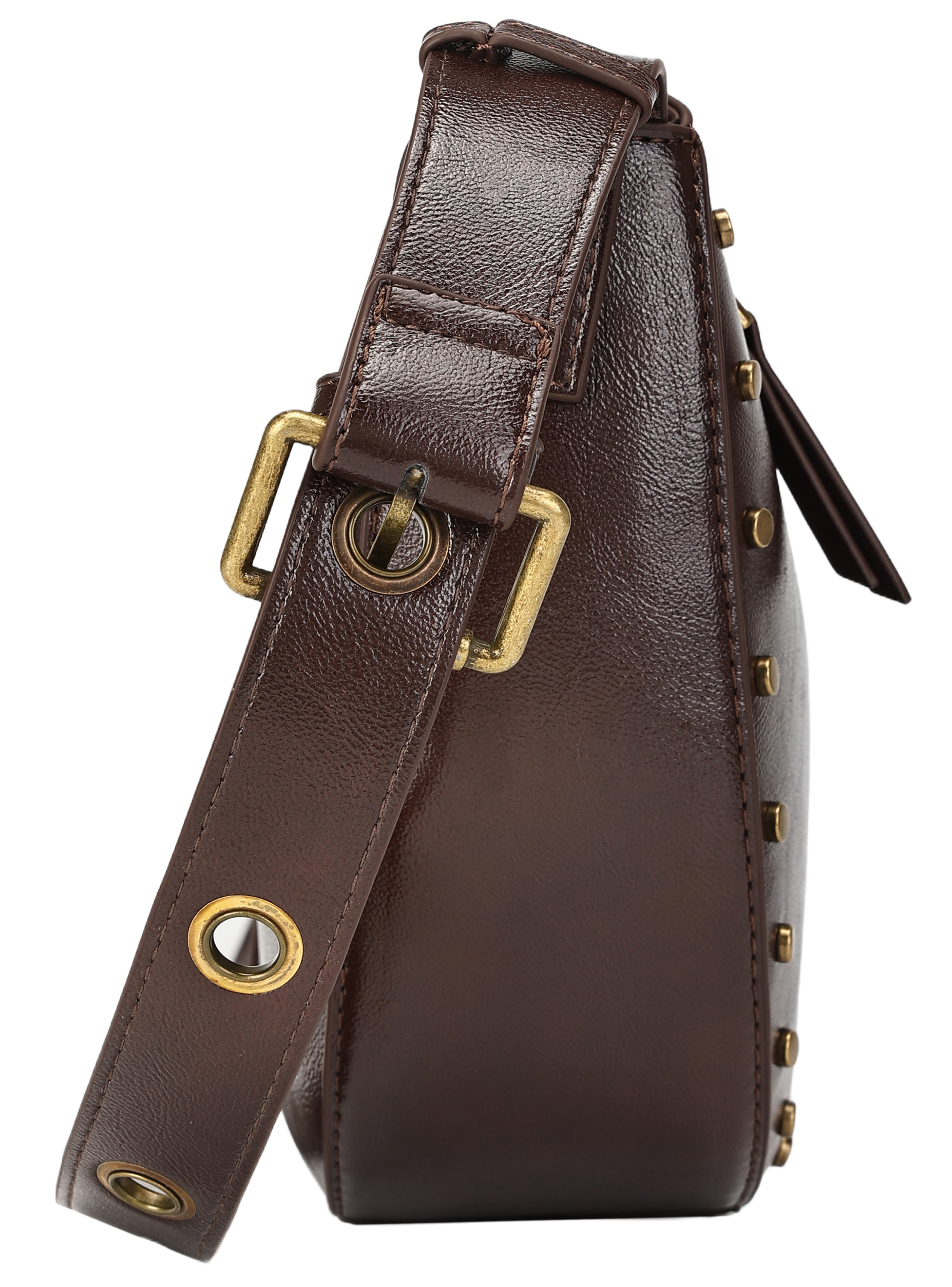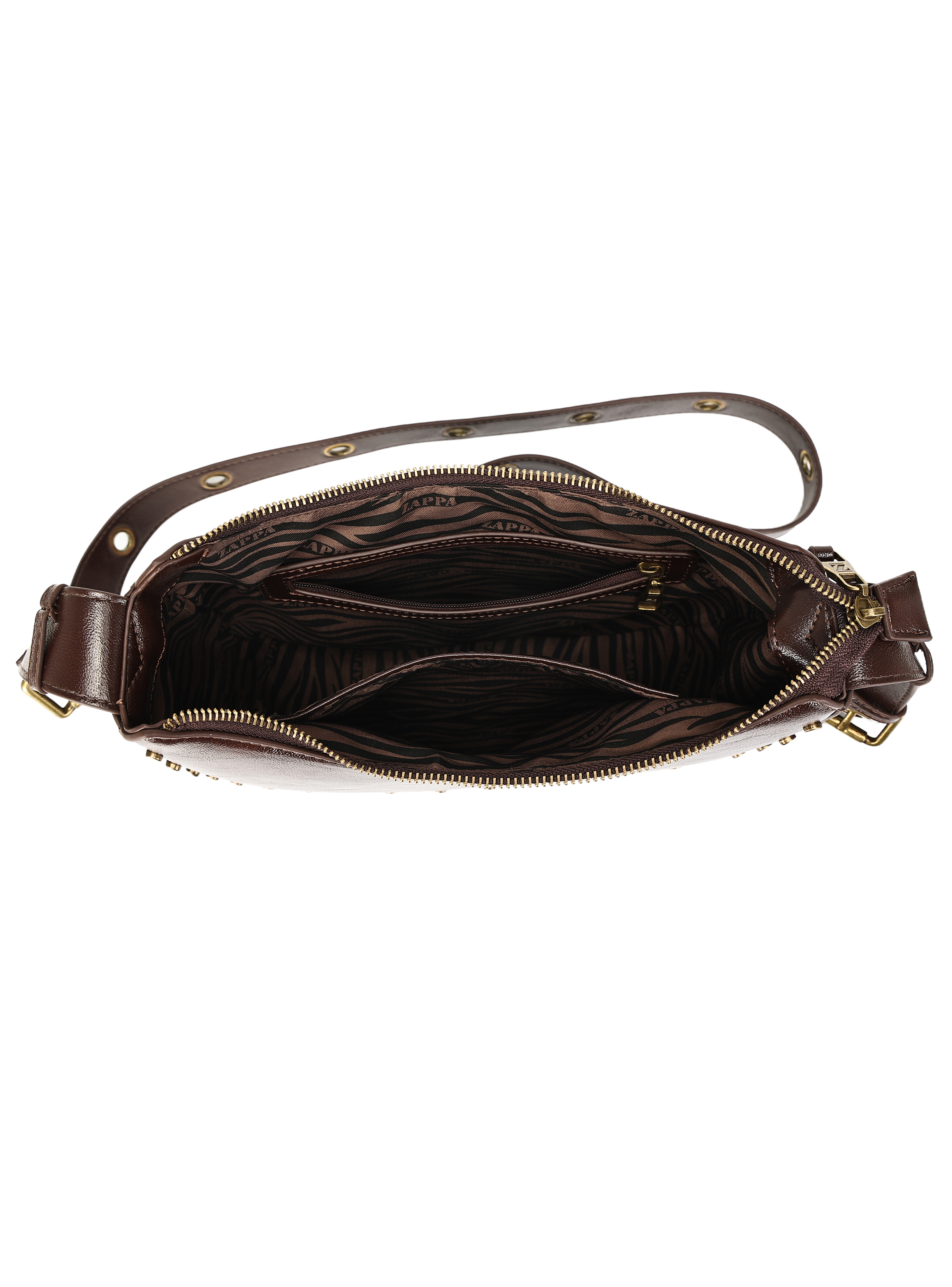 La bandolera Zappa en color moro es tu aliada perfecta para cada día. Con un diseño vanguardista, destaca por su acabado brillante y los llamativos ojetillos metálicos que adornan la correa ajustable. Sus medidas de 26 cm en el centro y 15 cm desde el borde inferior la hacen ideal para llevar lo esencial en cualquier terreno, ya sea en la oficina o la universidad. Cuenta con dos prácticos bolsillos, uno de ellos con cierre metálico, que suman a su funcionalidad y estilo único. ¡Atrévete a destacarte con Zappa!