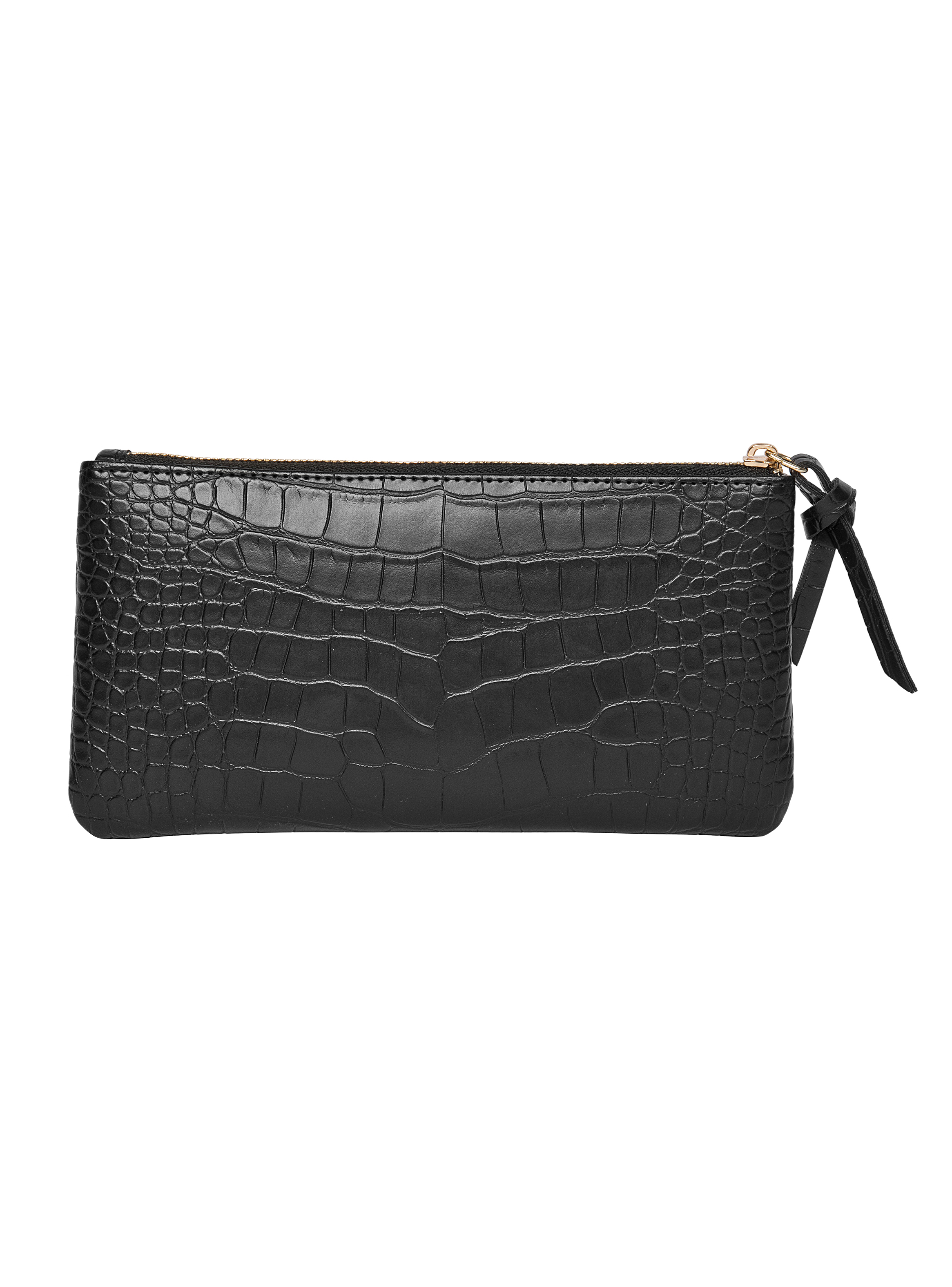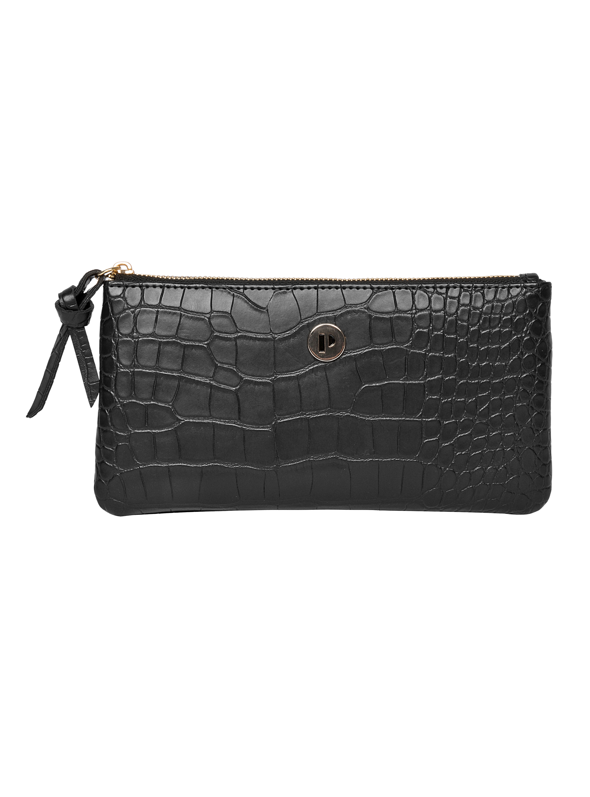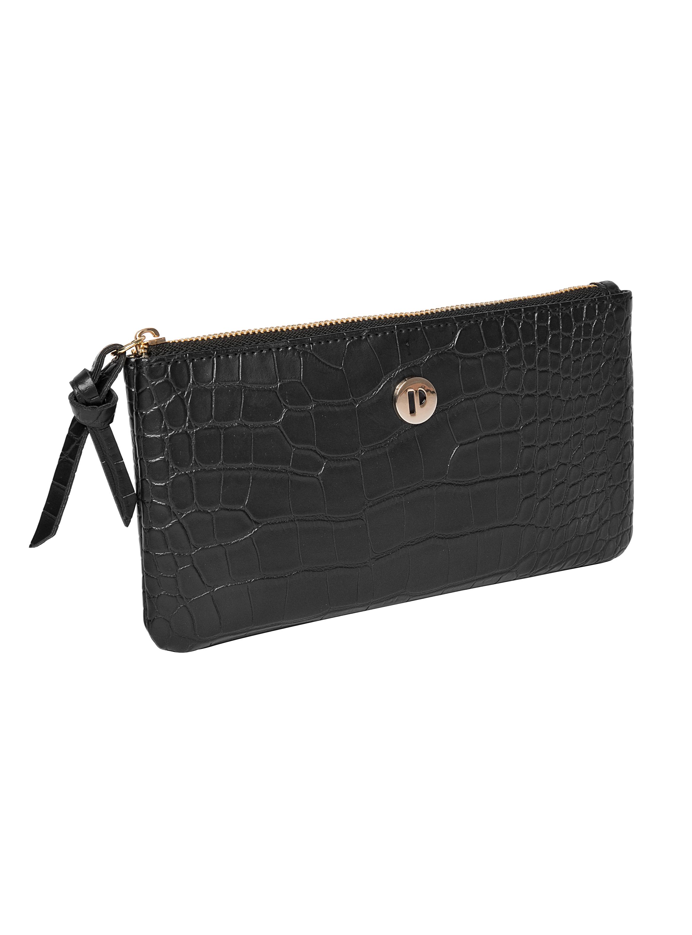 La billetera Pollini es el accesorio que toda mujer moderna desea tener. Con su elegante silueta alargada y rectangular, se presenta en un sofisticado color negro que evoca la esencia de la moda contemporánea. Su textura, que imita la piel de cocodrilo, no solo cautiva a la vista, sino que también ofrece un tacto envolvente gracias a sus grabados asimétricos. El acabado brillante resalta las escamas del diseño, mientras que un delicado sello metálico dorado aporta un toque de luz y distinción. Con medidas de 10.5 cm de alto y 20.5 cm de ancho, esta billetera es perfecta para organizar hasta 6 tarjetas, combinando funcionalidad y estilo en cada uso.