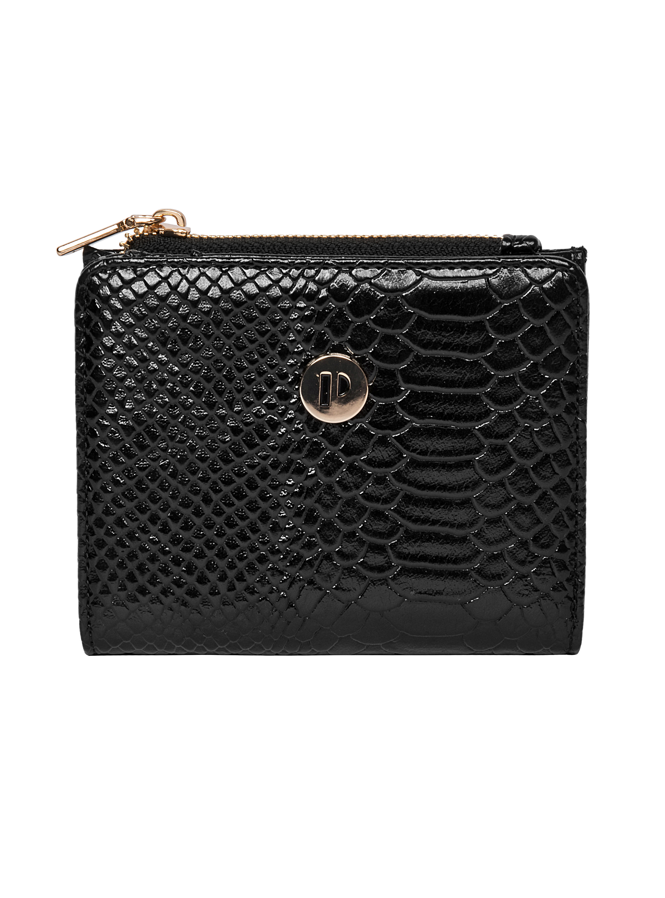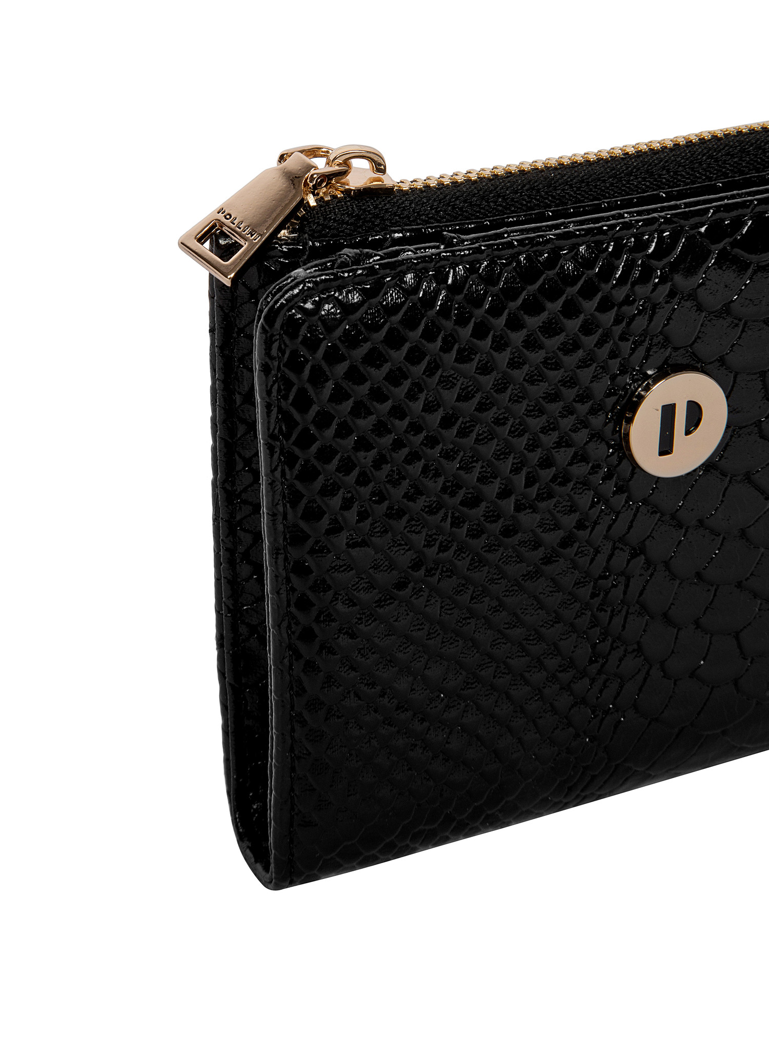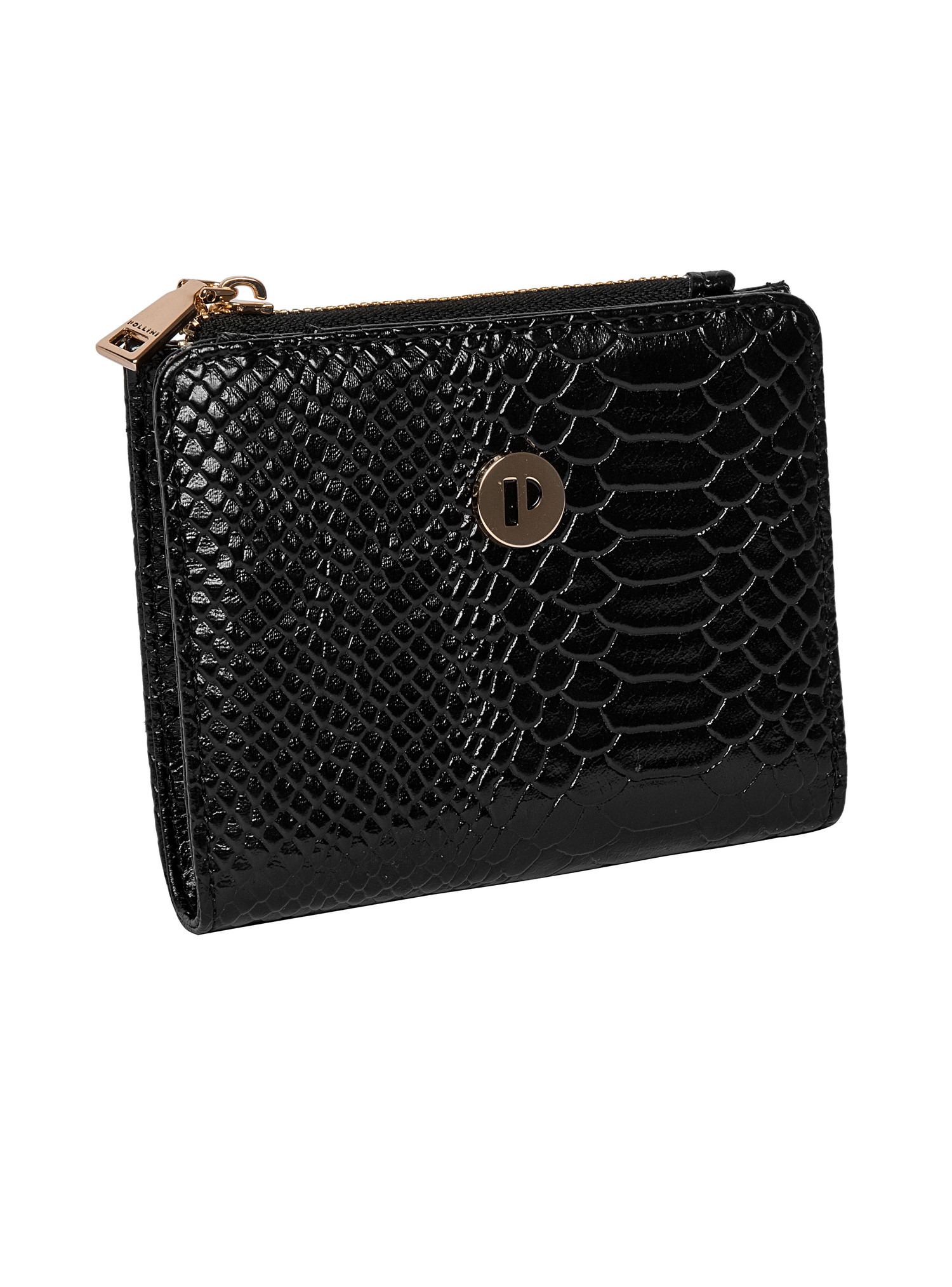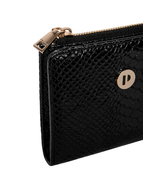 La billetera Pollini es la esencia de la elegancia contemporánea, diseñada para la mujer que busca un accesorio que combine estilo y funcionalidad. Su estructura compacta y cuadrada, con un acabado charolado que evoca la sofisticación, refleja la luz en un juego de brillos cautivador. El patrón de escamas de serpiente añade un toque vanguardista, mientras que el logo metálico dorado resalta su identidad única. Con medidas de 10 cm de alto y 12.5 cm de ancho, esta pieza ofrece espacio para hasta 4 tarjetas, cerrándose con un broche metálico que asegura su contenido. Ideal para completar cualquier look, es el aliado perfecto para la fashionista moderna.