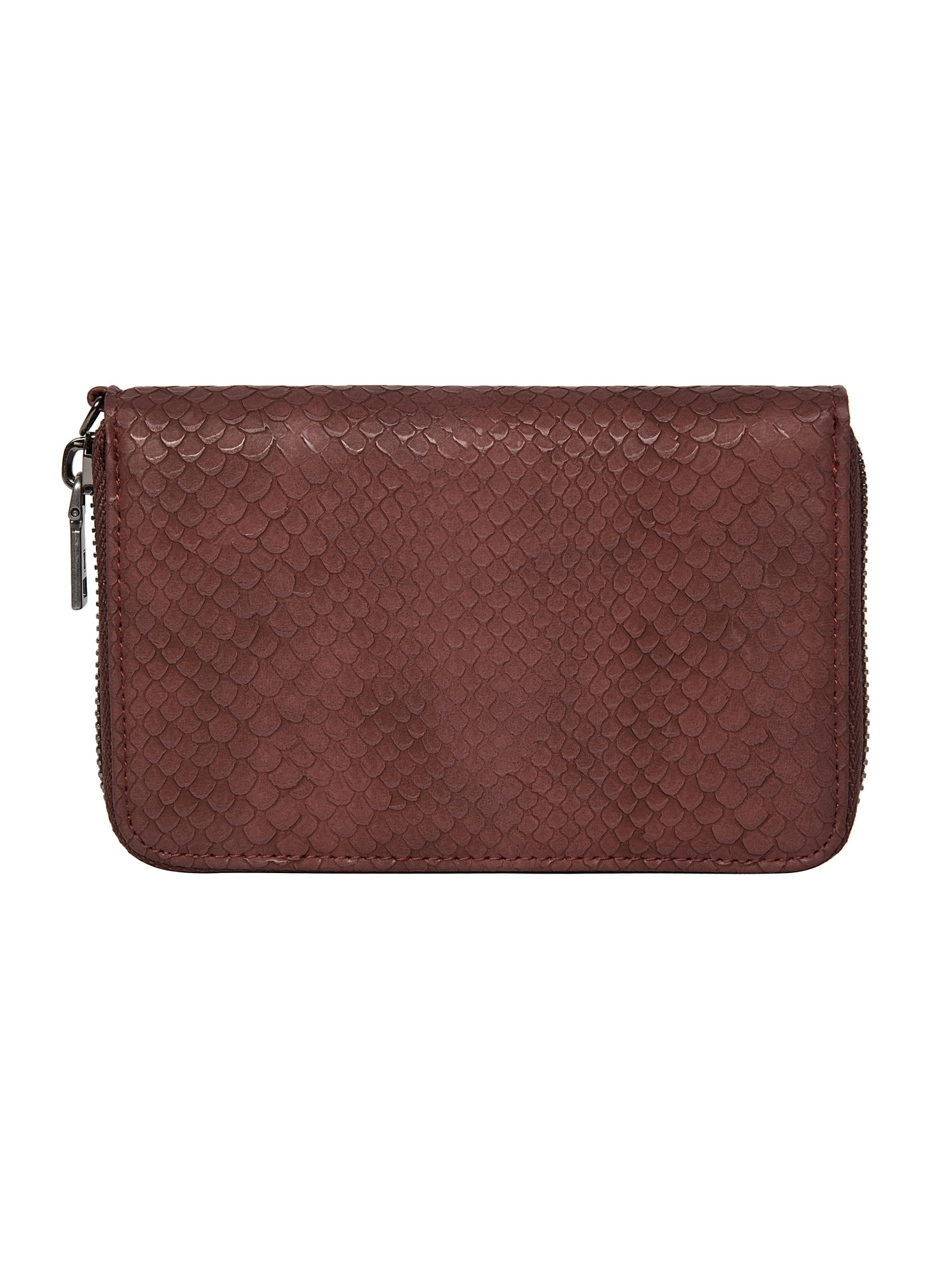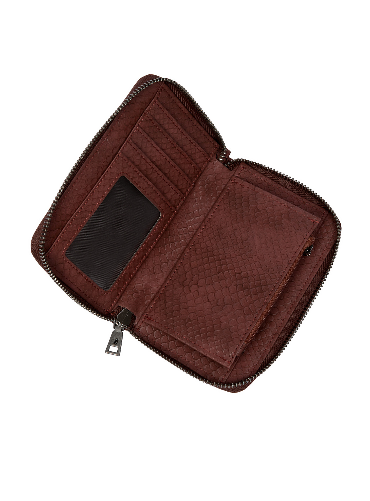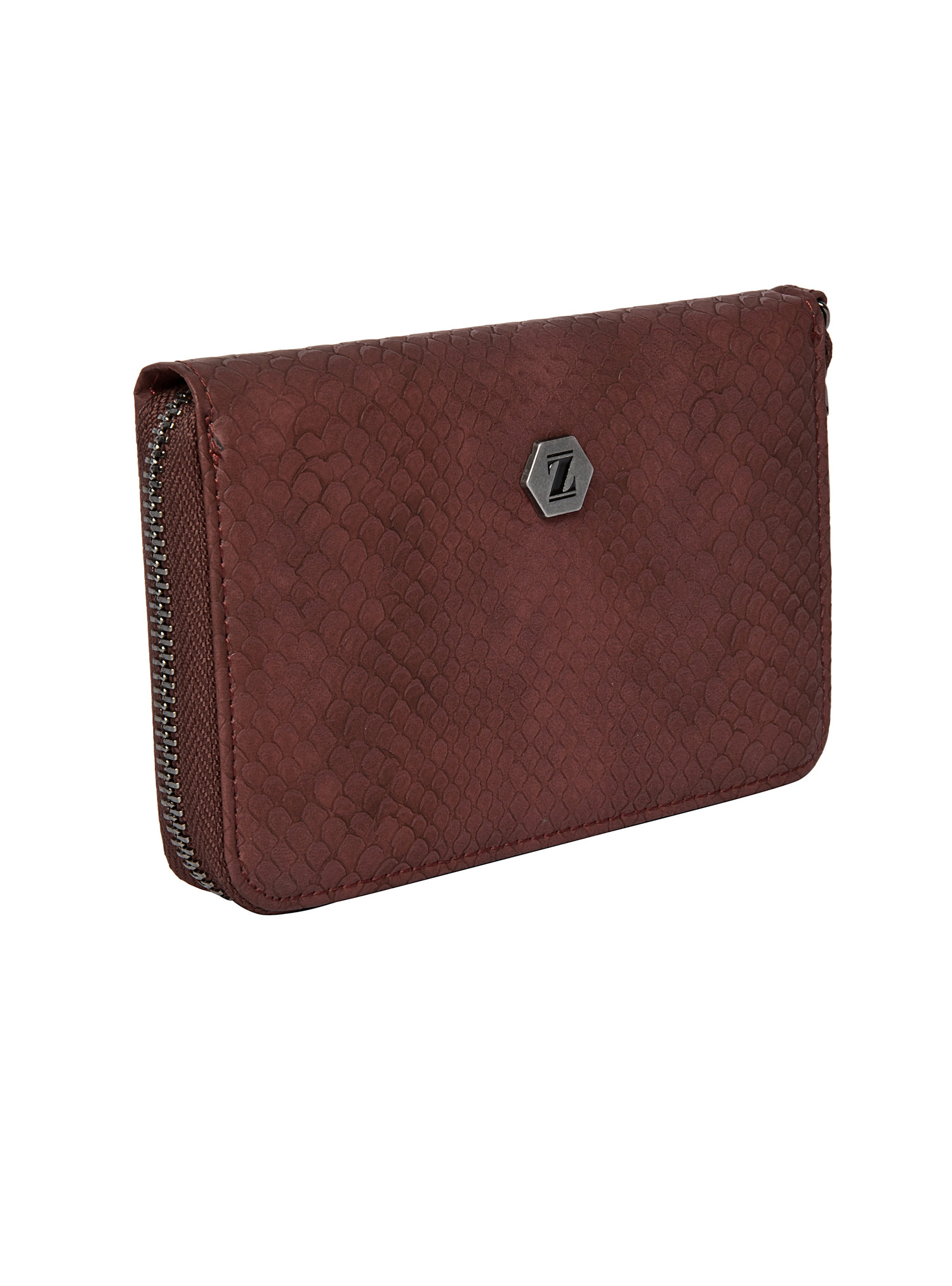 La billetera Zappa en un sofisticado burdeos profundo es la declaración de estilo que tu look necesita. Su textura grabada y el acabado mate satinado aportan un aire lujoso, mientras que el emblema metálico hexagonal añade un toque distintivo. Con medidas de 10 cm de alto y 15 cm de ancho, este diseño rectangular con esquinas curvas combina elegancia y funcionalidad, permitiendo almacenar hasta 9 tarjetas con facilidad. La cremallera que recorre su contorno garantiza seguridad y accesibilidad. Atrévete a llevar una pieza que no solo complementa tu outfit, sino que también impone tendencias con su carácter audaz y moderno.
