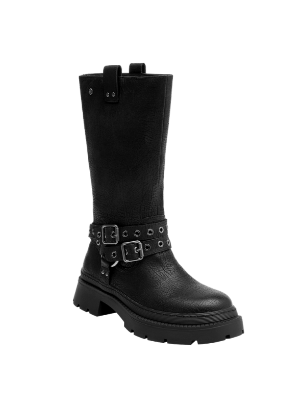 La bota de mujer de Zappa L383 combina un diseño robusto y funcional con un estilo militar que destaca por su caña alta de 28 cm, proporcionando excelente soporte y protección. La suela gruesa de goma asegura tracción y confort en cualquier terreno, mientras que las correas con hebillas metálicas y múltiples ojales añaden un toque industrial. El tirador superior facilita el calzado, y la textura rugosa del cuero le da un aspecto desgastado y resistente, ideal para quienes buscan un look estiloso y práctico para el día a día o actividades al aire libre.