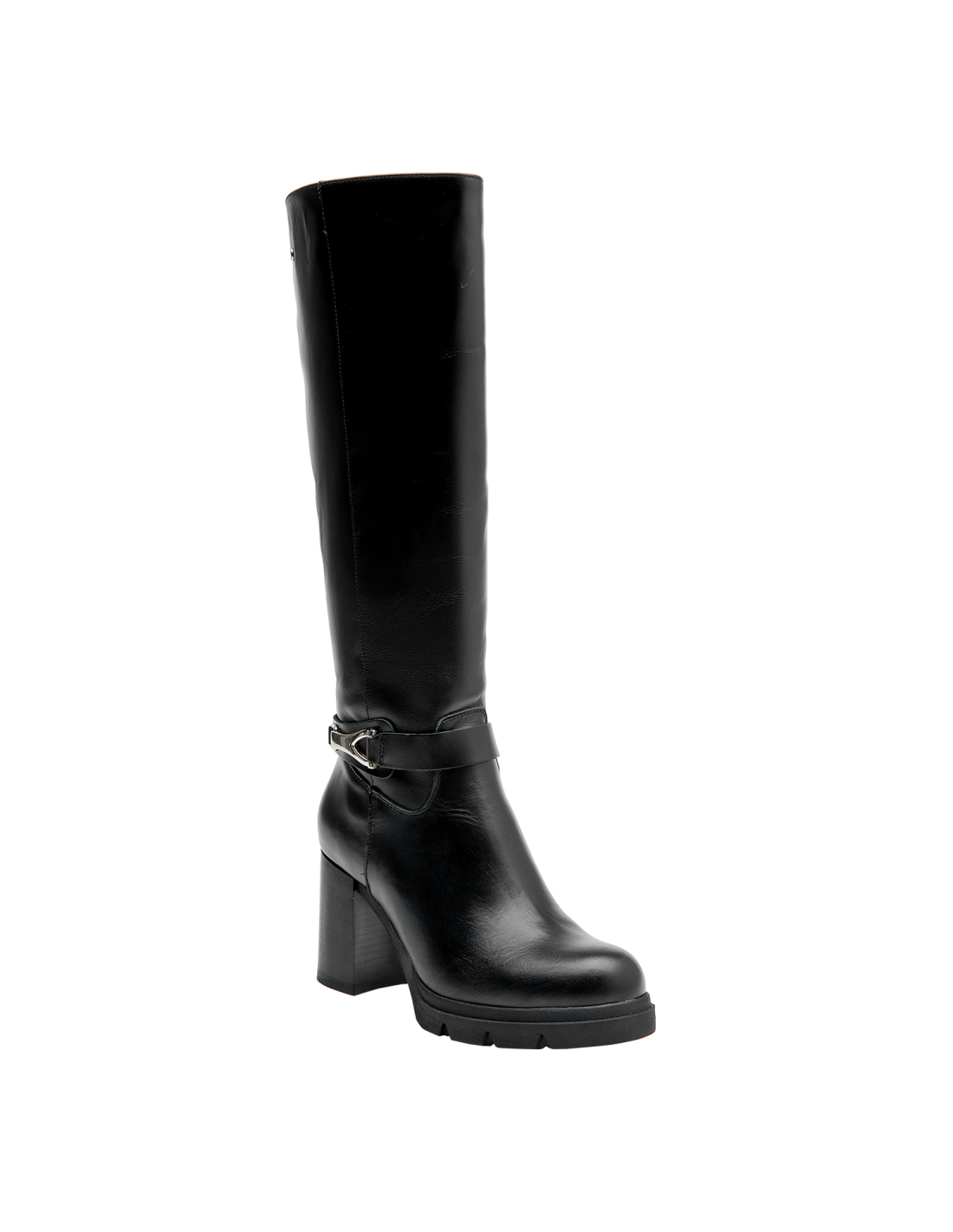 La bota de mujer de Pollini L231 es una obra maestra de diseño elegante y sofisticado, ideal para quienes buscan un calzado que combine estilo con funcionalidad. Esta bota de caña alta, con una altura de 38 cm, presenta un acabado liso que le otorga un toque pulcro y refinado, mientras que su parte superior recta y sin adornos mantiene un perfil sobrio. El material exterior es cuero, lo que garantiza durabilidad y un aspecto lujoso. La amarriqueta decorativa con hebilla dorada en el empeine añade un interés visual distintivo, mientras que el taco alto de 8 cm tipo bloque y la plataforma ligeramente elevada proporcionan estabilidad y comodidad para largos períodos de uso. Su diseño acanalado en la planta mejora el agarre, haciéndola apta para distintas superficies.