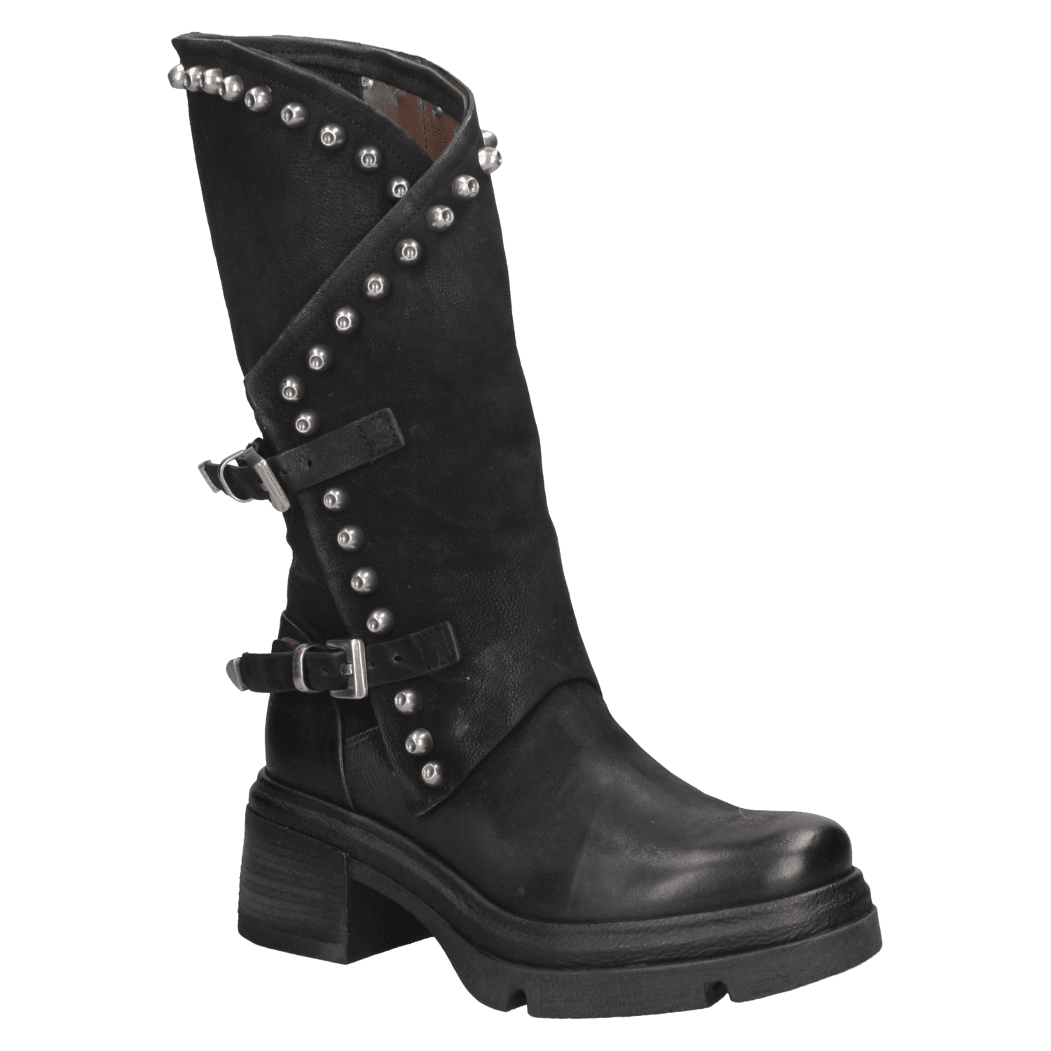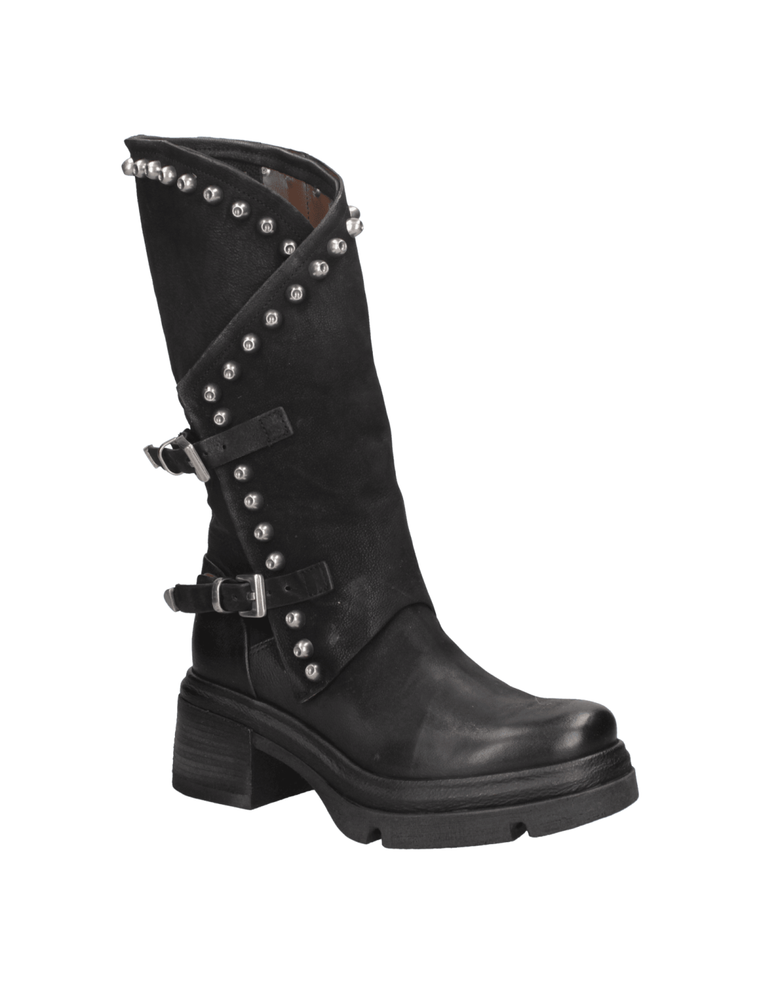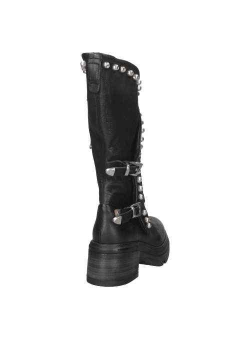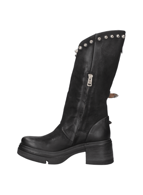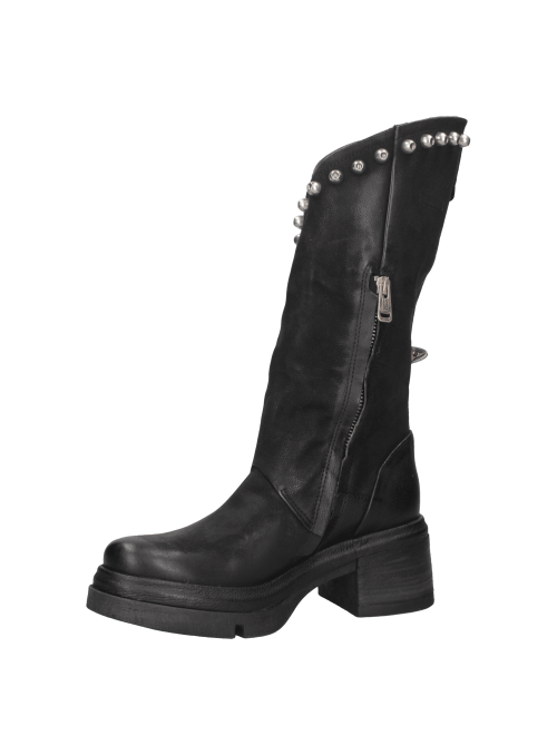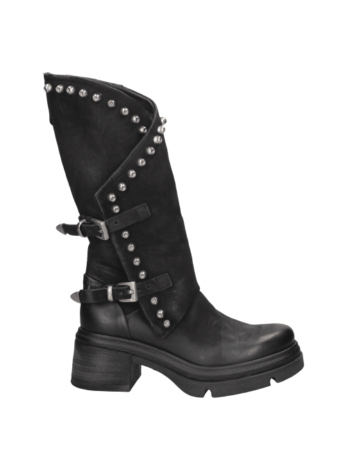 La bota de mujer de AS98 J879 es el complemento ideal para quienes desean un calzado con carácter y estilo distintivo. Confeccionada en cuero de alta calidad, su acabado envejecido le confiere un toque auténtico, mientras que la silueta de corte medio-alto garantiza un ajuste cómodo. Su diseño audaz, adornado con tachuelas metálicas y hebillas ajustables, aporta un aire motero y vanguardista. La suela gruesa y el tacón de bloque de 6.5 cm aseguran estabilidad y confort, convirtiéndola en la opción perfecta para un look casual con jeans o una propuesta bohemia con vestido fluido.