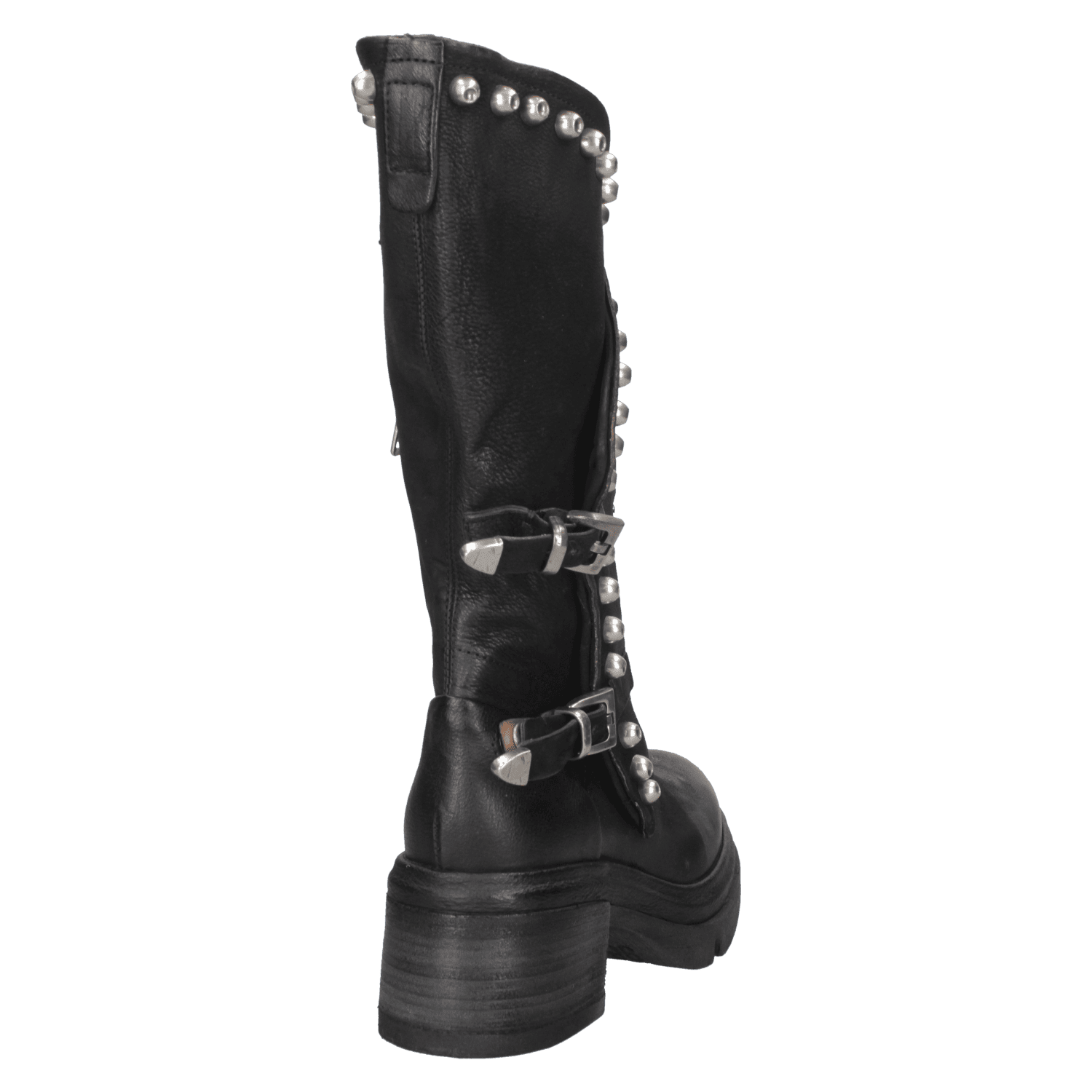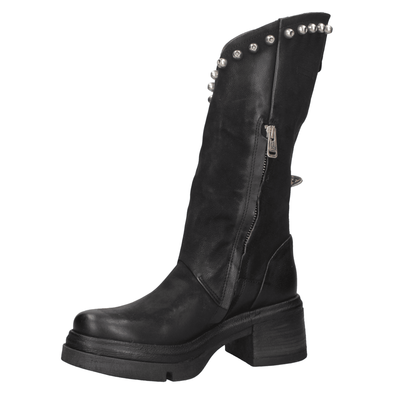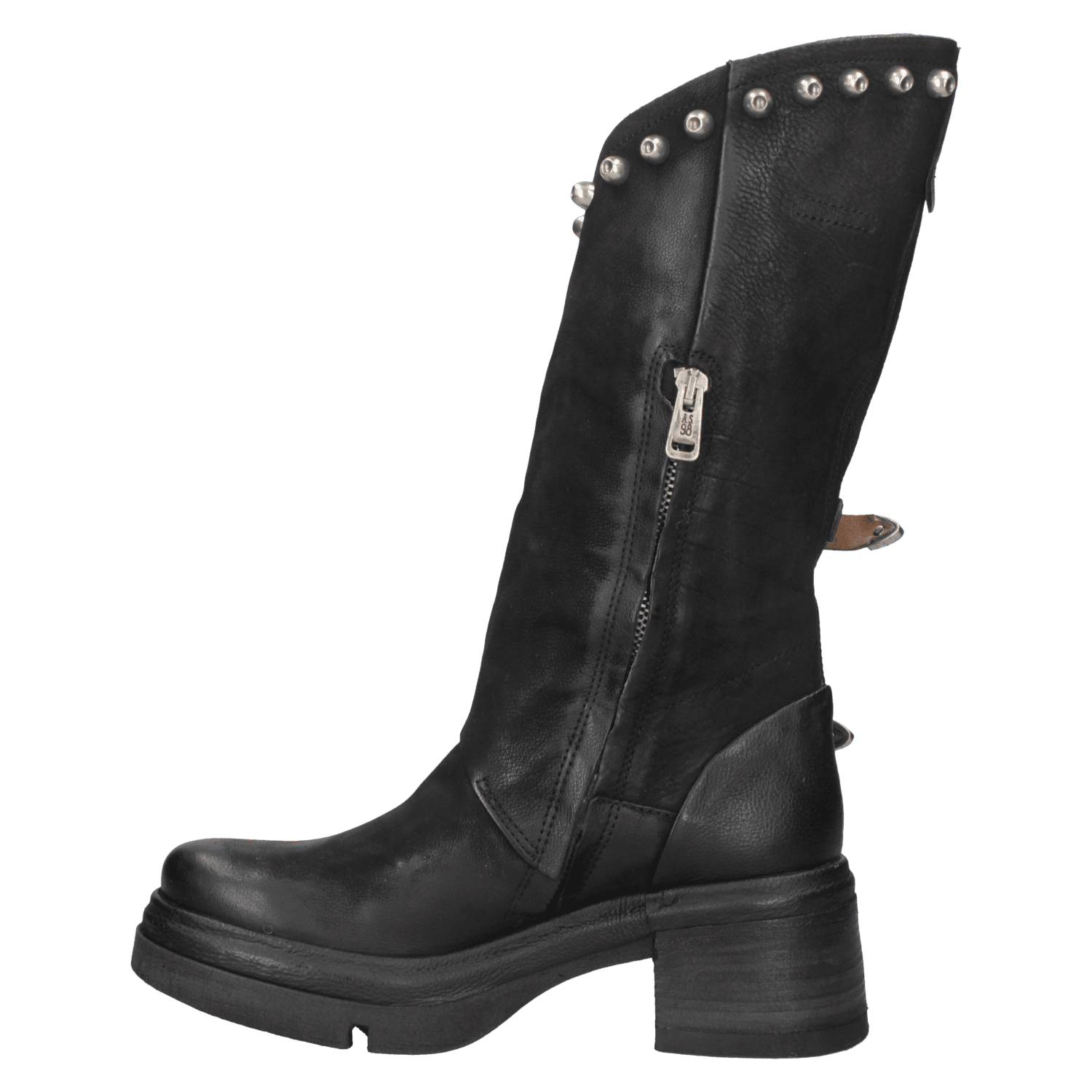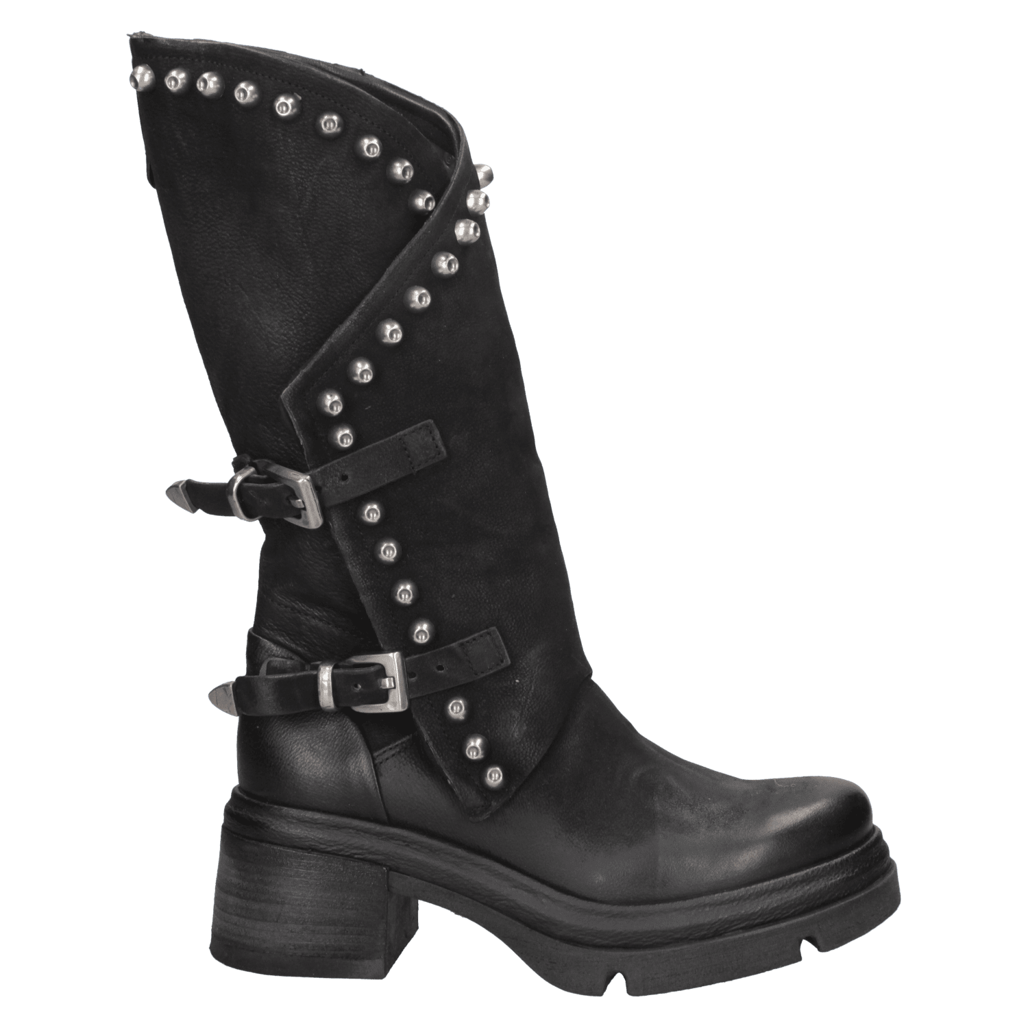 La bota de mujer de AS98 J879 es el complemento ideal para quienes desean un calzado con carácter y estilo distintivo. Confeccionada en cuero de alta calidad, su acabado envejecido le confiere un toque auténtico, mientras que la silueta de corte medio-alto garantiza un ajuste cómodo. Su diseño audaz, adornado con tachuelas metálicas y hebillas ajustables, aporta un aire motero y vanguardista. La suela gruesa y el tacón de bloque de 6.5 cm aseguran estabilidad y confort, convirtiéndola en la opción perfecta para un look casual con jeans o una propuesta bohemia con vestido fluido.