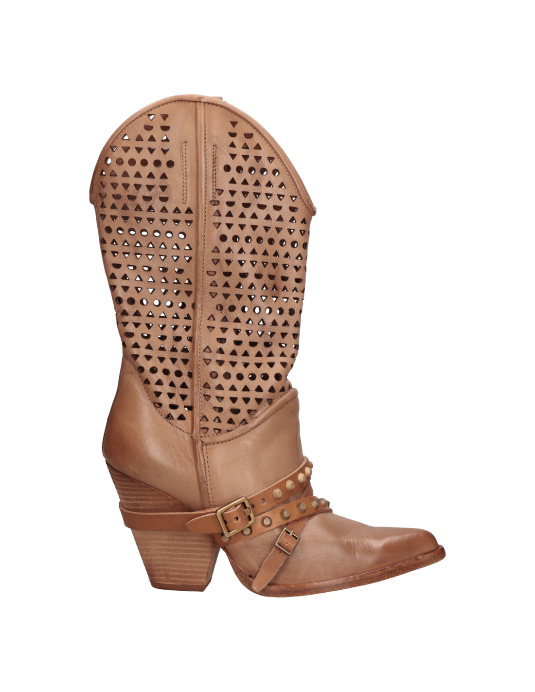 Elegante bota de cuero para mujer en color camel, con punta puntiaguda y taco bloque de 9.7 cm. El acabado liso y la construcción en cuero, por dentro y por fuera, aportan una silueta depurada y un tacto de calidad.
