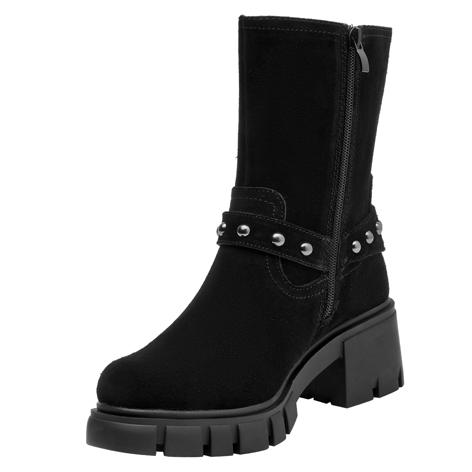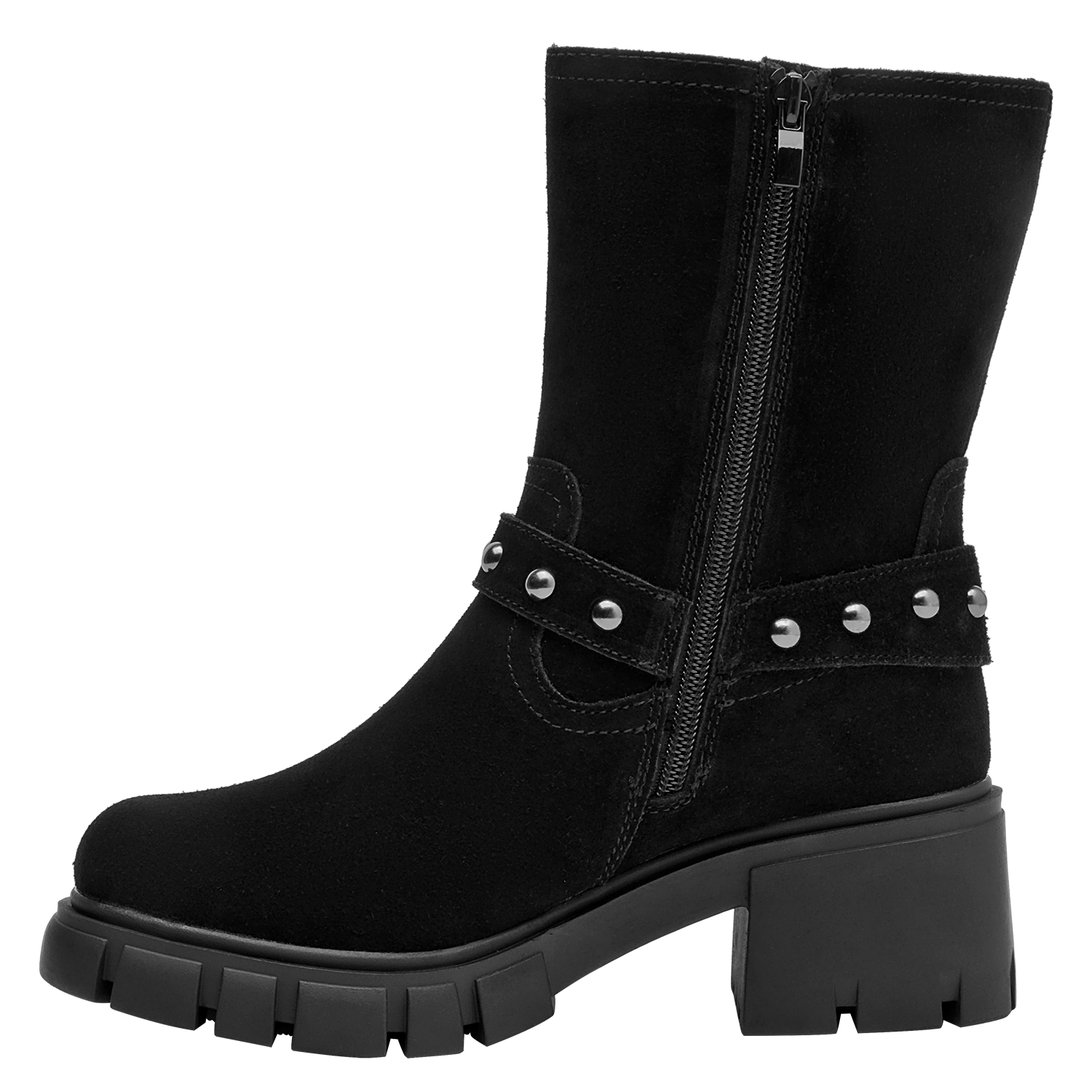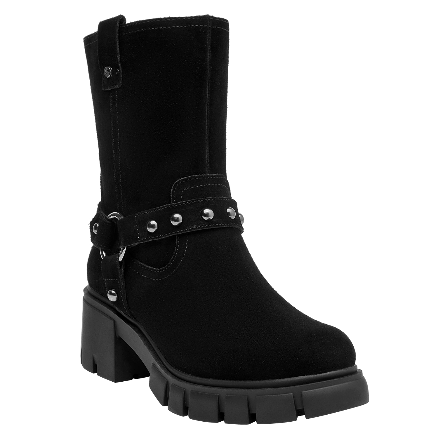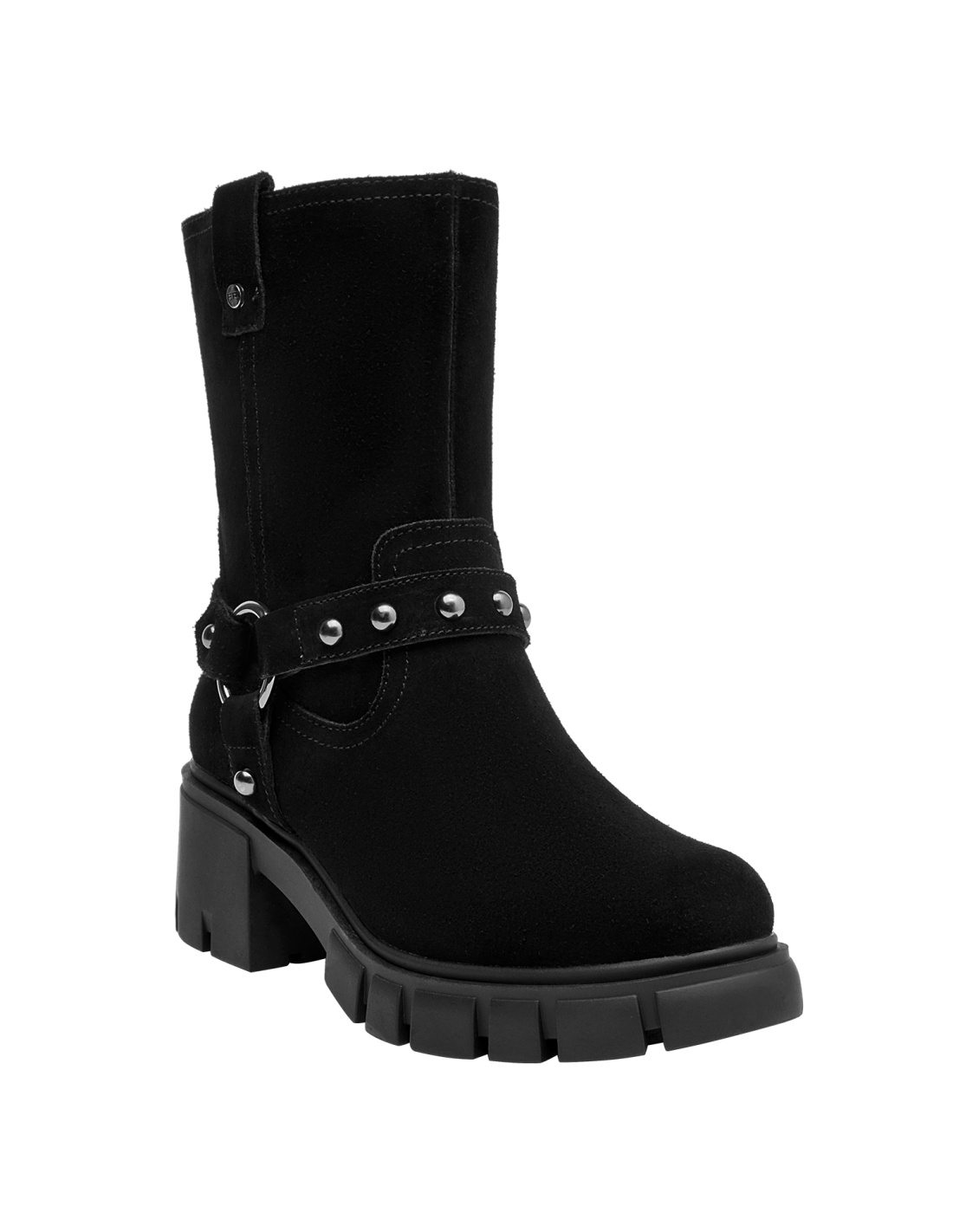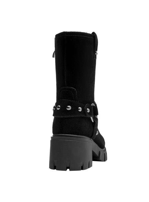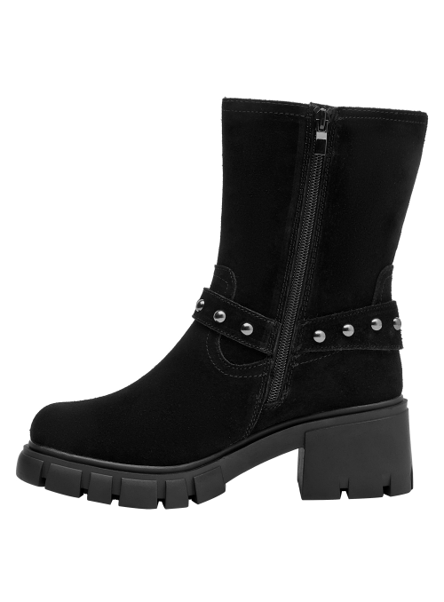 Botín de cuero negro para mujer que destaca por su silueta clásica y líneas limpias. Presenta punta redonda y taco bloque de 6 cm que aporta estabilidad visual, con interior de forro sintético/textil para una sensación agradable. El acabado en negro facilita combinarlo y lo vuelve un básico para diferentes ocasiones, manteniendo una estética pulida y atemporal.