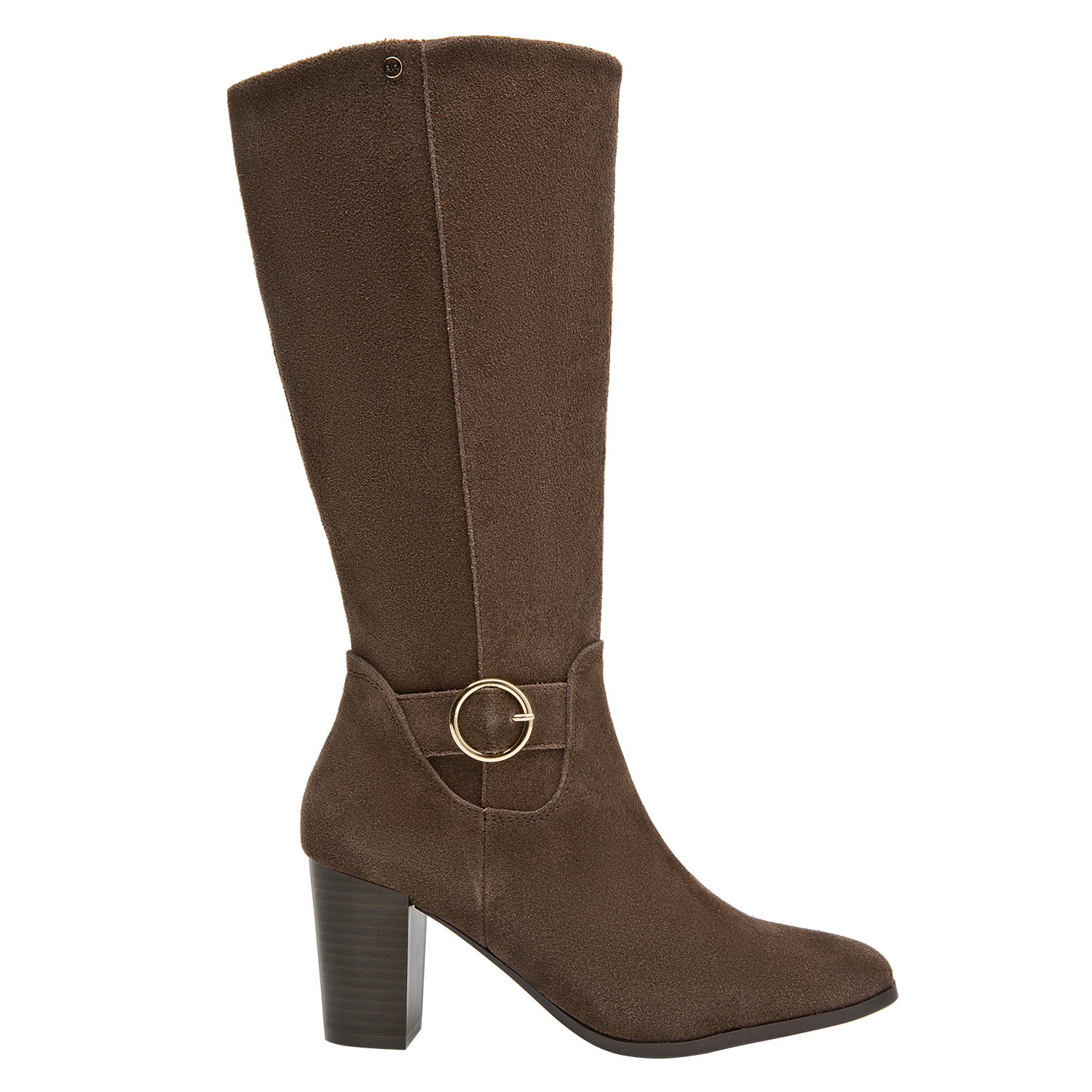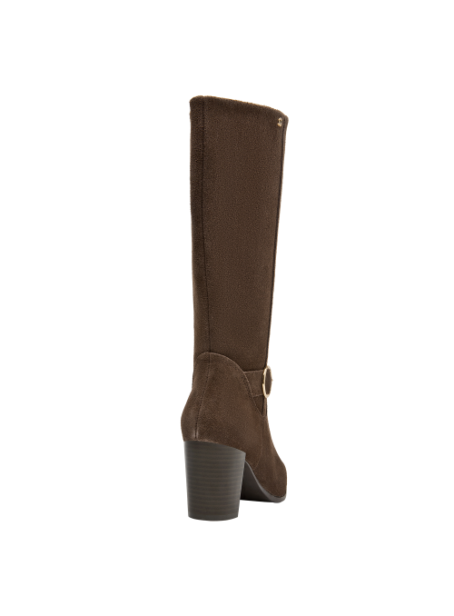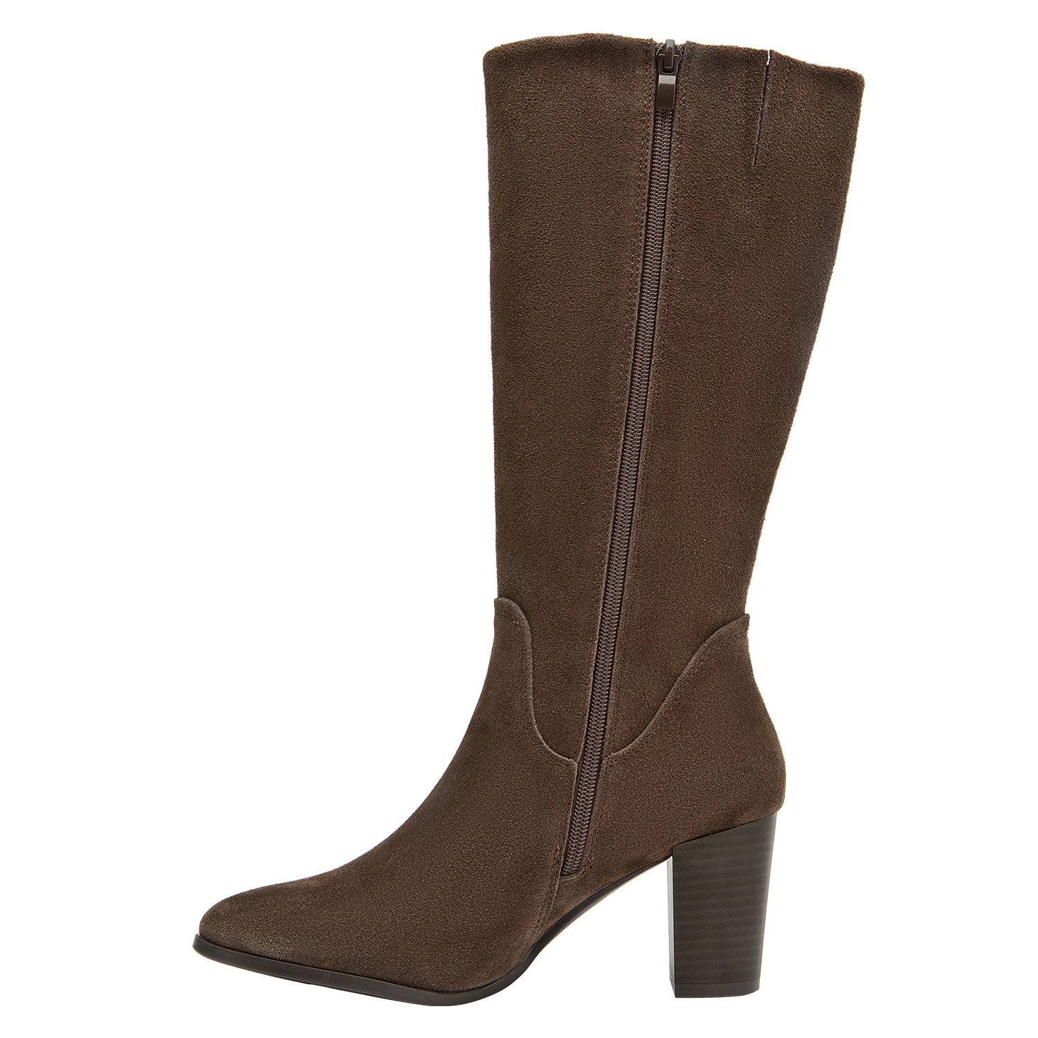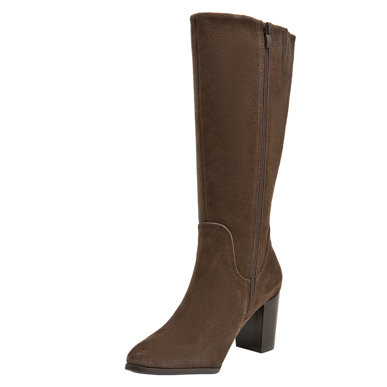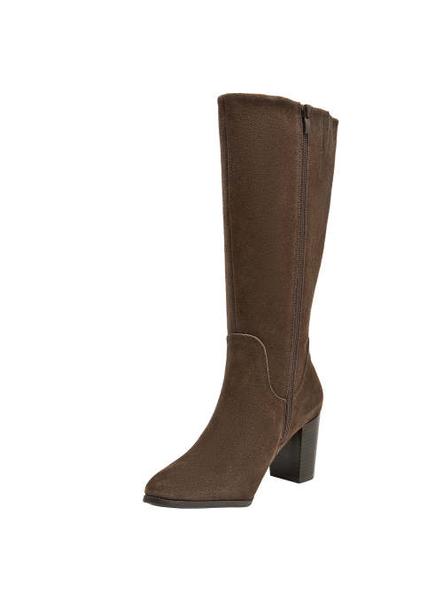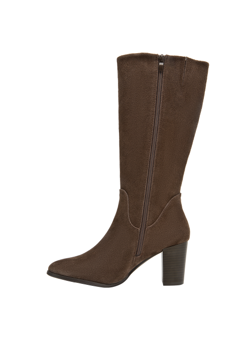 Botín de cuero para mujer de estilo urbano en color moro, con punta puntiaguda y taco bloque de 7 cm. El exterior de cuero presenta un acabado sobrio con costuras definidas, mientras el forro sintético/textil acompaña la estructura interior. La silueta afinada y el tacón estable elevan tu look en clave contemporánea, apto para transiciones del día a la noche.