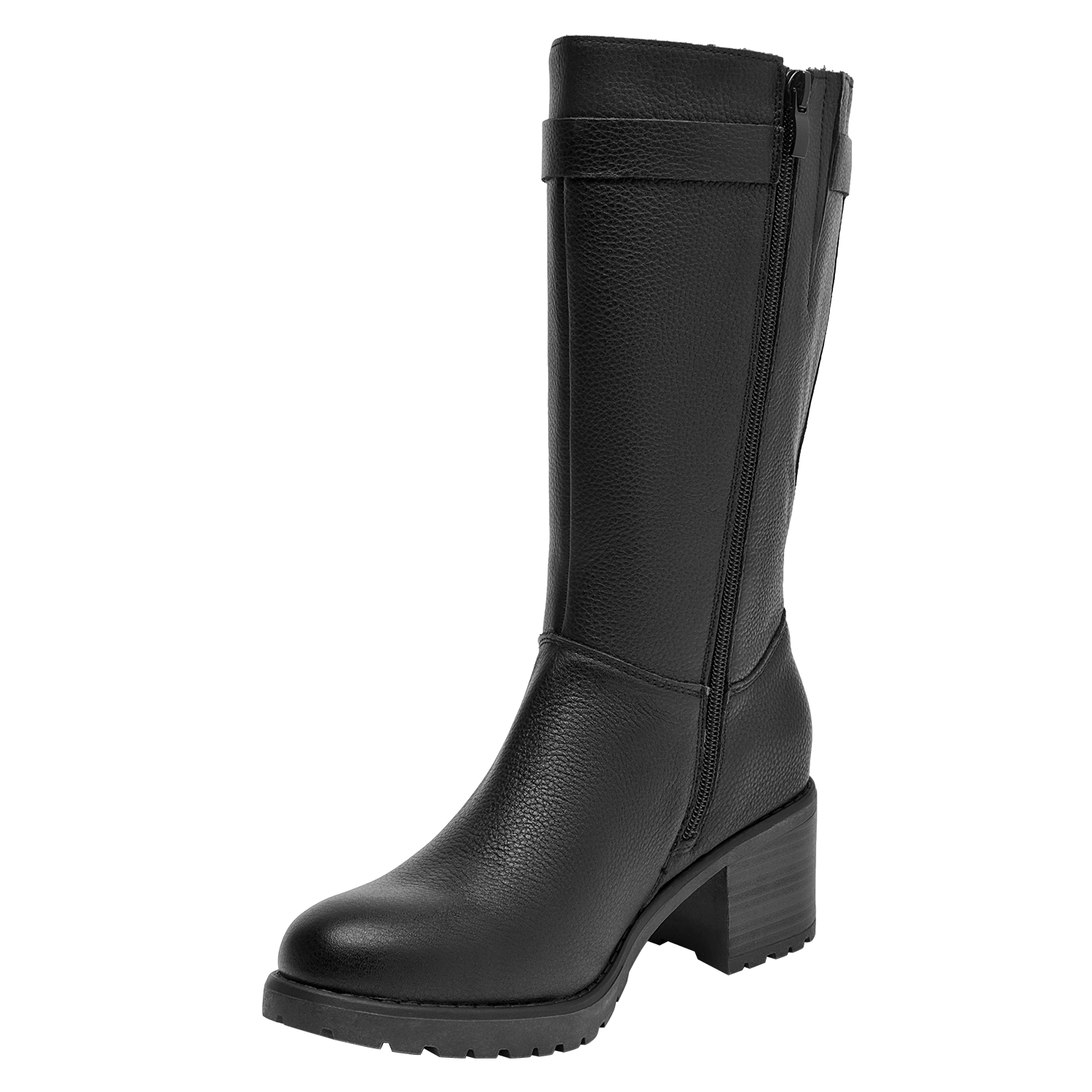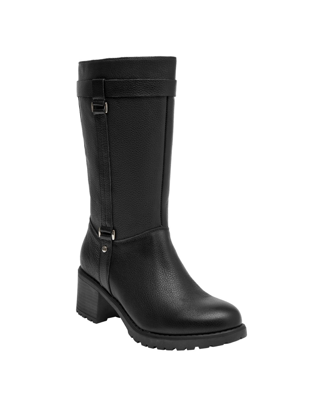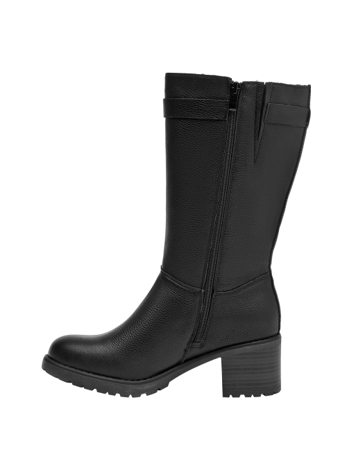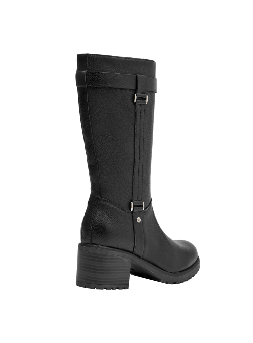 Botín de taco bloque para mujer en cuero negro, con punta redonda y altura de 6 cm. El acabado liso y las costuras discretas realzan un diseño limpio y versátil, mientras el forro sintético/textil brinda confort al interior. Un básico moderno que equilibra estabilidad y estilo para el día a día.