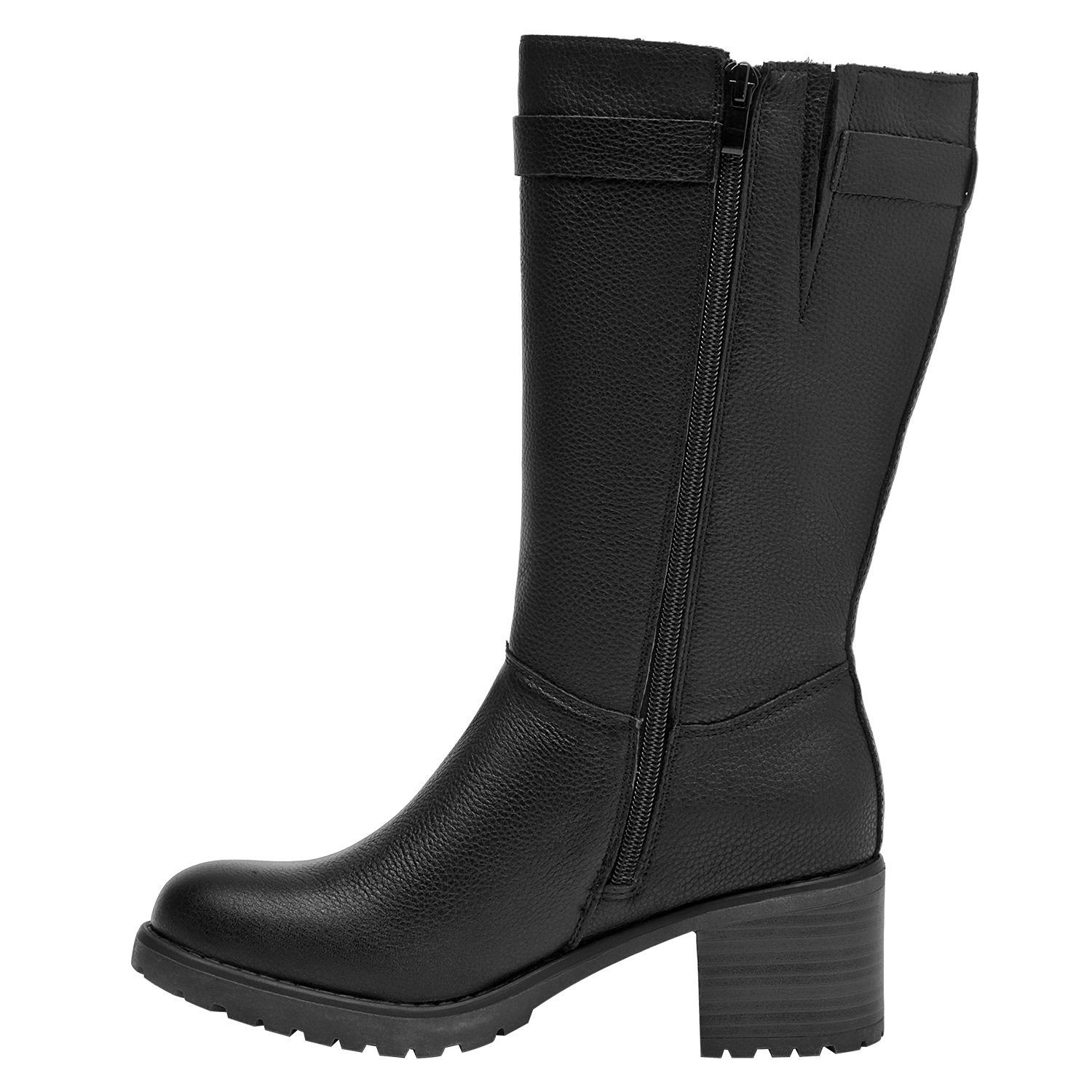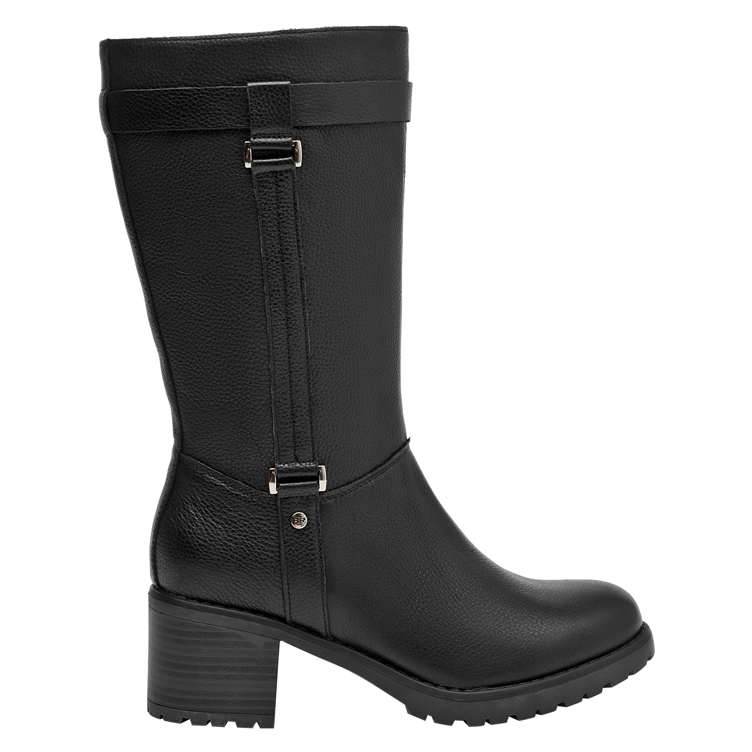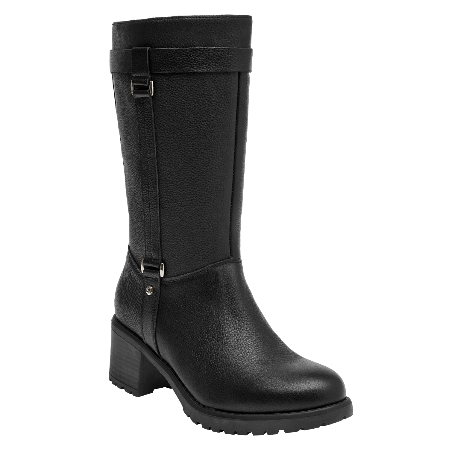 Botín de taco bloque para mujer en cuero negro, con punta redonda y altura de 6 cm. El acabado liso y las costuras discretas realzan un diseño limpio y versátil, mientras el forro sintético/textil brinda confort al interior. Un básico moderno que equilibra estabilidad y estilo para el día a día.