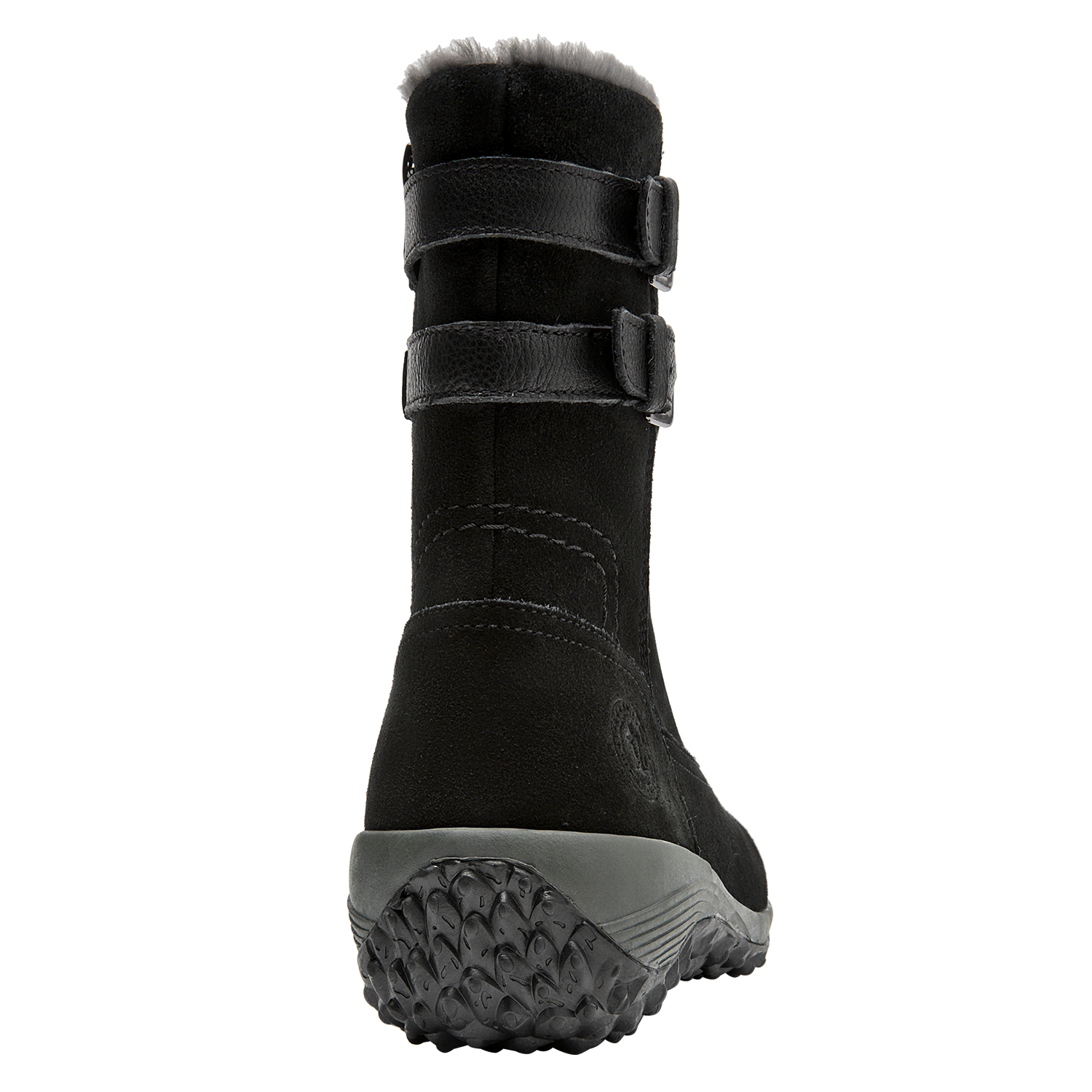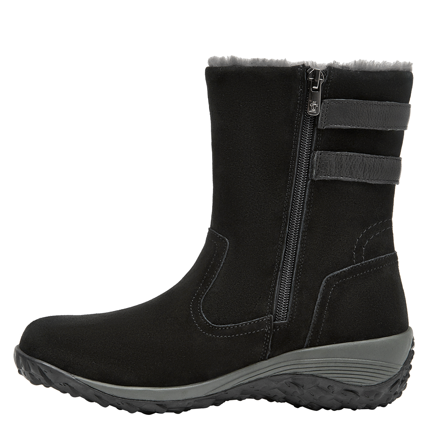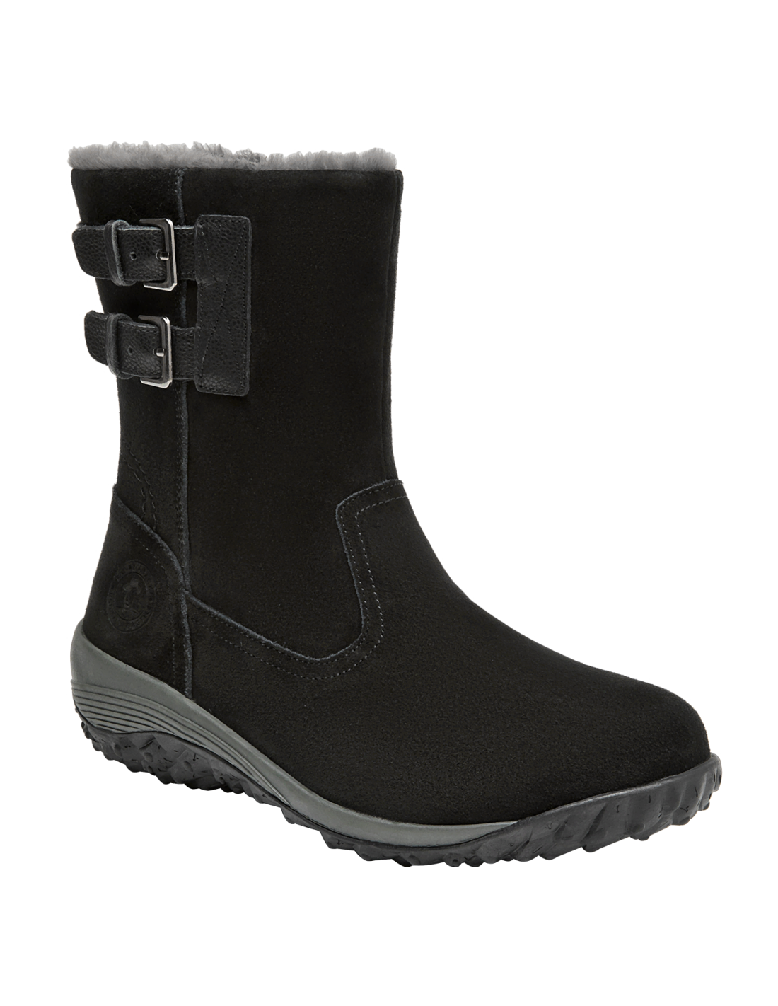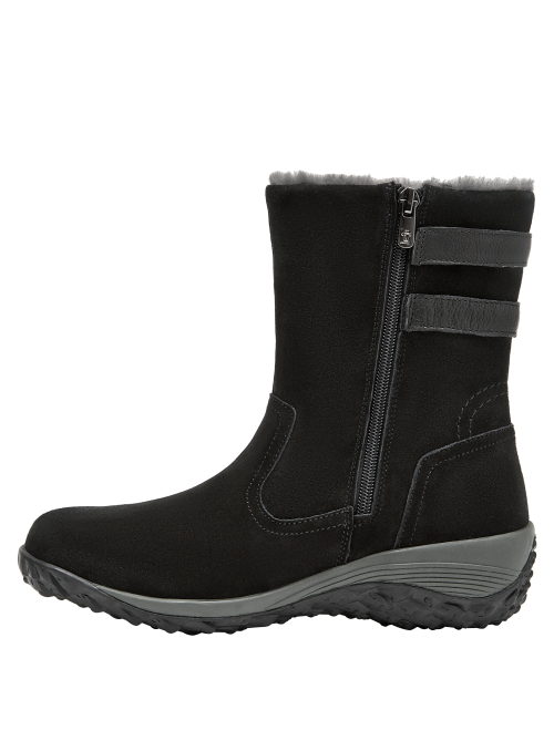Botín urbano de mujer en cuero negro, con punta redonda y suela plana de 5 cm que aporta estabilidad y un sutil realce. Su forro mixto textil/pelo entrega abrigo agradable en días frescos, mientras el acabado limpio y minimalista facilita combinarlo con distintos estilos. La construcción en cuero aporta durabilidad y un look pulido, ideal para la rotación diaria sin perder comodidad.