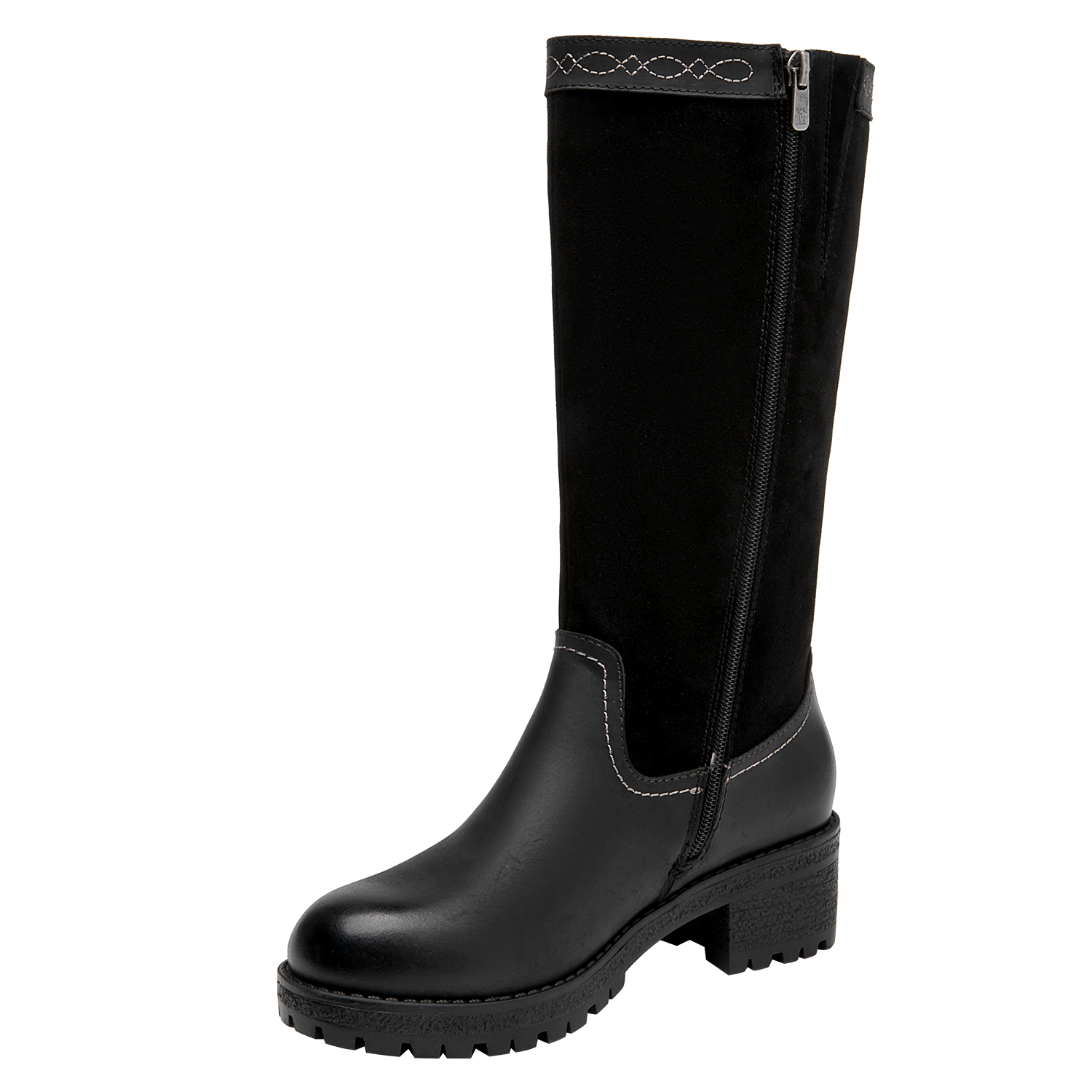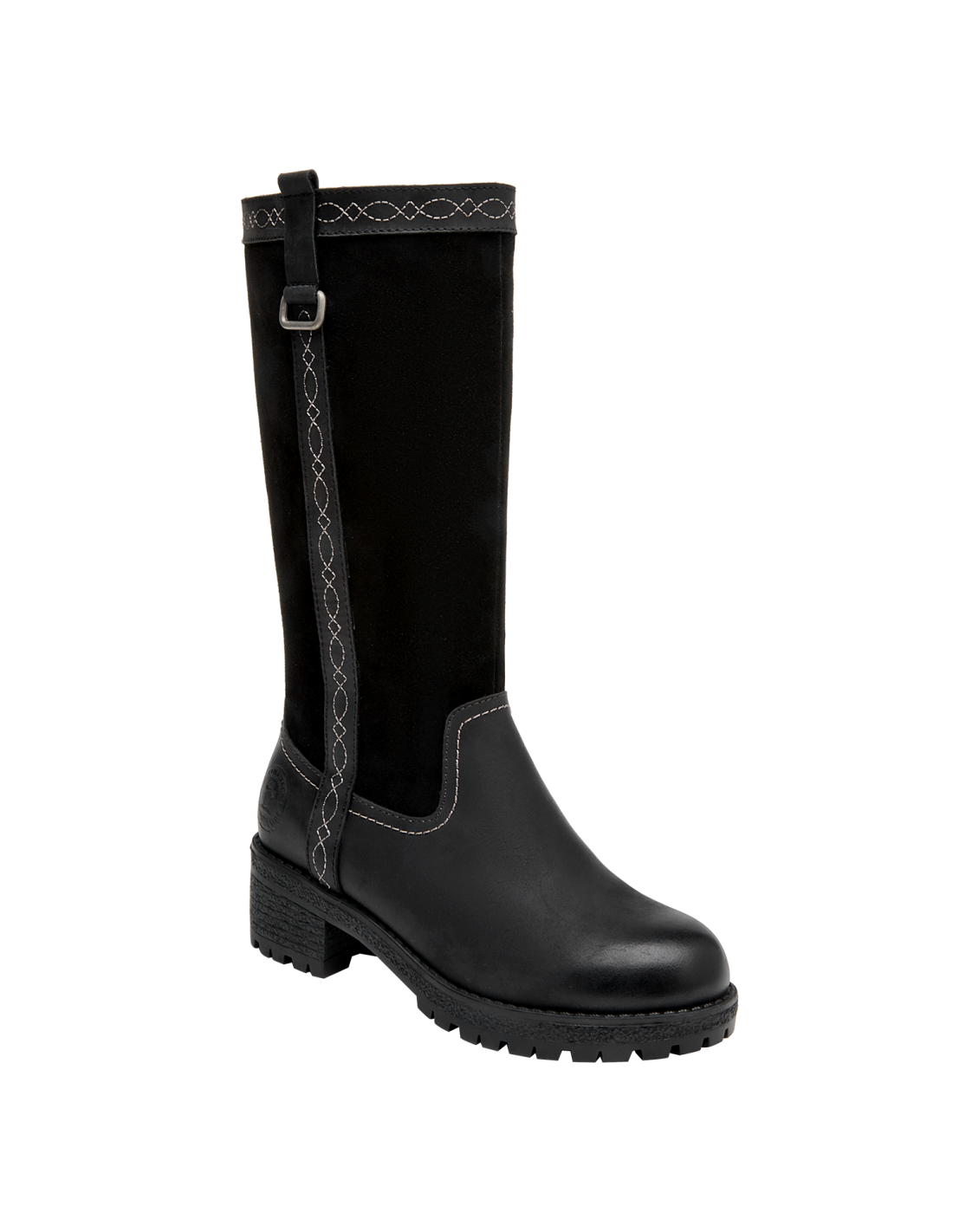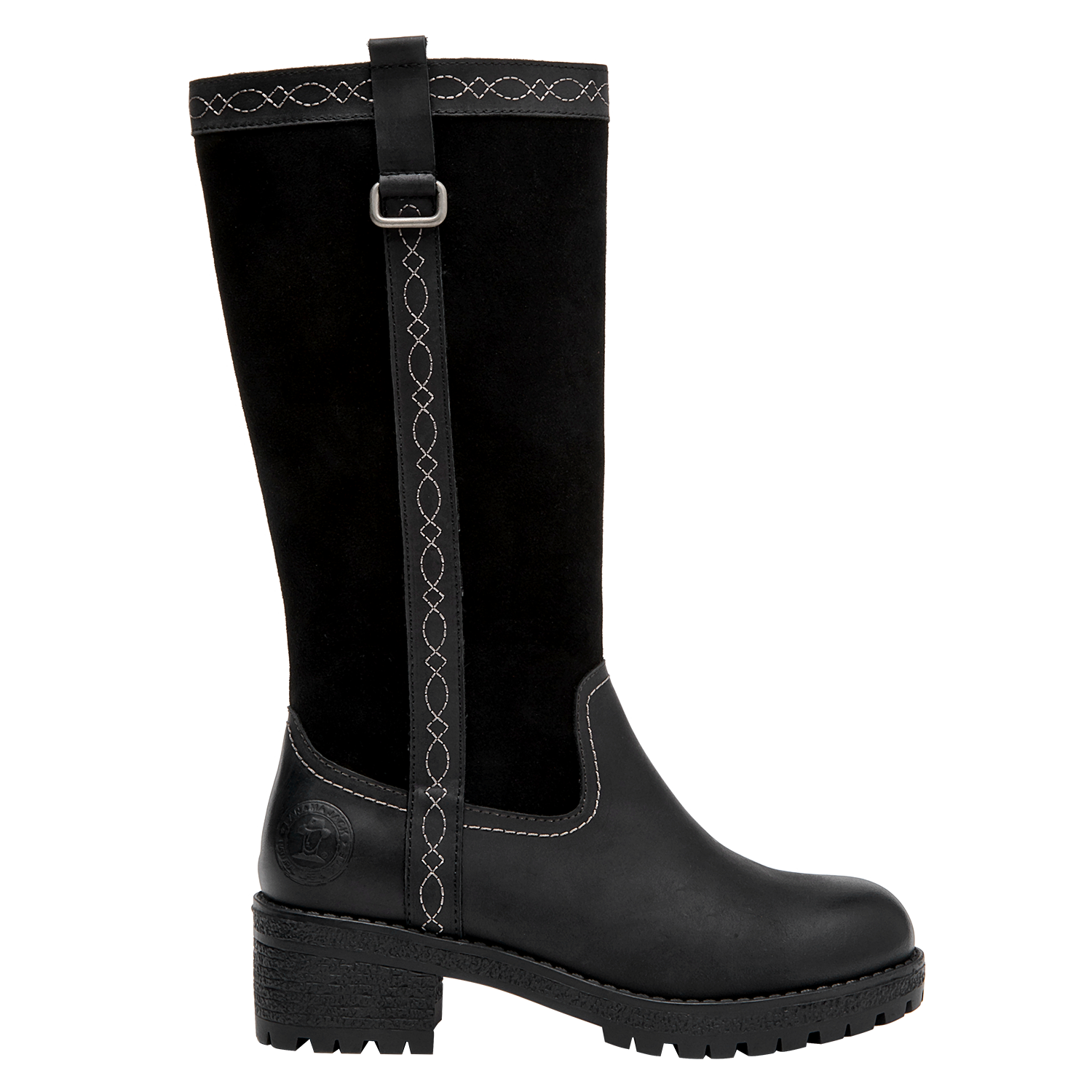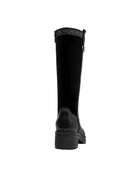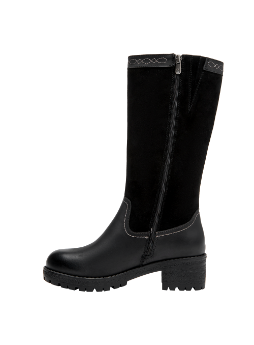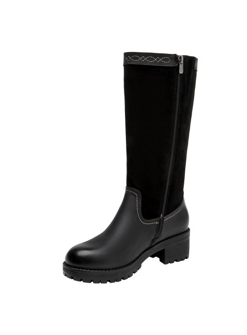 Botín de cuero para mujer en color negro, de diseño versátil y urbano. Presenta punta redonda para un look clásico y cómodo, taco bloque de 5 cm que aporta estabilidad y altura equilibrada, y forro mixto textil/PU que favorece una sensación agradable al uso. Su acabado en cuero realza la apariencia limpia y fácil de combinar en distintas ocasiones.