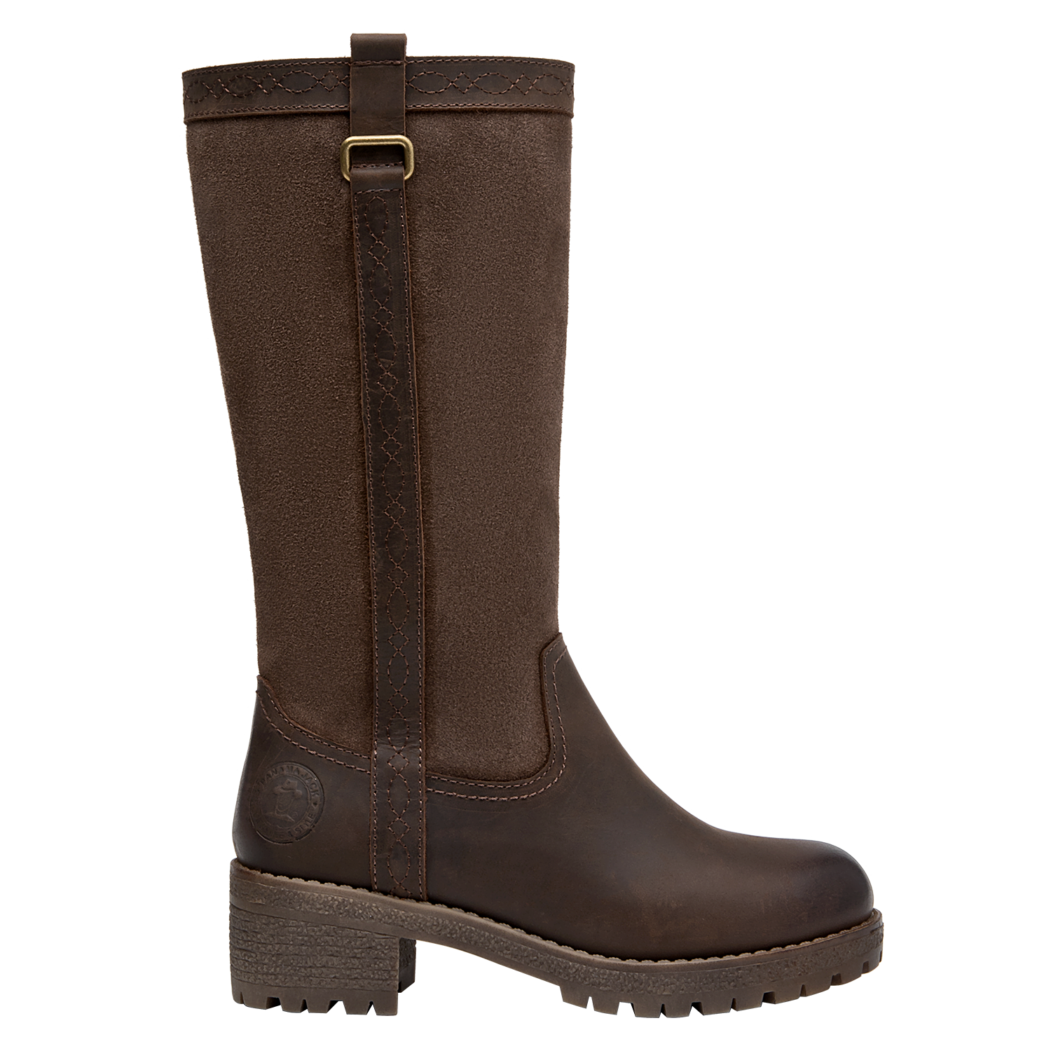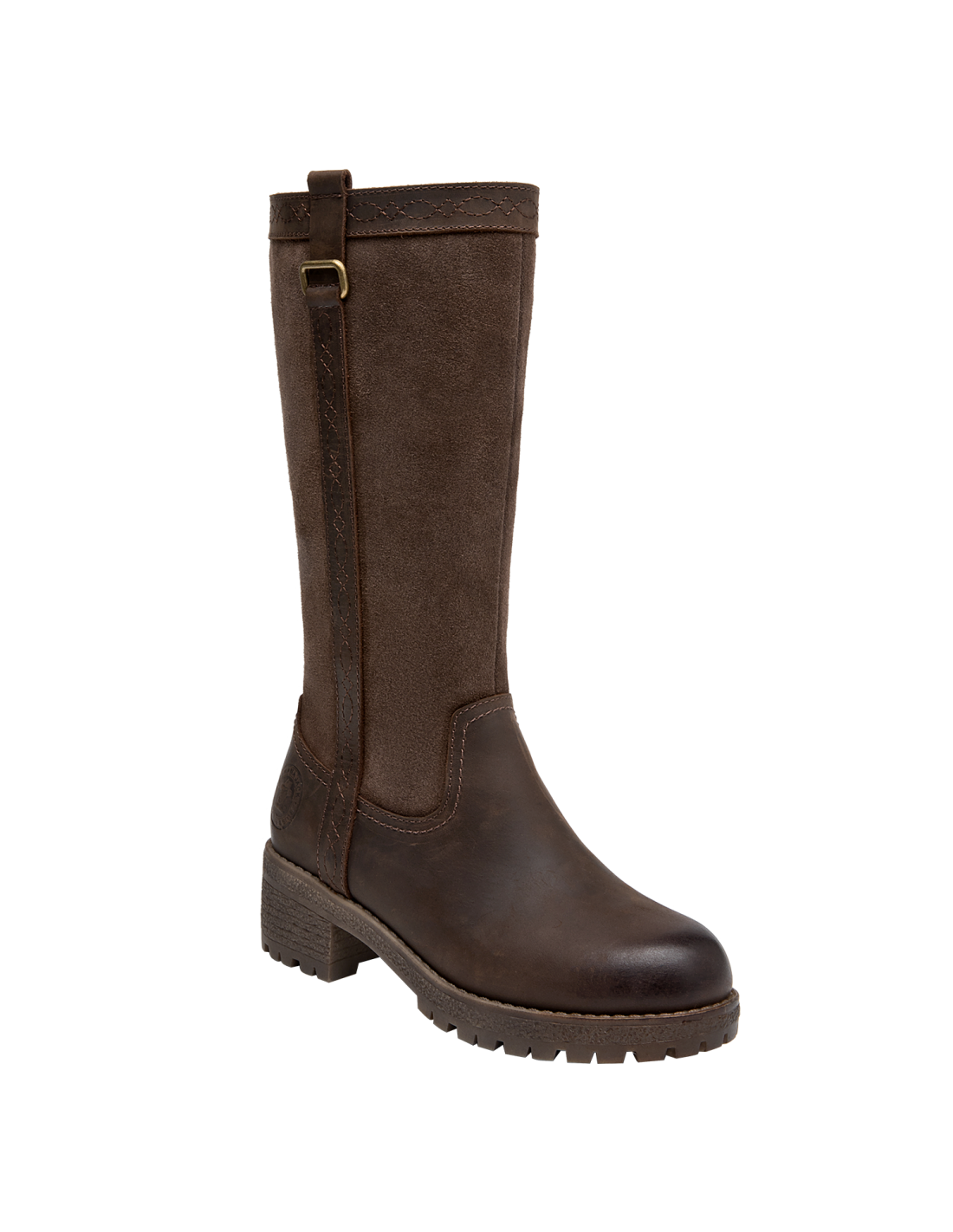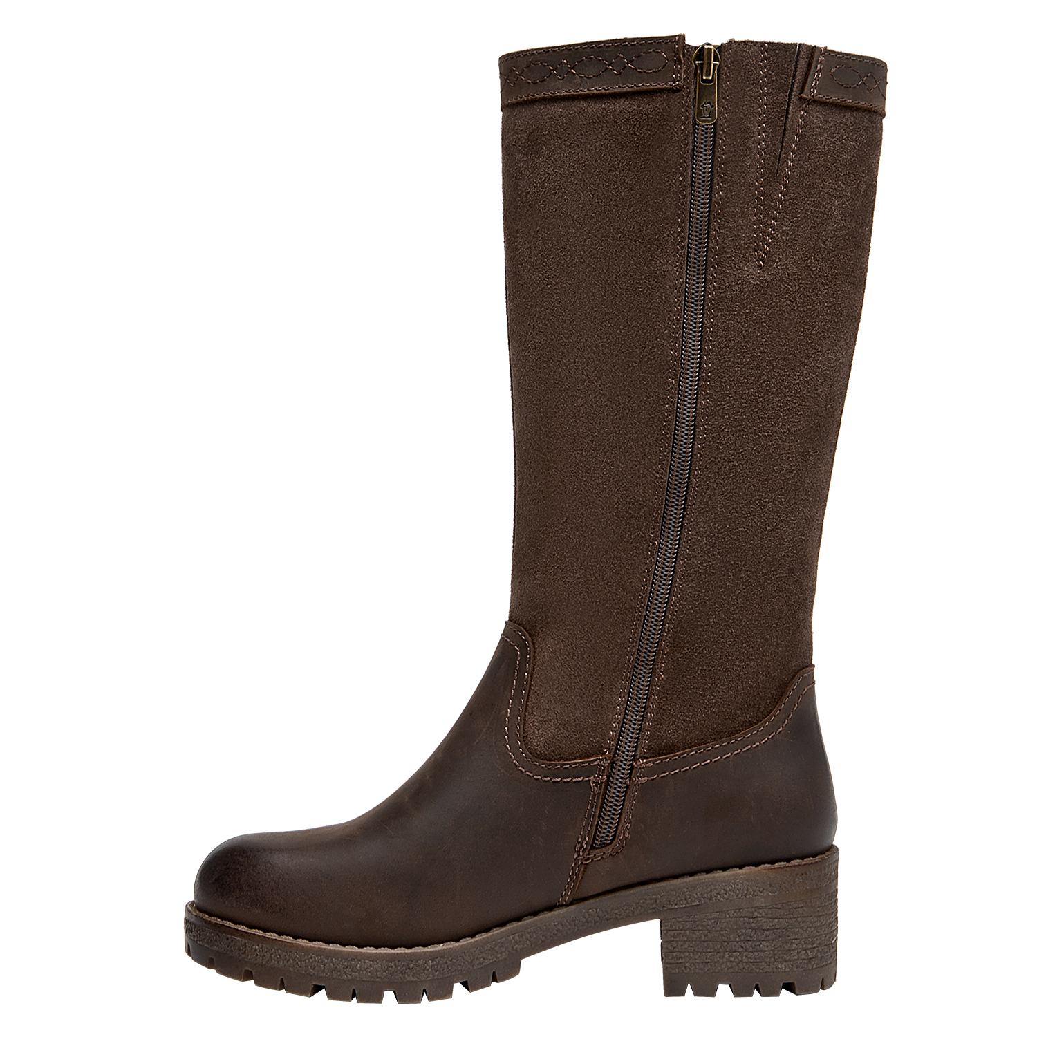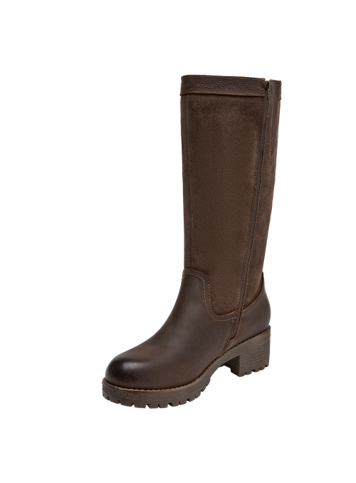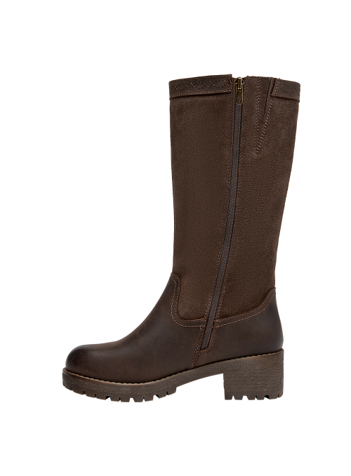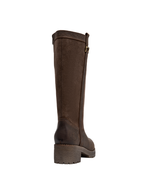 Botín urbano de cuero para mujer en color café, con punta redonda y taco bloque de 5 cm que aporta estabilidad. El acabado liso resalta costuras prolijas y su forro textil/PU suma confort. La suela con relieve discreto favorece el uso diario y su silueta limpia se adapta a distintos estilos, desde jornadas laborales hasta salidas casuales.