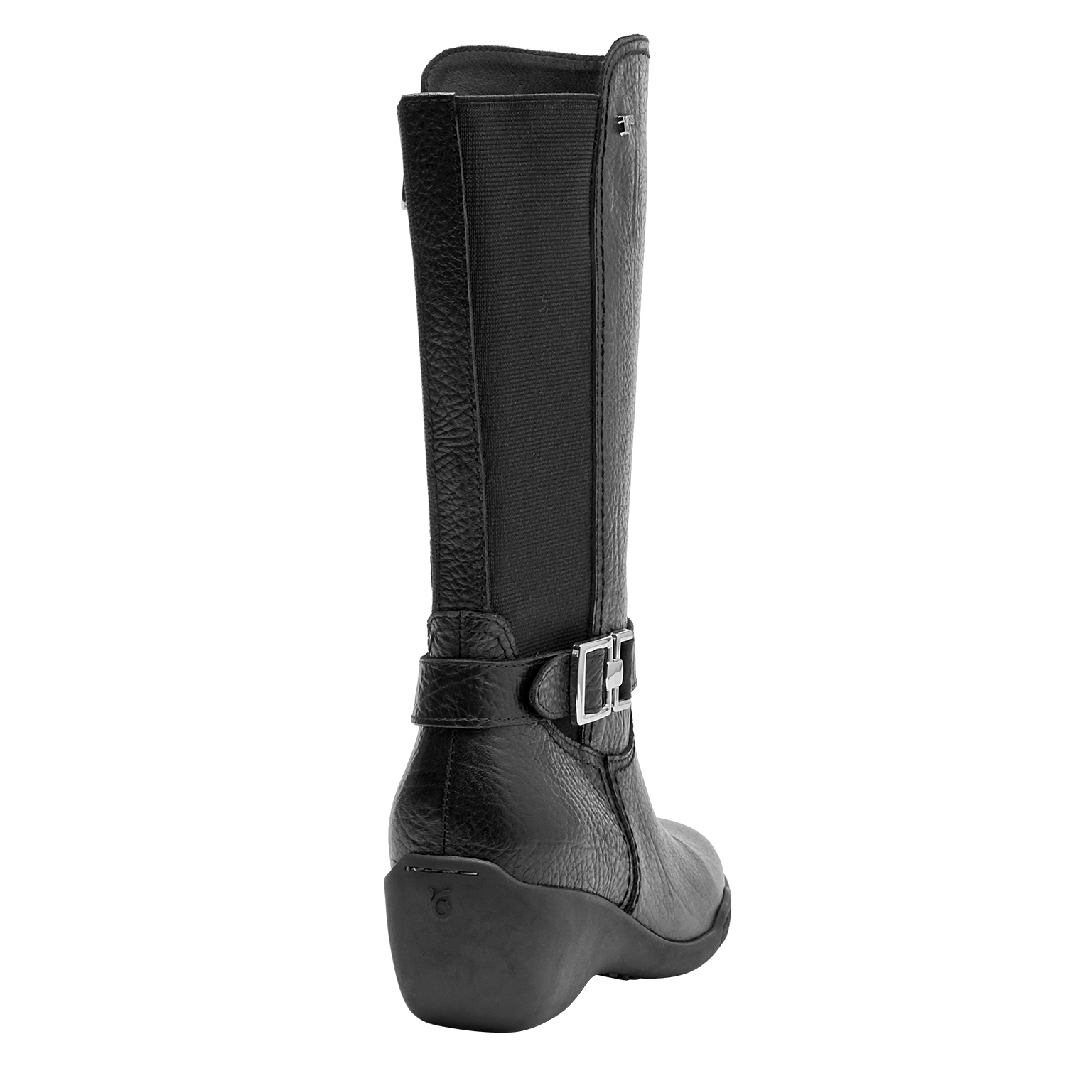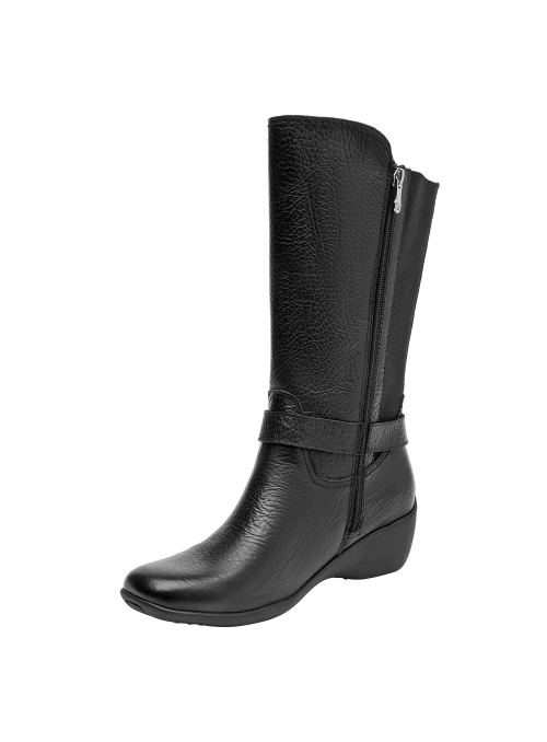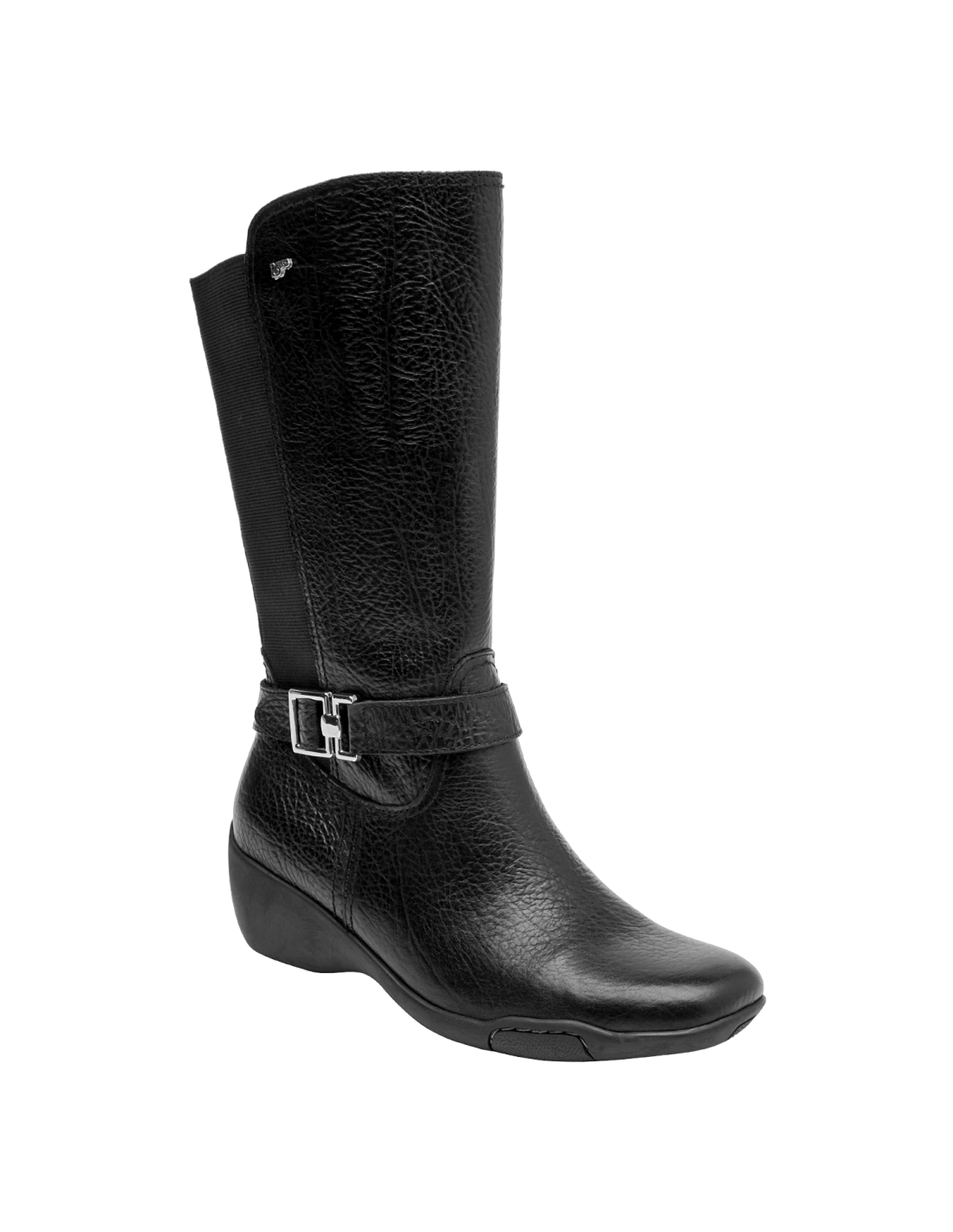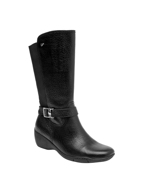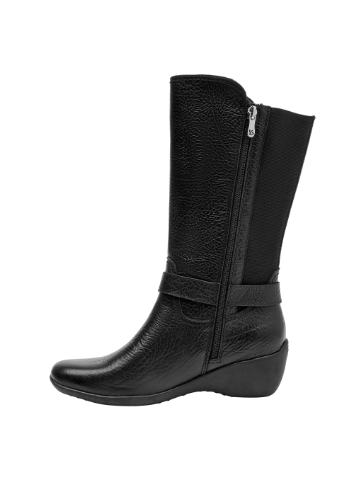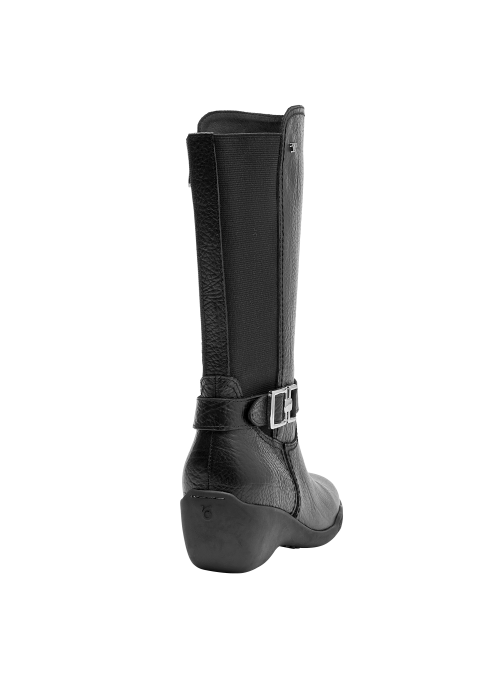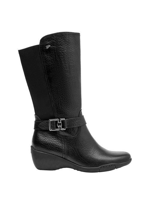Bota urbana de cuero para mujer con diseño de cuña en color negro. Su punta redonda y el taco cuña de 4 cm aportan una elevación sutil, mientras el forro de malla brinda una sensación ligera en el uso diario. De líneas limpias y acabado sobrio, se integra con facilidad a distintas ocasiones, desde la rutina hasta salidas informales.