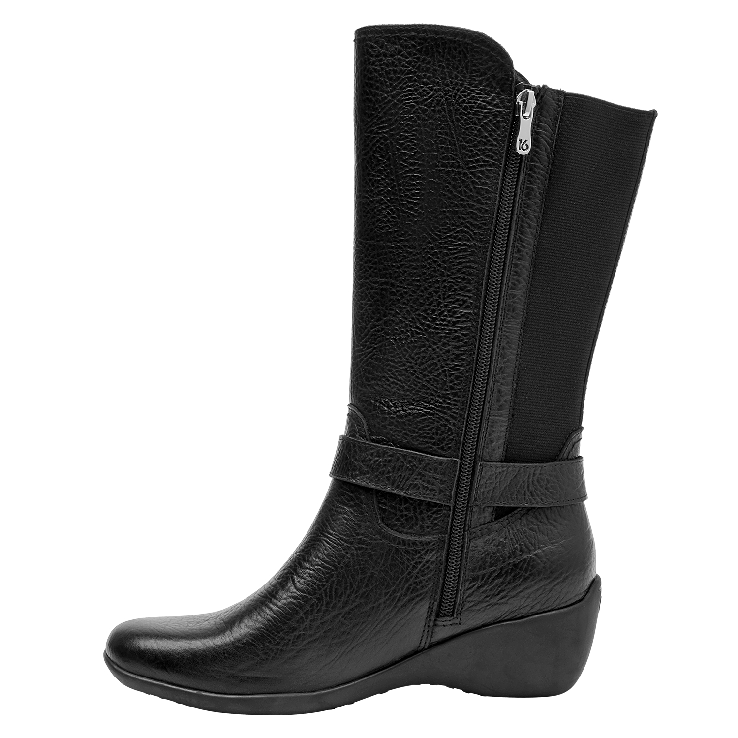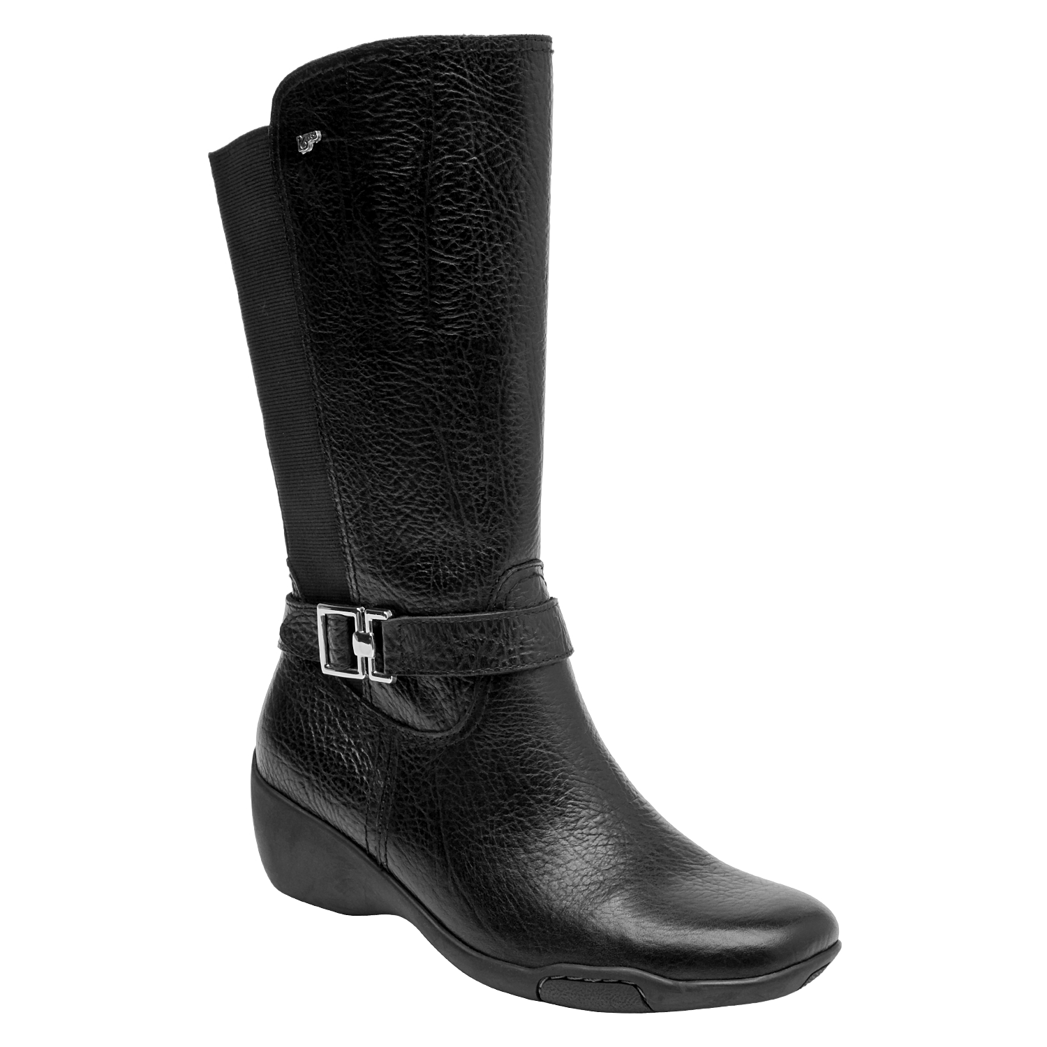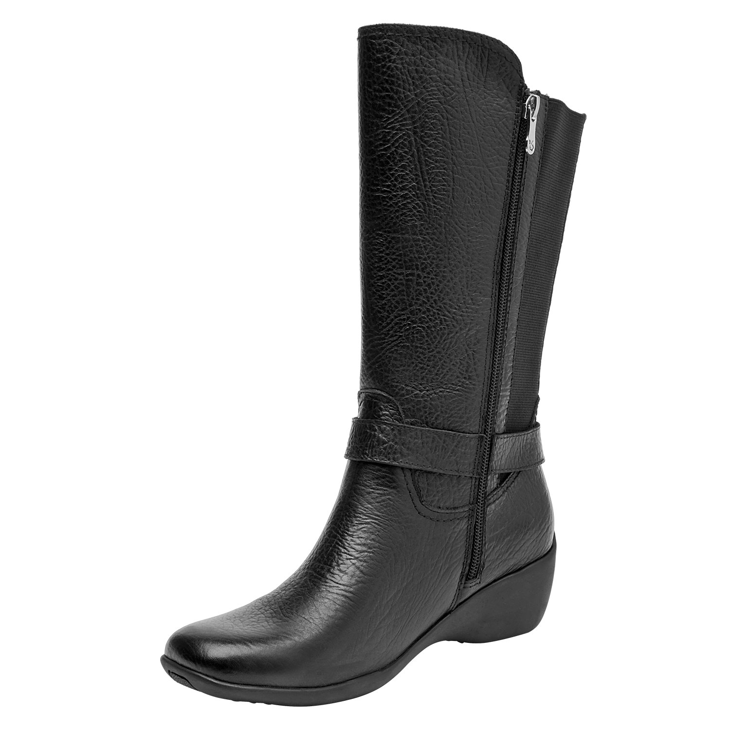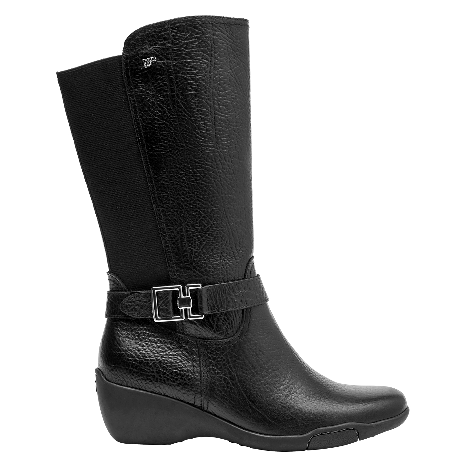 Bota urbana de cuero para mujer con diseño de cuña en color negro. Su punta redonda y el taco cuña de 4 cm aportan una elevación sutil, mientras el forro de malla brinda una sensación ligera en el uso diario. De líneas limpias y acabado sobrio, se integra con facilidad a distintas ocasiones, desde la rutina hasta salidas informales.