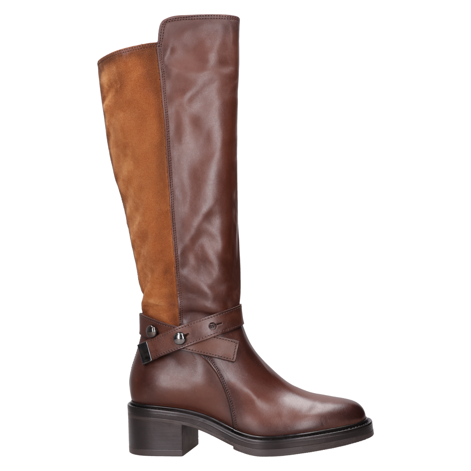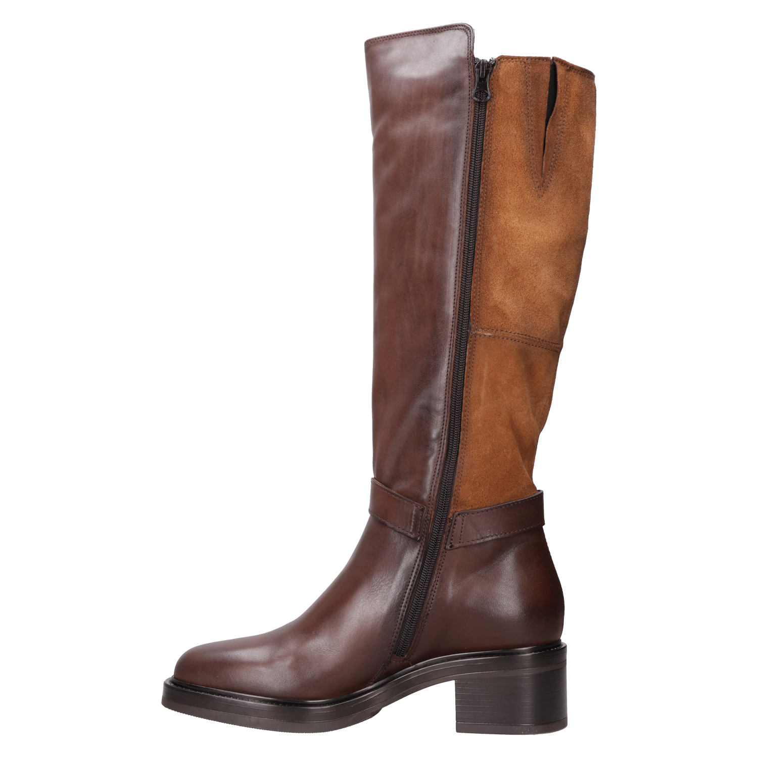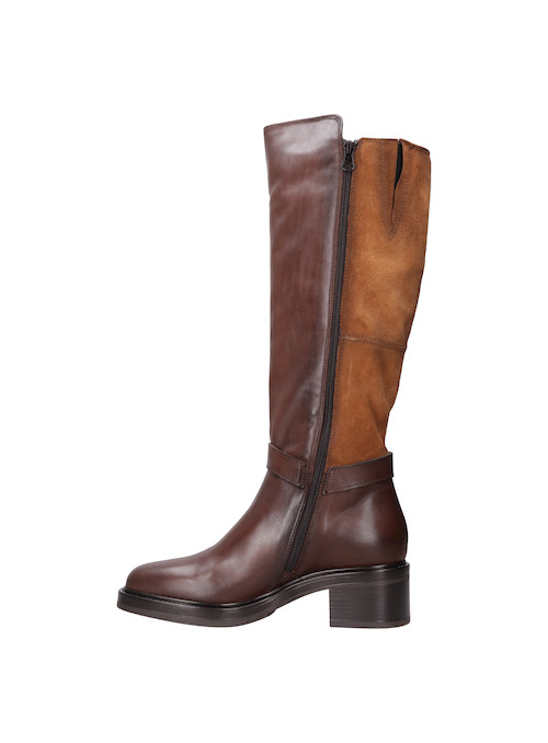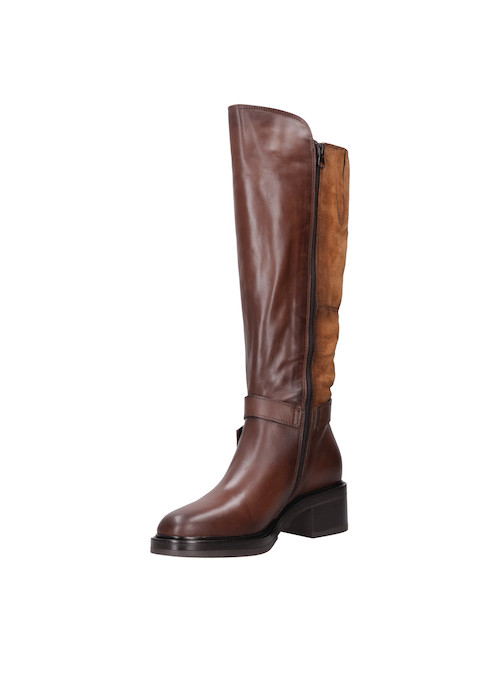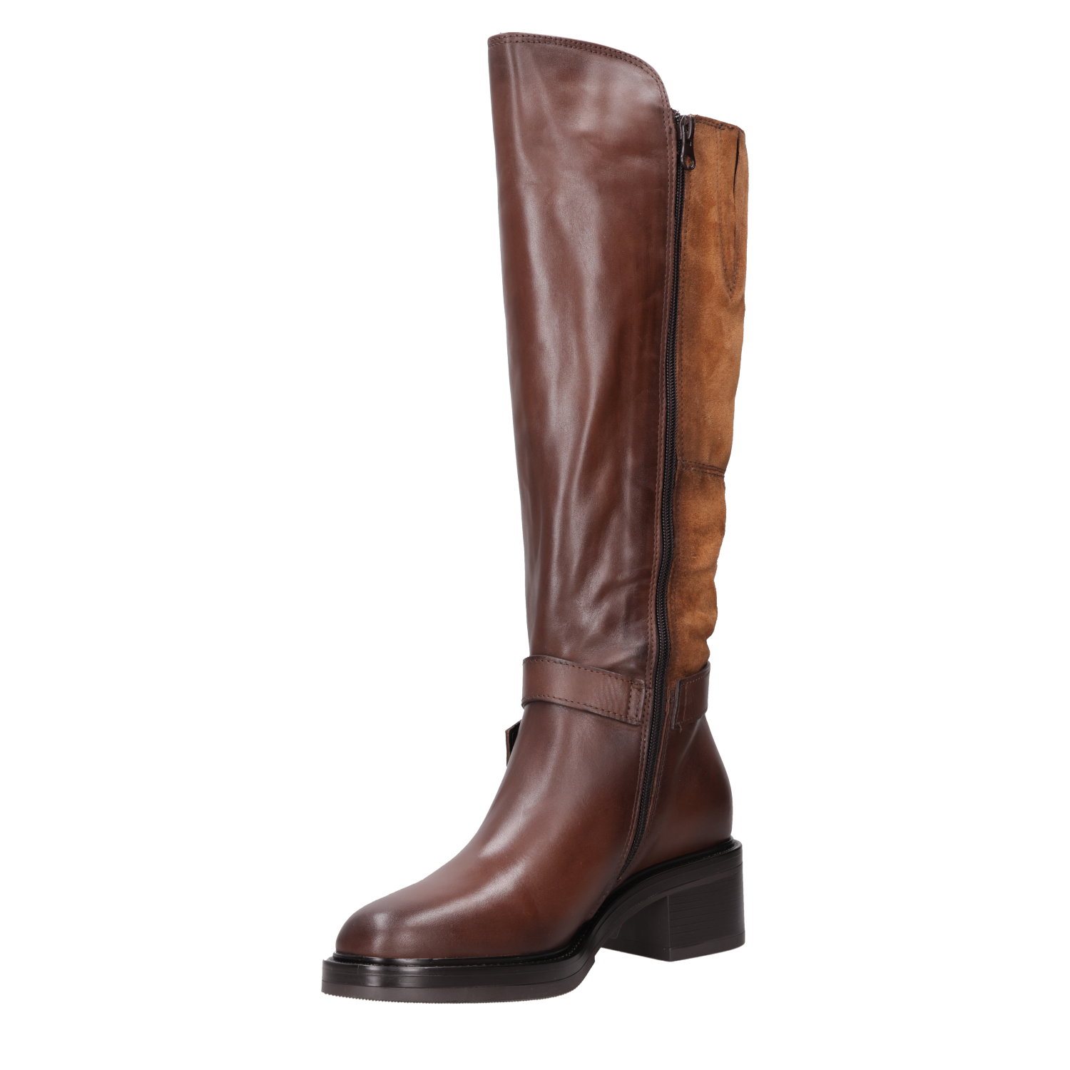 Atrévete con nuestra bota de cuero marrón, un diseño que combina audacia y elegancia. Con un taco bloque de 5 cm y una punta redonda, esta bota de caña alta no solo brinda comodidad, sino que realza cualquier outfit. Su mezcla de texturas resalta el carácter vanguardista que define a Zappa. Perfecta para un look urbano, combínala con un vestido oversized o unos jeans ajustados para un impacto visual instantáneo.