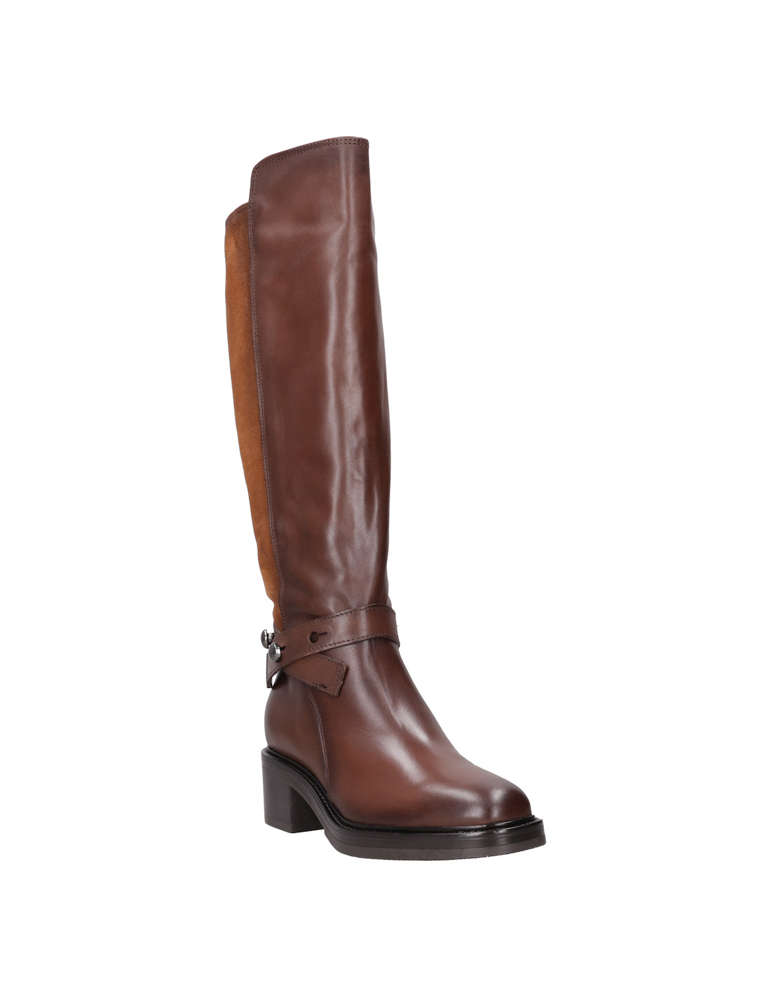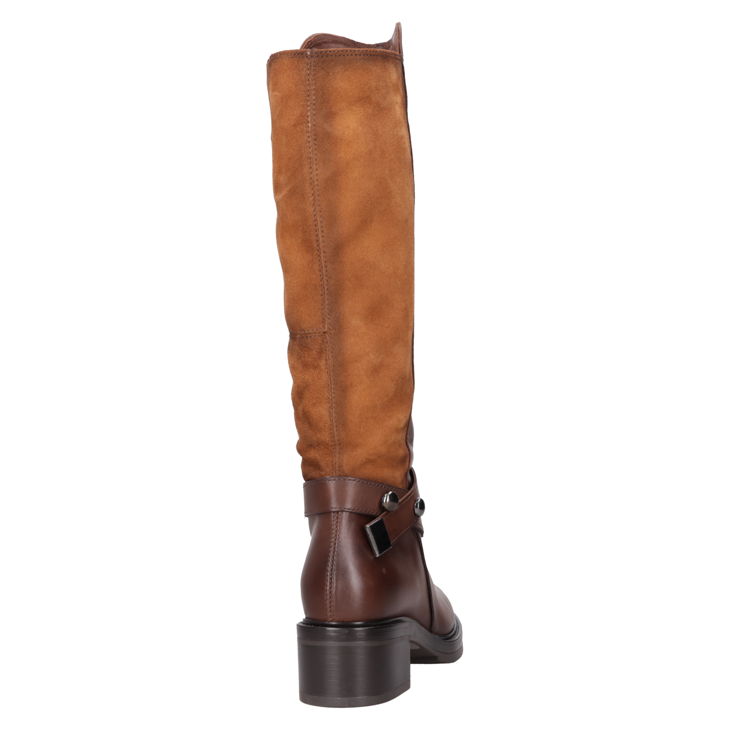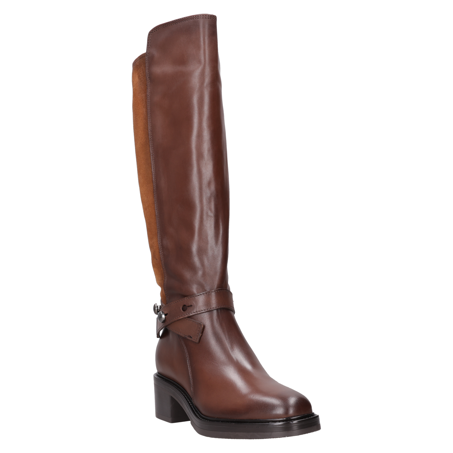 Atrévete con nuestra bota de cuero marrón, un diseño que combina audacia y elegancia. Con un taco bloque de 5 cm y una punta redonda, esta bota de caña alta no solo brinda comodidad, sino que realza cualquier outfit. Su mezcla de texturas resalta el carácter vanguardista que define a Zappa. Perfecta para un look urbano, combínala con un vestido oversized o unos jeans ajustados para un impacto visual instantáneo.