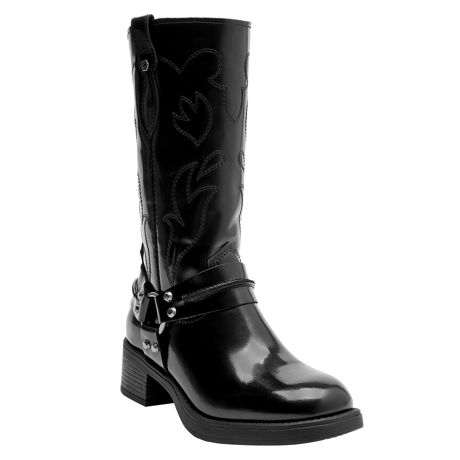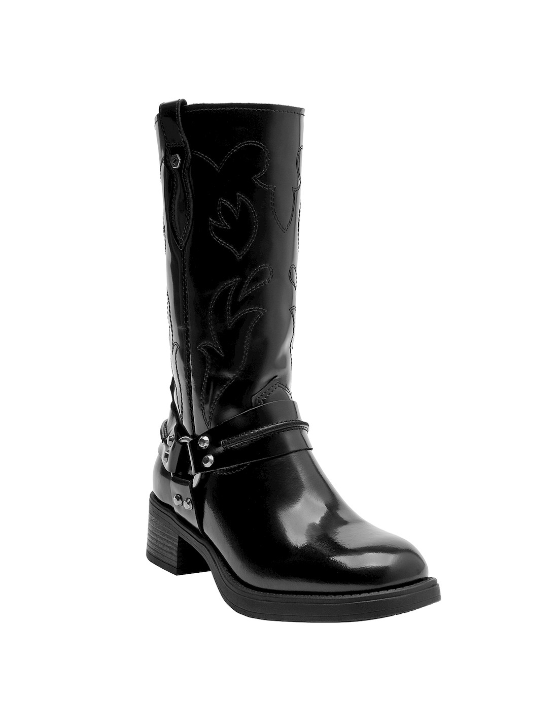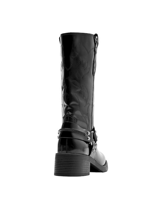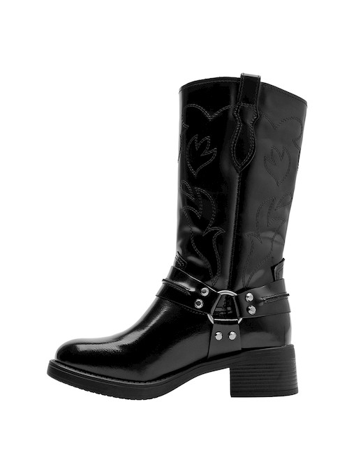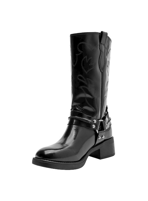 Atrévete con nuestras botas altas de cuero negro, un diseño audaz que fusiona personalidad y estilo urbano. Presentan un acabado brillante, perfecto para destacar en cualquier ocasión. Su punta cuadrada y taco bloque de 4.5 cm aportan un toque contemporáneo, mientras que los detalles metálicos añaden carácter a cada paso. Perfectas para combinar con una falda de cuero o unos jeans ajustados, estas botas son la elección ideal para marcar nuevas tendencias con facilidad.