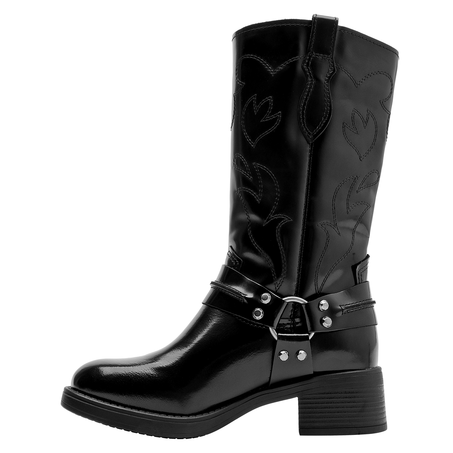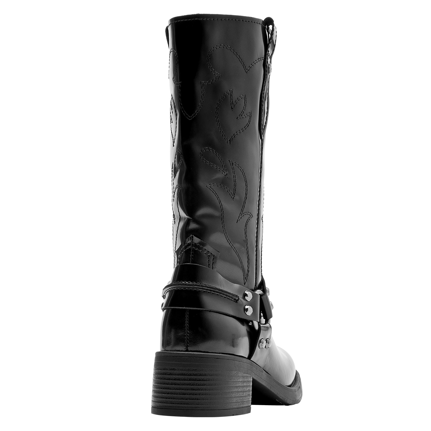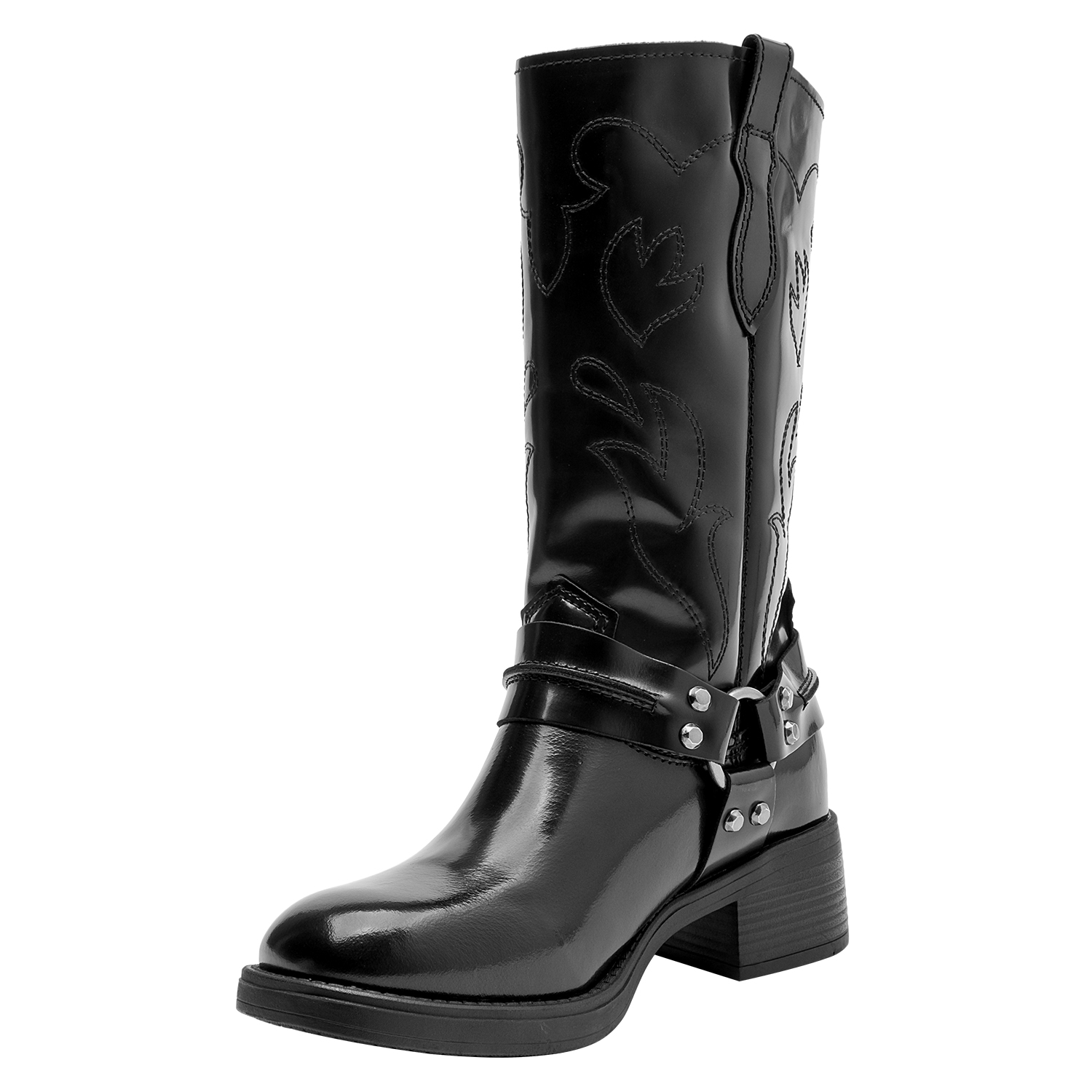 Atrévete con nuestras botas altas de cuero negro, un diseño audaz que fusiona personalidad y estilo urbano. Presentan un acabado brillante, perfecto para destacar en cualquier ocasión. Su punta cuadrada y taco bloque de 4.5 cm aportan un toque contemporáneo, mientras que los detalles metálicos añaden carácter a cada paso. Perfectas para combinar con una falda de cuero o unos jeans ajustados, estas botas son la elección ideal para marcar nuevas tendencias con facilidad.
