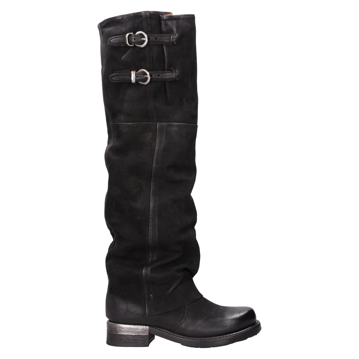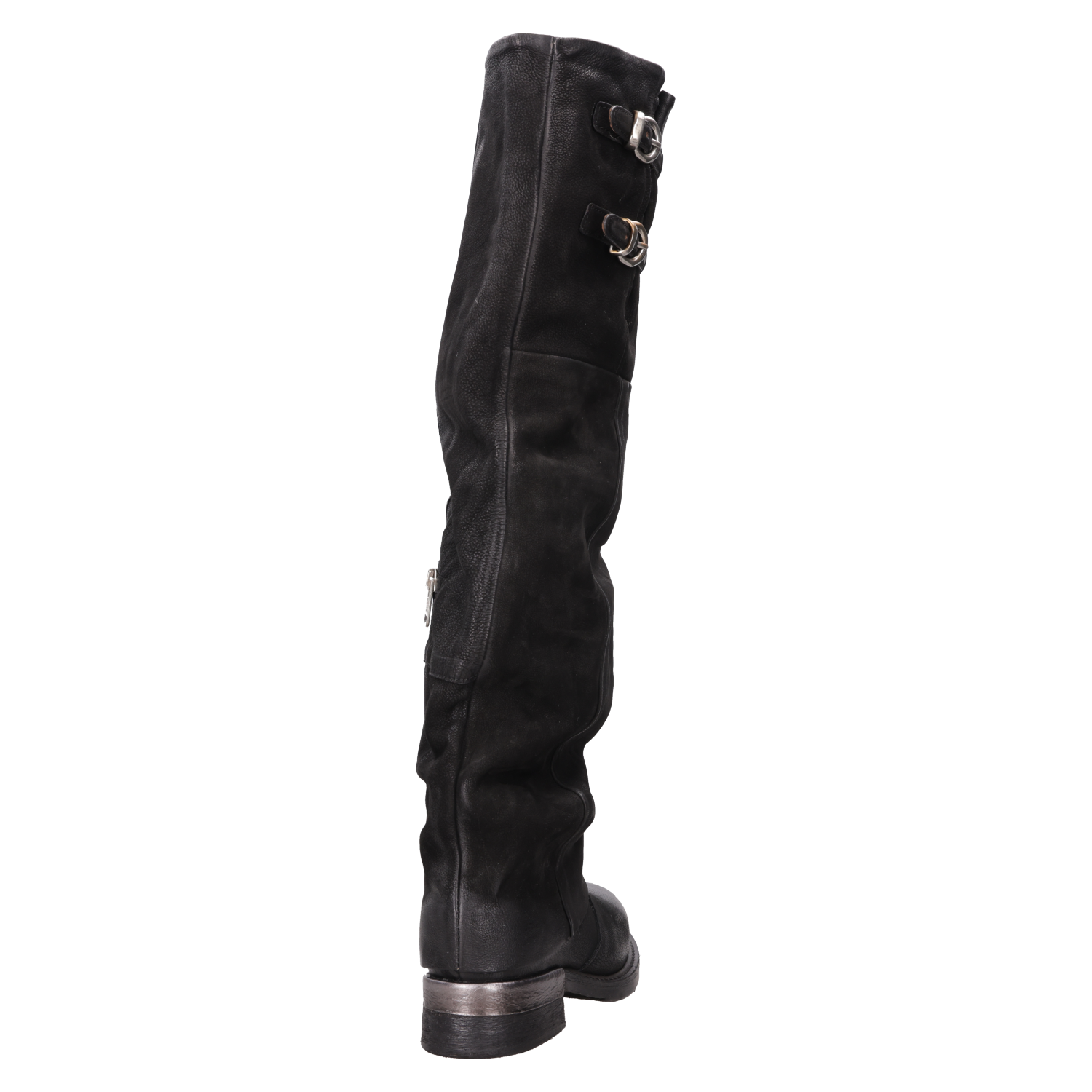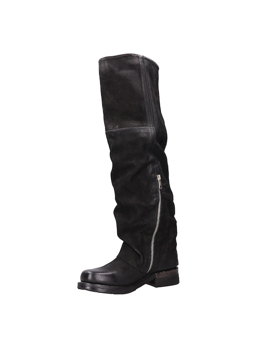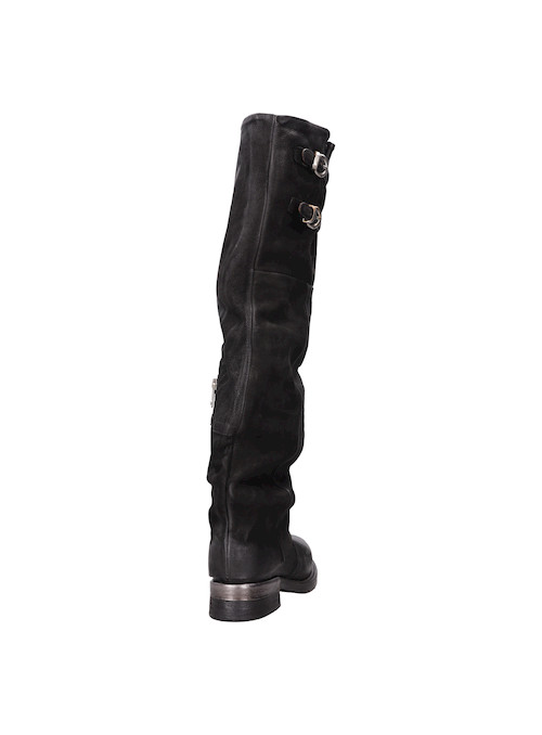 Explora el estilo audaz de estas botas altas de cuero negro, confeccionadas artesanalmente en Italia. Su diseño disruptivo, con un taco bloque de 3.5 cm y una punta redonda, aporta un toque de carácter a cualquier outfit. La textura suave del cuero se complementa con detalles metálicos en forma de hebillas, marcando un look urbano y moderno. No te quedes sin un look protagonista: combínalas con un vestido fluido o jeans ajustados y una chaqueta de cuero para un impacto visual impresionante.