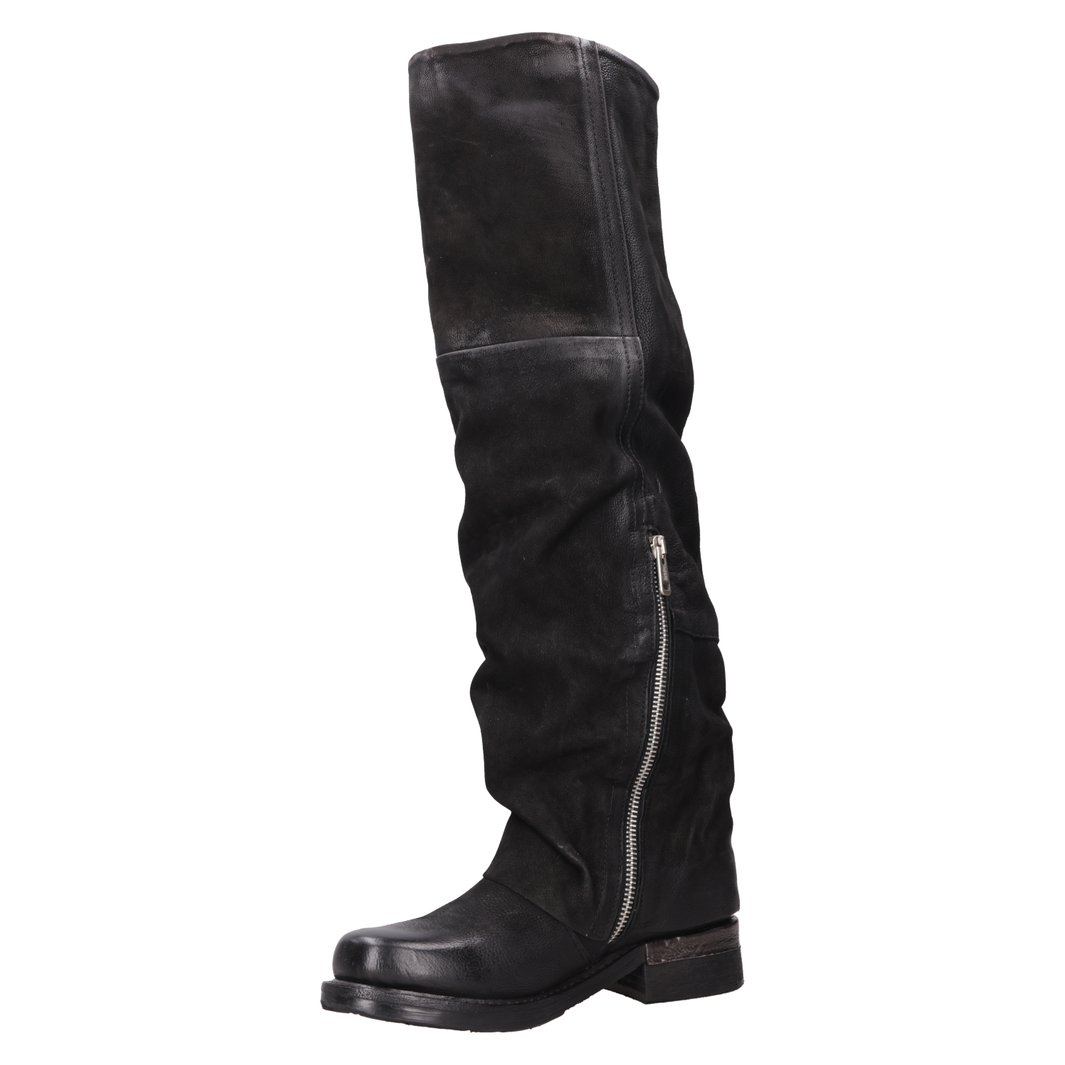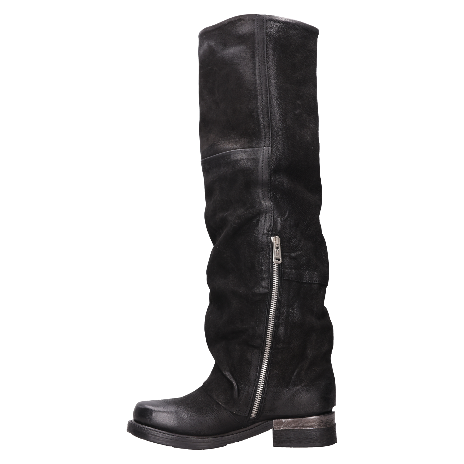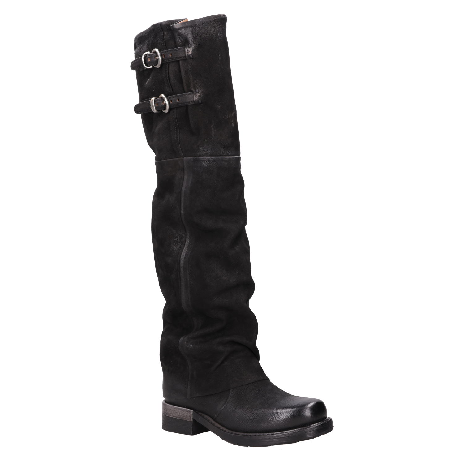 Explora el estilo audaz de estas botas altas de cuero negro, confeccionadas artesanalmente en Italia. Su diseño disruptivo, con un taco bloque de 3.5 cm y una punta redonda, aporta un toque de carácter a cualquier outfit. La textura suave del cuero se complementa con detalles metálicos en forma de hebillas, marcando un look urbano y moderno. No te quedes sin un look protagonista: combínalas con un vestido fluido o jeans ajustados y una chaqueta de cuero para un impacto visual impresionante.