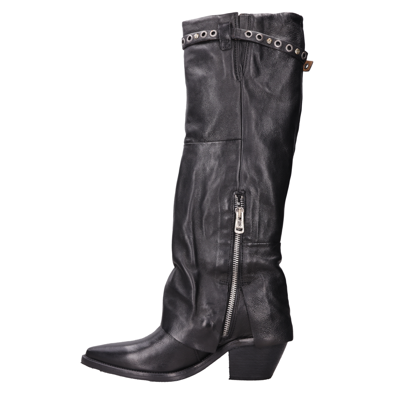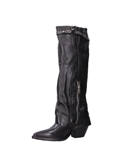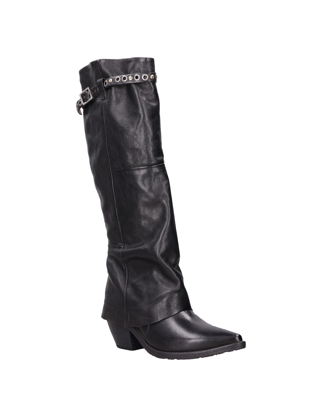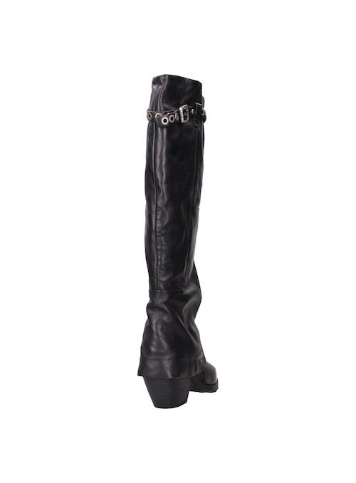 Atrévete a destacar con los botines de cuero negro AS98. Con una punta puntiaguda y un taco bloque de 6.5 cm, estos botines añaden un toque vanguardista a cualquier look. El cuero suave se combina con detalles metálicos, como el strap decorativo, creando contrastes visuales que marcan tendencia. Su estética urbana desafía lo convencional, convirtiéndolos en el complemento perfecto para un outfit de noche o para elevar un look diario. Combínalos con un vestido de cuero ceñido o con jeans ajustados y una chaqueta de cuero para un estilo audaz y auténtico.
