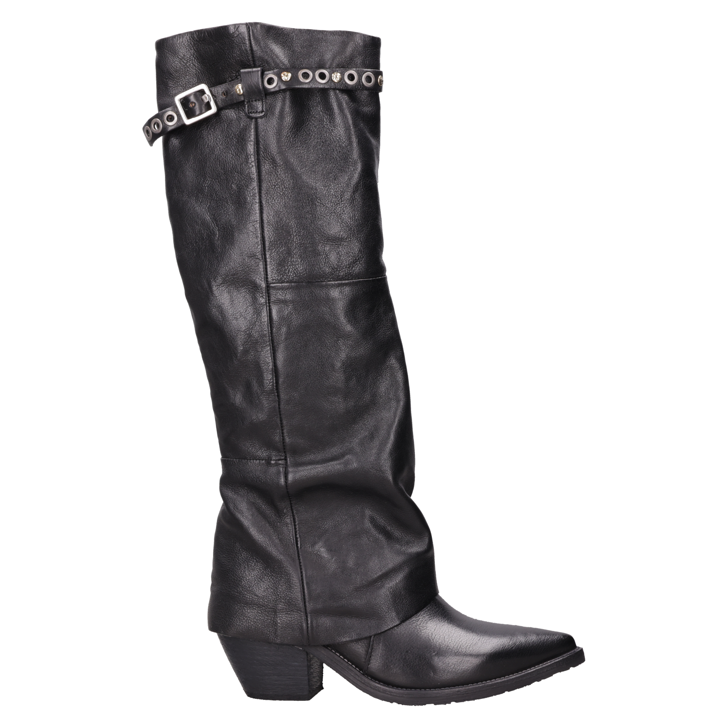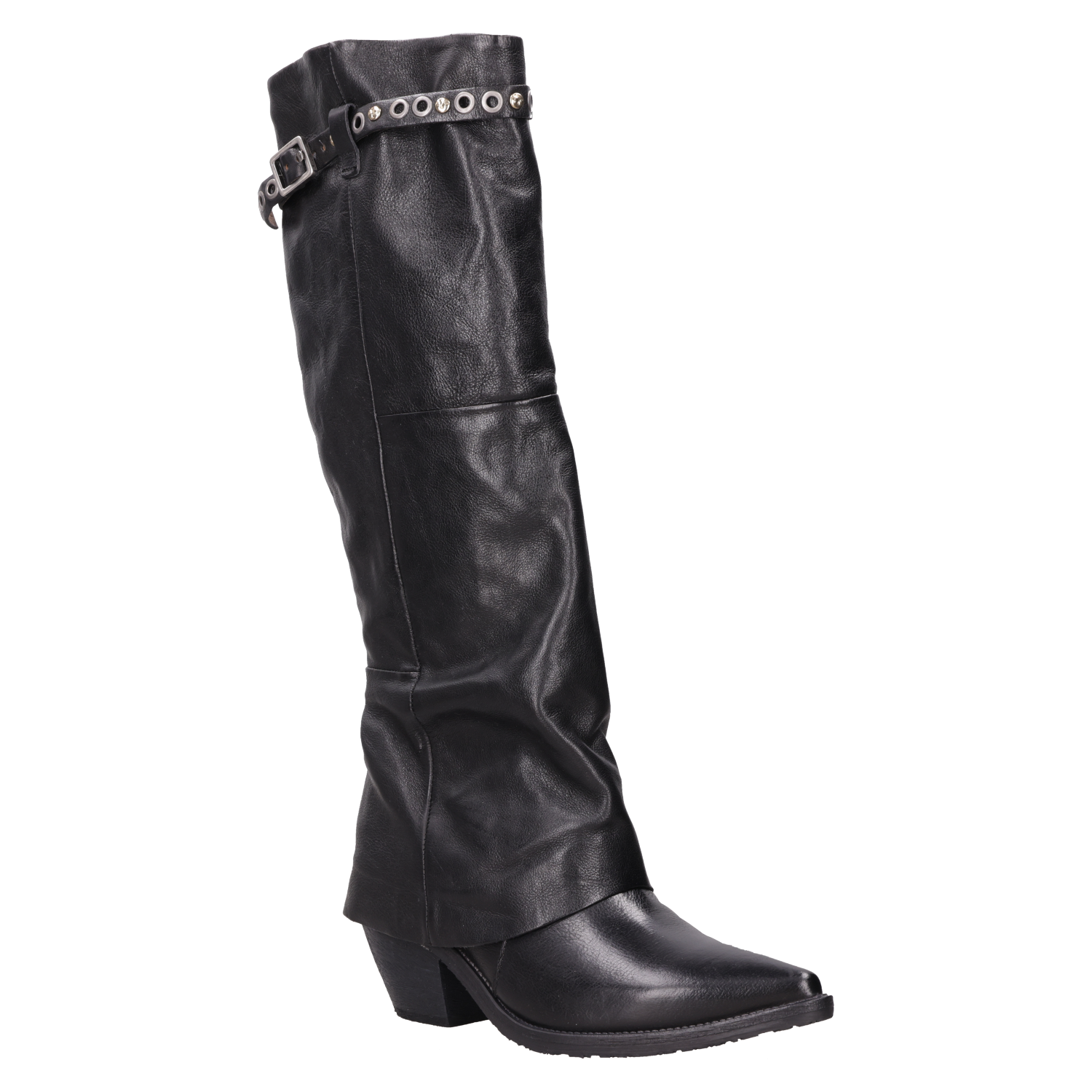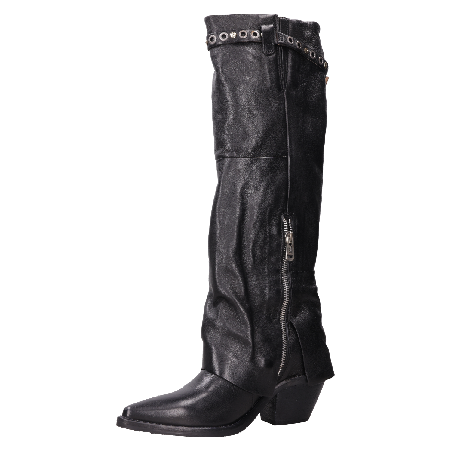 Atrévete a destacar con los botines de cuero negro AS98. Con una punta puntiaguda y un taco bloque de 6.5 cm, estos botines añaden un toque vanguardista a cualquier look. El cuero suave se combina con detalles metálicos, como el strap decorativo, creando contrastes visuales que marcan tendencia. Su estética urbana desafía lo convencional, convirtiéndolos en el complemento perfecto para un outfit de noche o para elevar un look diario. Combínalos con un vestido de cuero ceñido o con jeans ajustados y una chaqueta de cuero para un estilo audaz y auténtico.