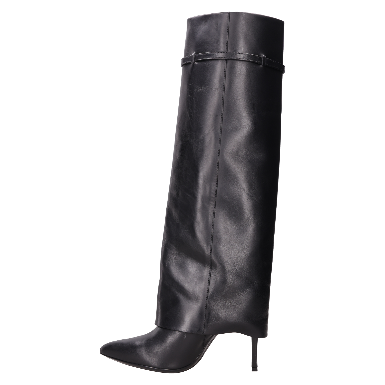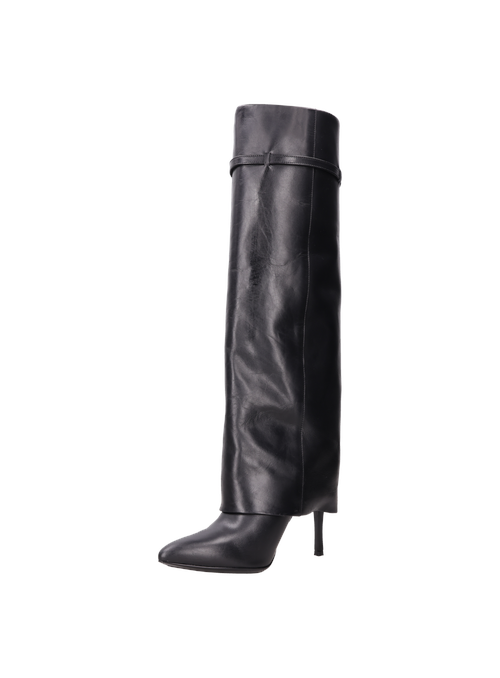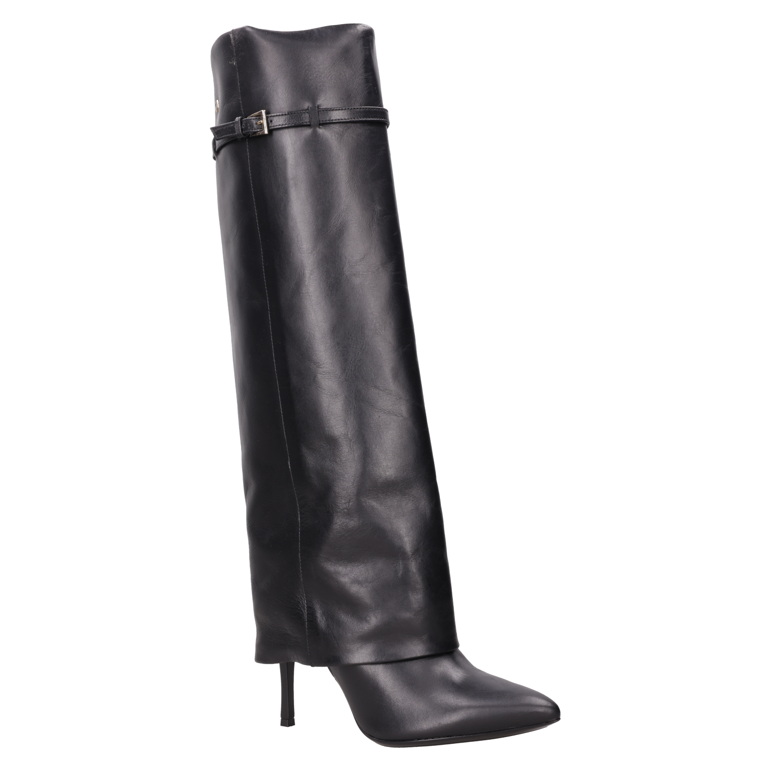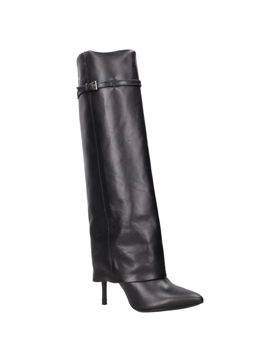Una pieza diseñada para deslumbrar, estas botas MINGO son la máxima expresión de sofisticación y elegancia. El cuero negro liso, de una suavidad excepcional, se transforma en una caña alta que mantiene una estructura fluida, mientras que el distintivo efecto de "solapa" añade capas visuales que capturan la atención. Con una punta afilada y un tacón de aguja de 9.5 cm, cada paso proyecta una imagen de alta moda y carácter. Perfectas para eventos formales o para elevar un look minimalista, estas botas son el toque final que define tu presencia. Combínalas con un vestido ajustado o unos pantalones de sastre para un impacto inolvidable.