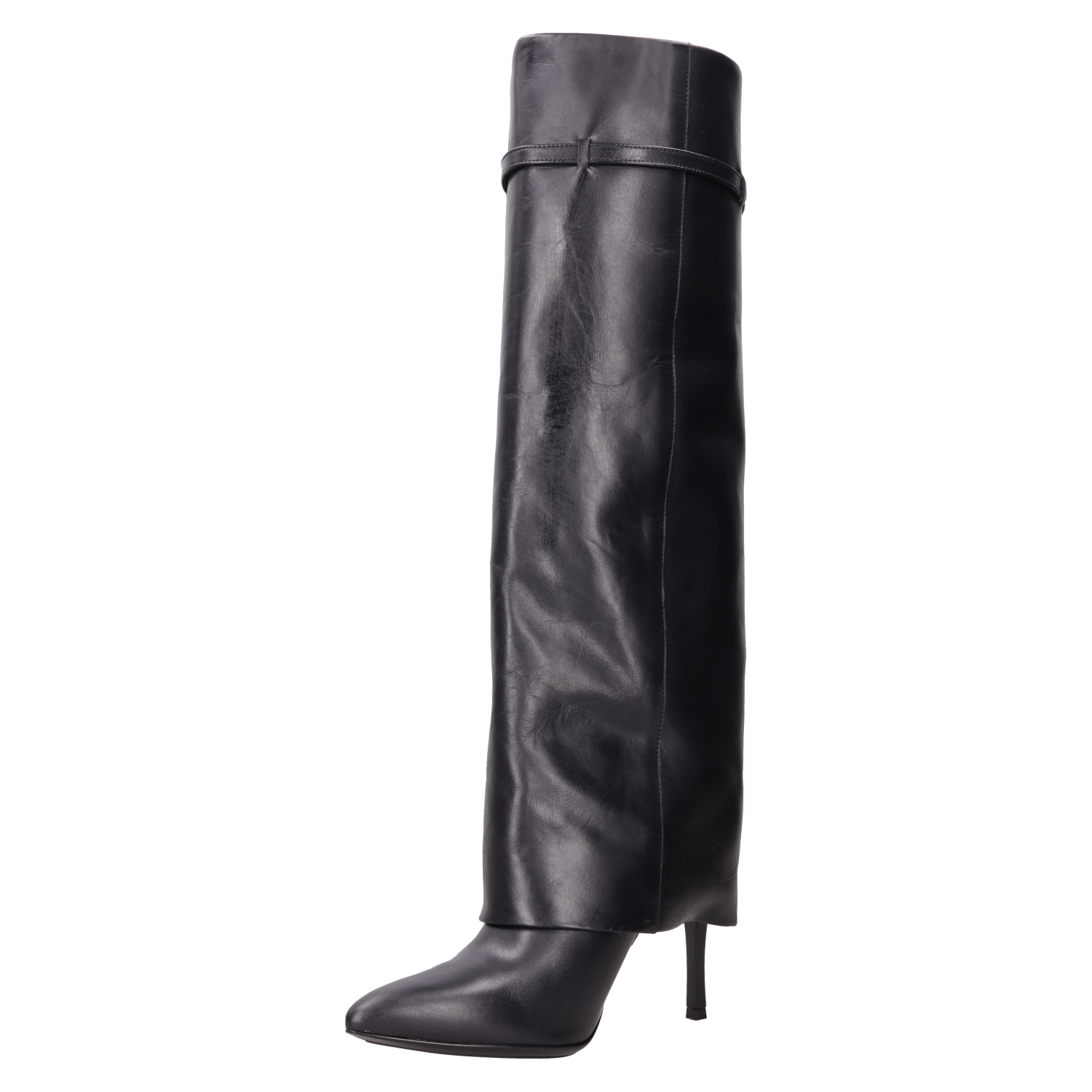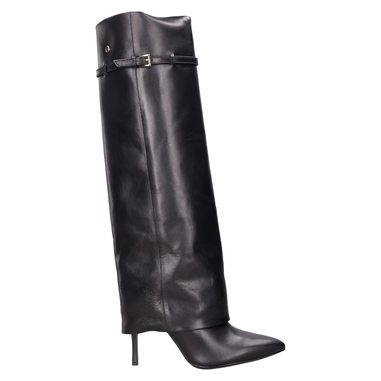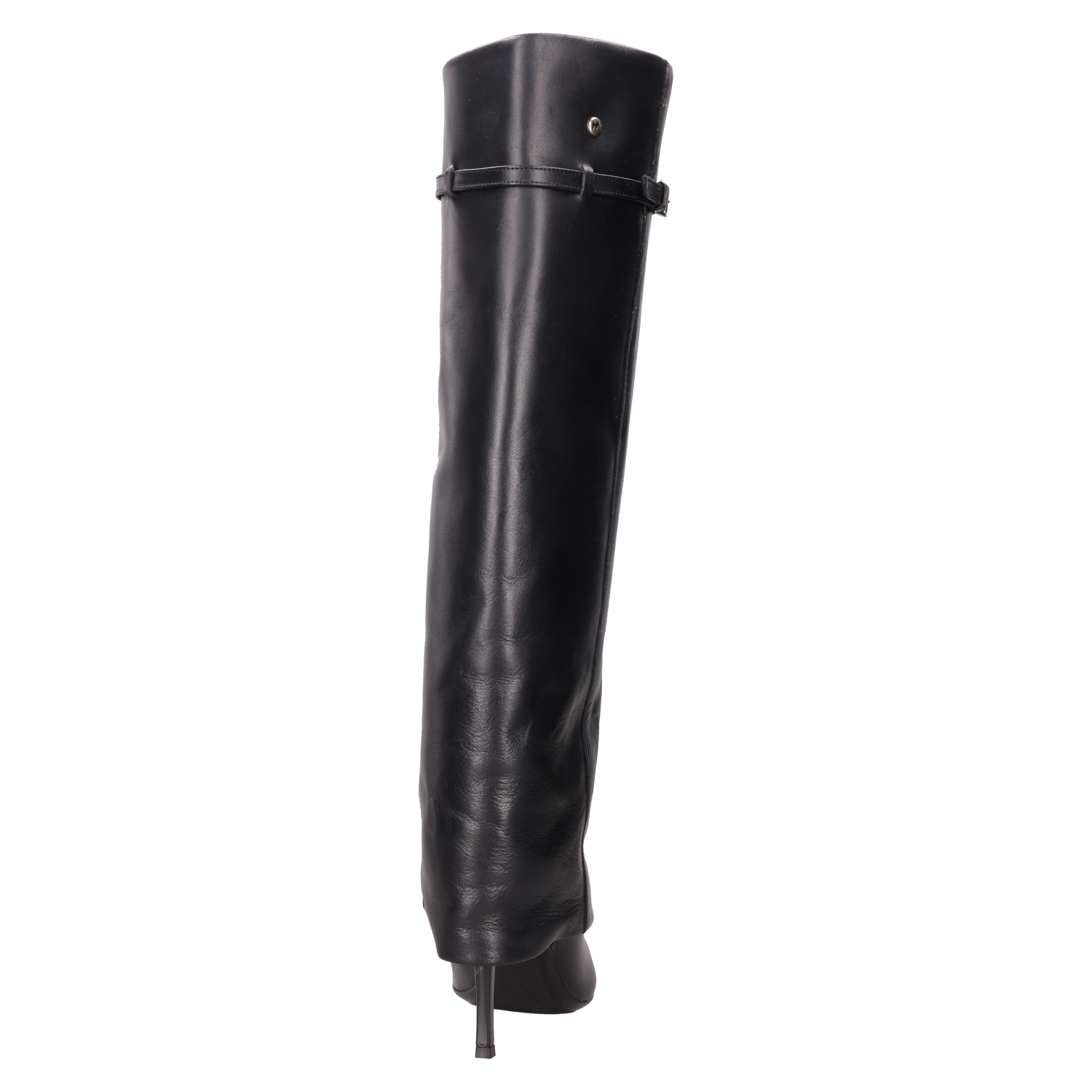 Una pieza diseñada para deslumbrar, estas botas MINGO son la máxima expresión de sofisticación y elegancia. El cuero negro liso, de una suavidad excepcional, se transforma en una caña alta que mantiene una estructura fluida, mientras que el distintivo efecto de "solapa" añade capas visuales que capturan la atención. Con una punta afilada y un tacón de aguja de 9.5 cm, cada paso proyecta una imagen de alta moda y carácter. Perfectas para eventos formales o para elevar un look minimalista, estas botas son el toque final que define tu presencia. Combínalas con un vestido ajustado o unos pantalones de sastre para un impacto inolvidable.