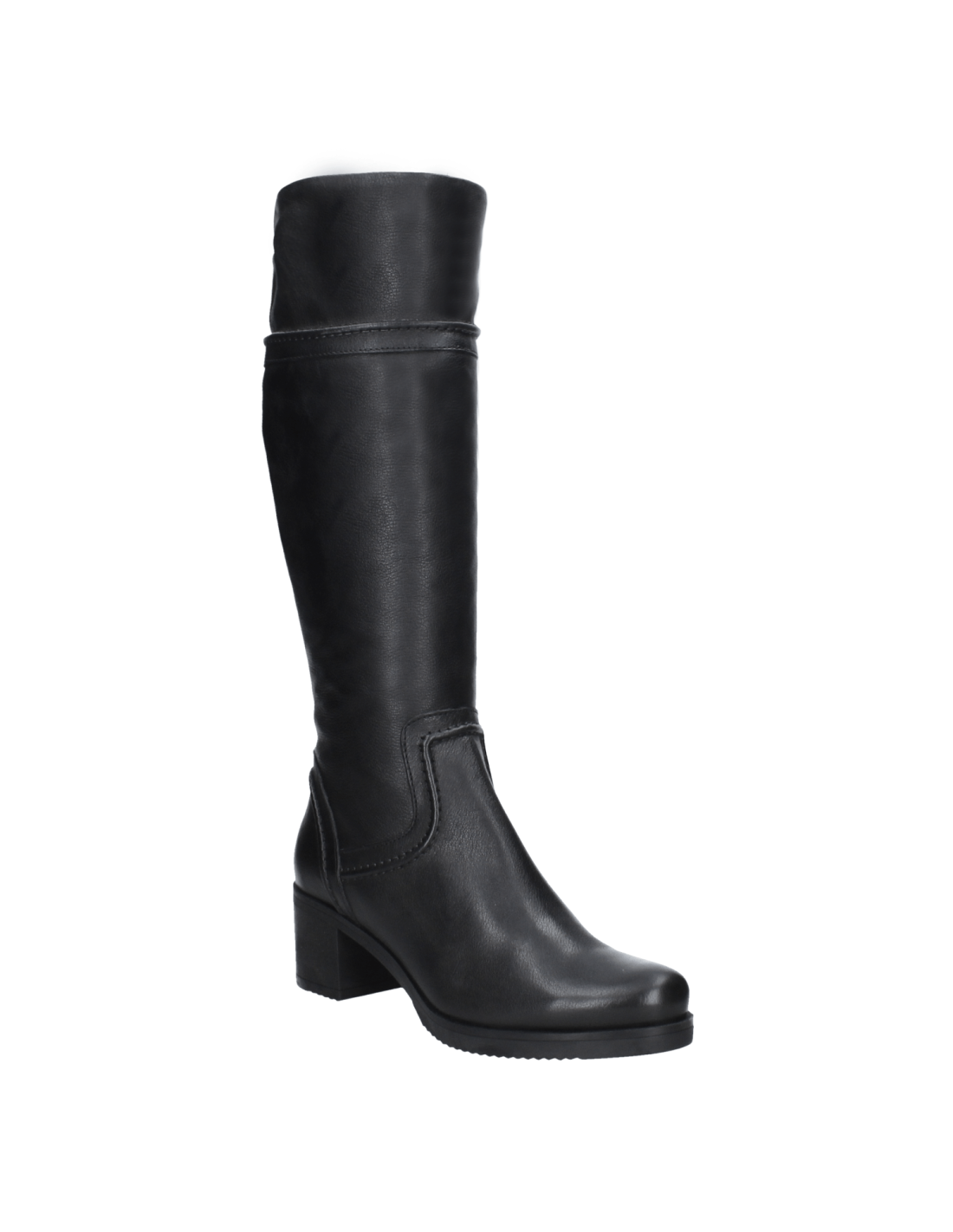 Bota sobria de cuero negro, caña alta y líneas limpias, excelente opción para un guardarropa clásico y sofisticado.