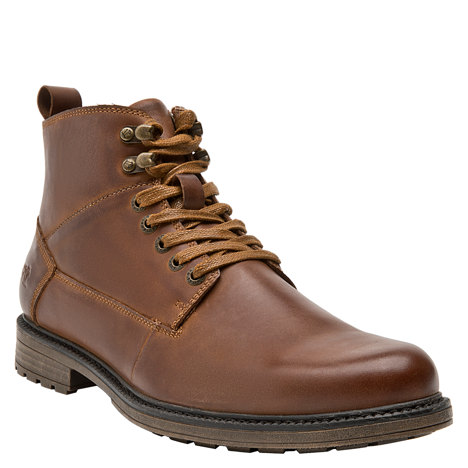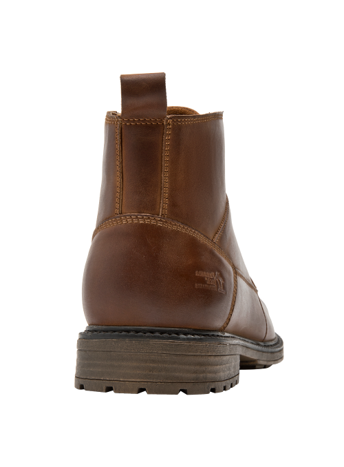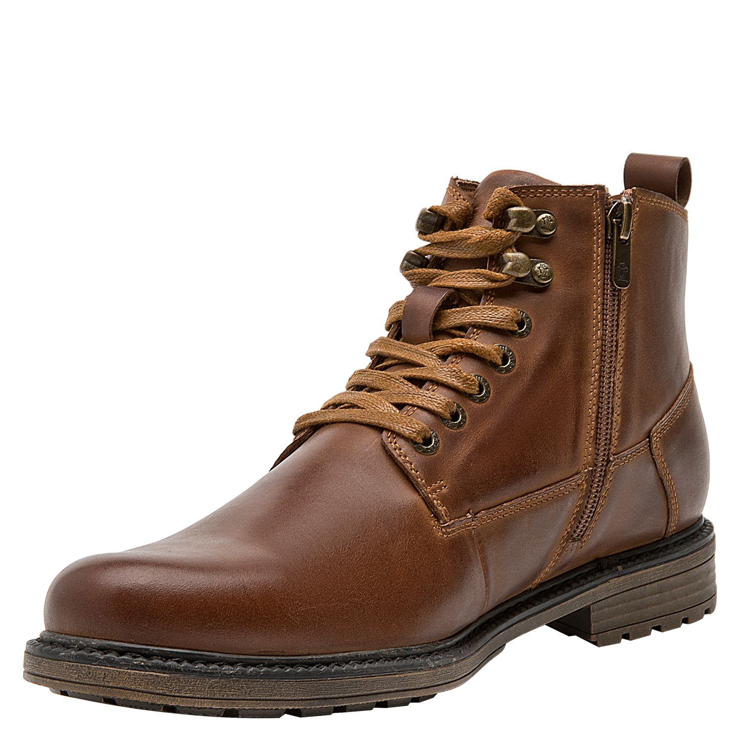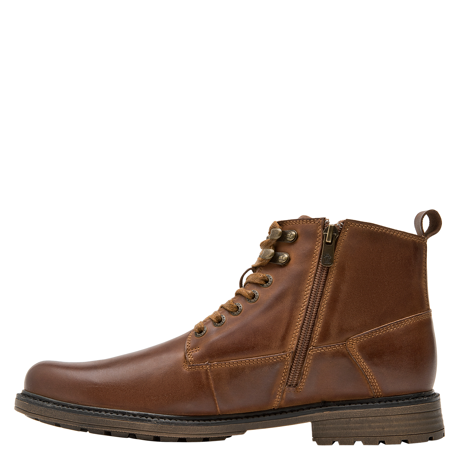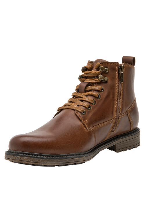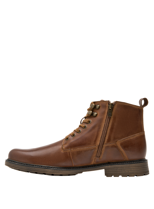 Botín casual de cuero para hombre en color café, con punta redonda y taco plano de 5 cm que aporta estabilidad y presencia. La capellada de cuero luce sobria y durable, mientras el forro interior de mesh favorece una sensación ligera durante el uso. Su diseño limpio y versátil lo hace ideal para el día a día, adaptándose a distintos estilos sin perder comodidad.