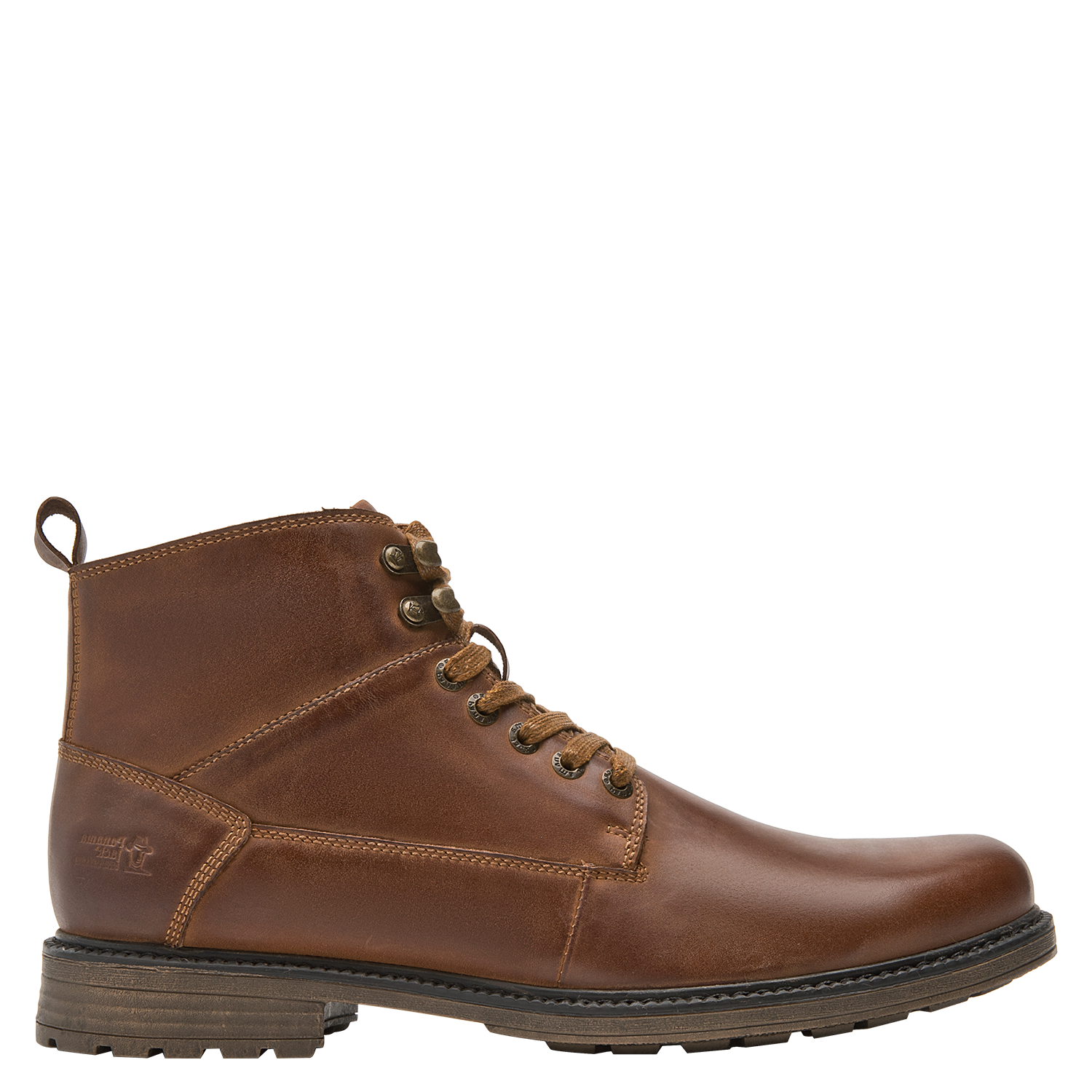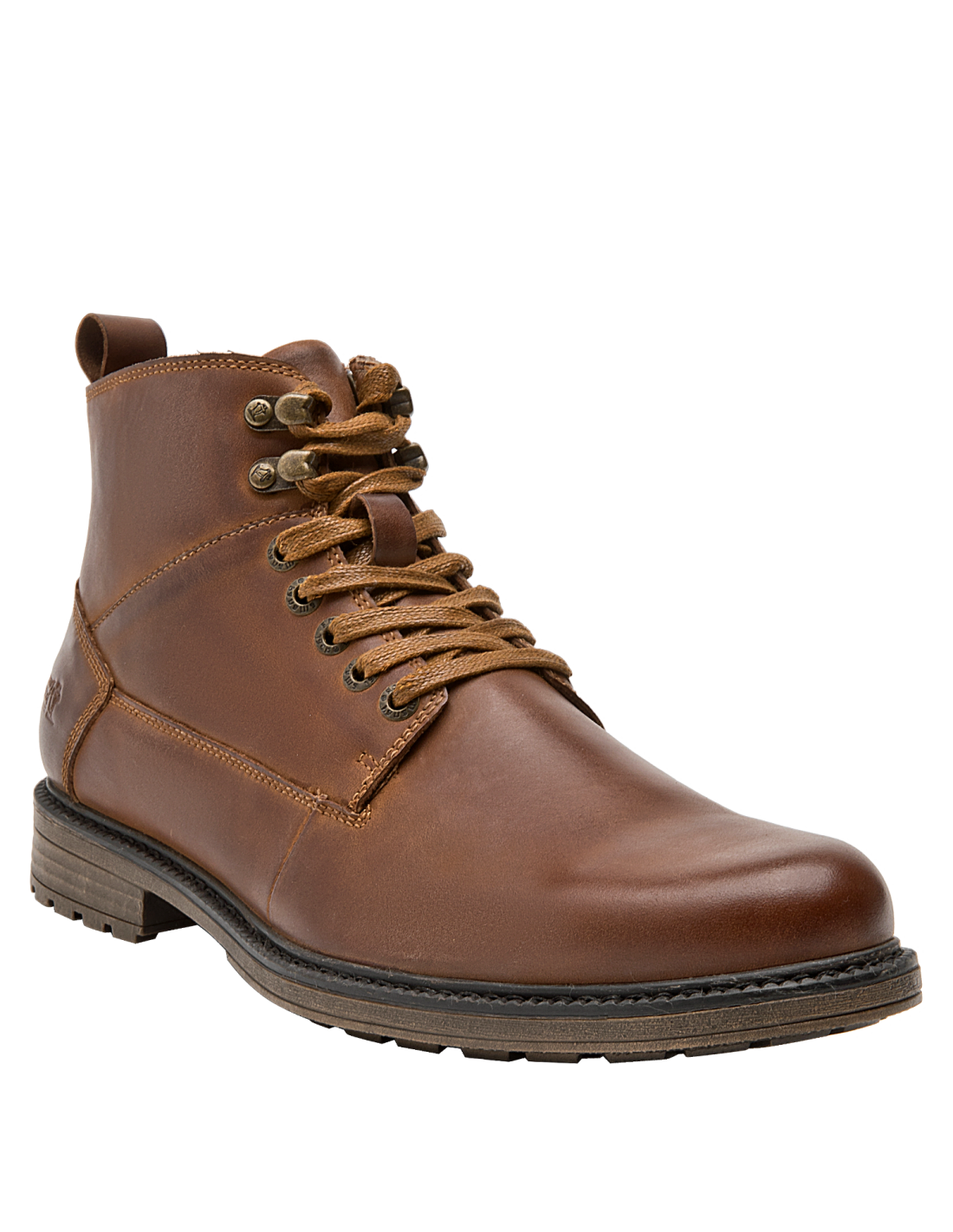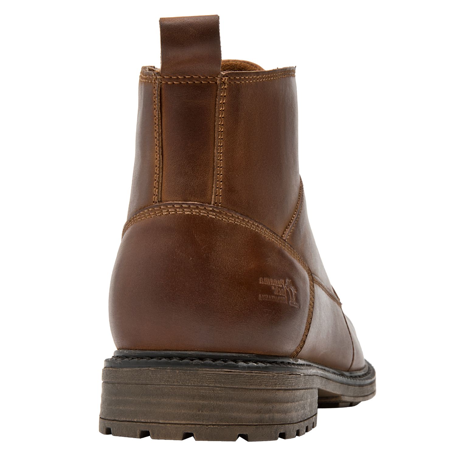 Botín casual de cuero para hombre en color café, con punta redonda y taco plano de 5 cm que aporta estabilidad y presencia. La capellada de cuero luce sobria y durable, mientras el forro interior de mesh favorece una sensación ligera durante el uso. Su diseño limpio y versátil lo hace ideal para el día a día, adaptándose a distintos estilos sin perder comodidad.