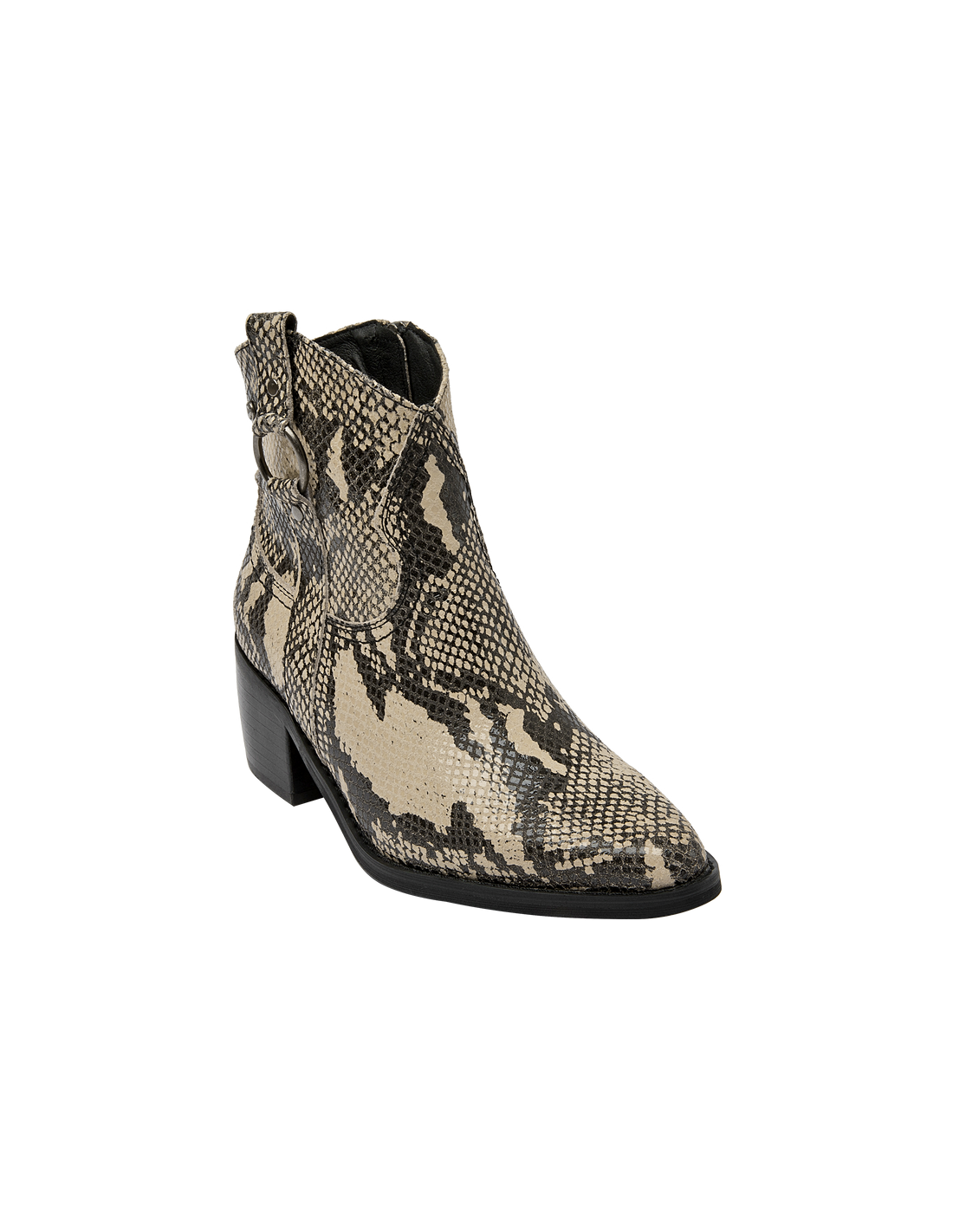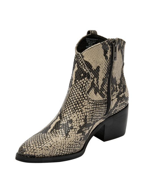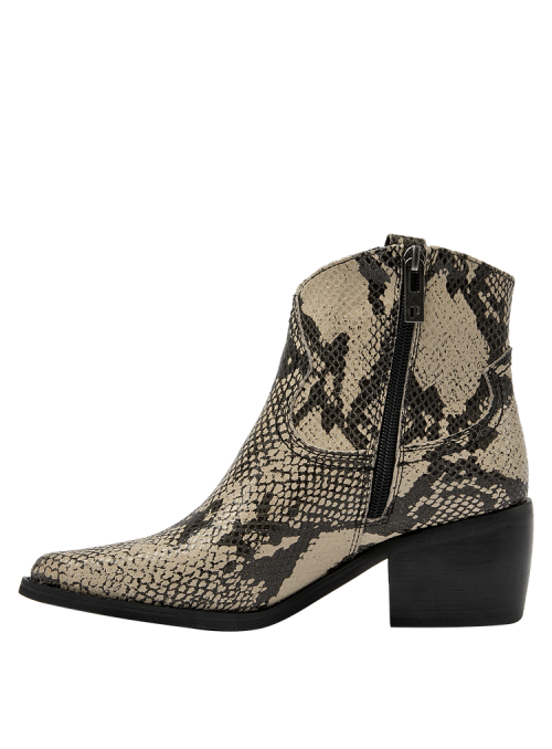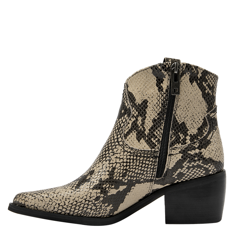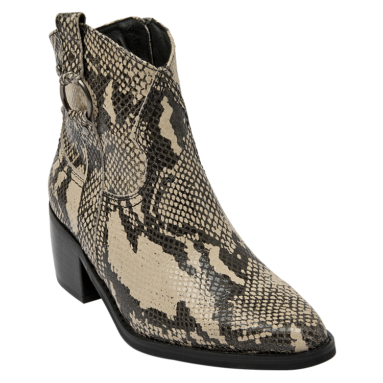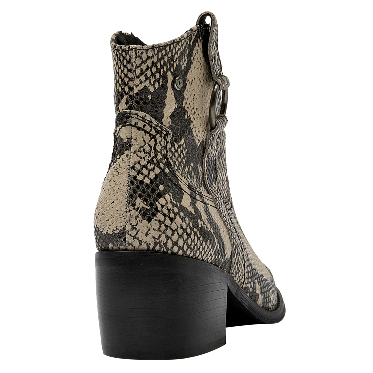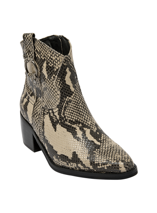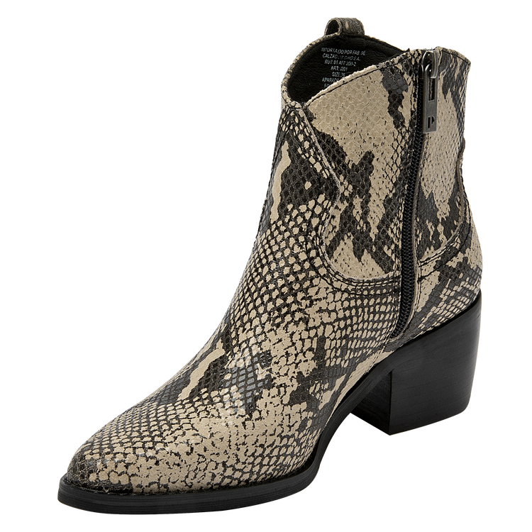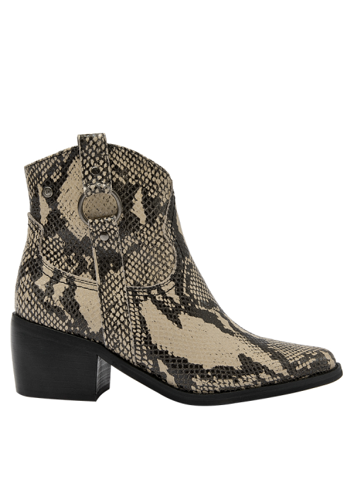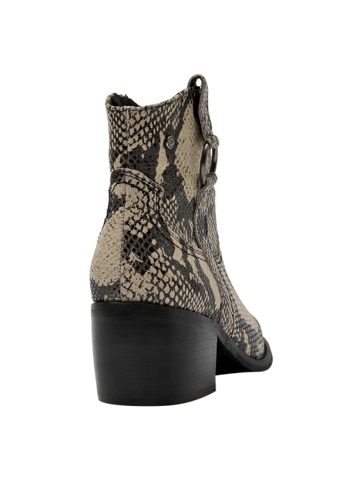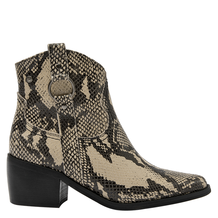 Descubre el botín vaquero de mujer de Pollini, una pieza que combina elegancia y sofisticación con un diseño impecable. Este botín presenta un acabado pulido y un tacón de altura media de 6 cm que garantiza comodidad mientras estiliza la pierna. Su diseño incorpora detalles de textura de piel de serpiente en las secciones superiores y laterales, junto con una hebilla decorativa y remaches metálicos que le otorgan un carácter audaz y moderno. Fabricado en 100% cuero, este botín es la elección perfecta para quienes buscan un estilo vaquero refinado.