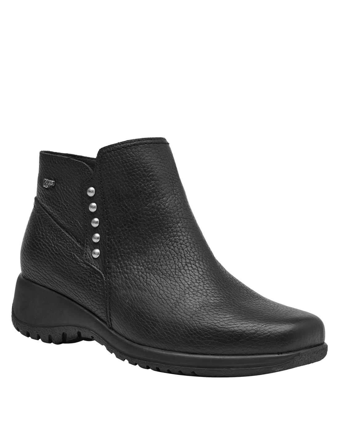 Botín de cuero negro con acabado texturizado y tacón bajo ancho, combina elegancia y comodidad diaria.