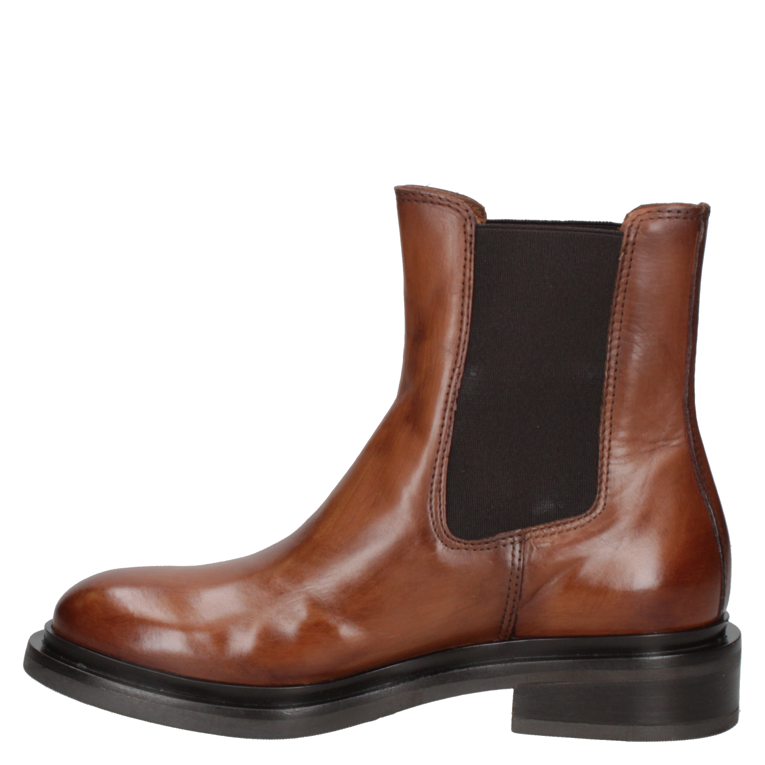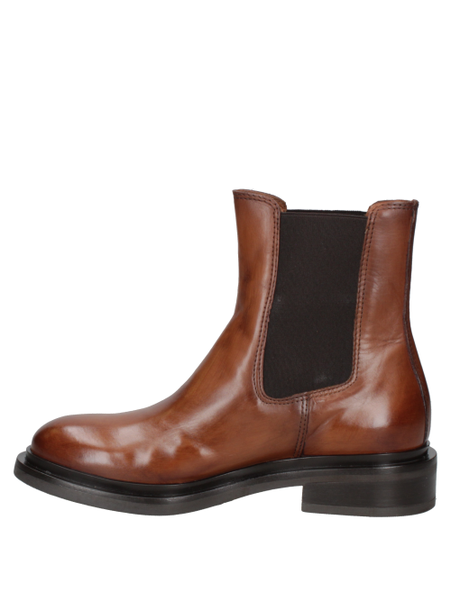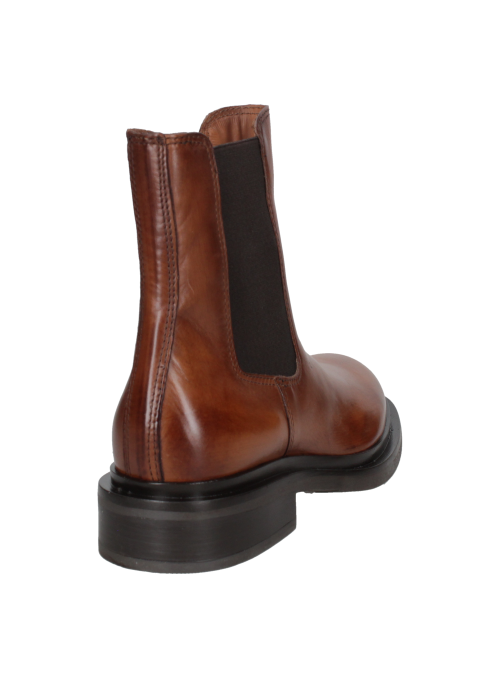 Botín Chelsea de cuero camel para mujer, con paneles elásticos y puntera redondeada, ideal para uso urbano.
