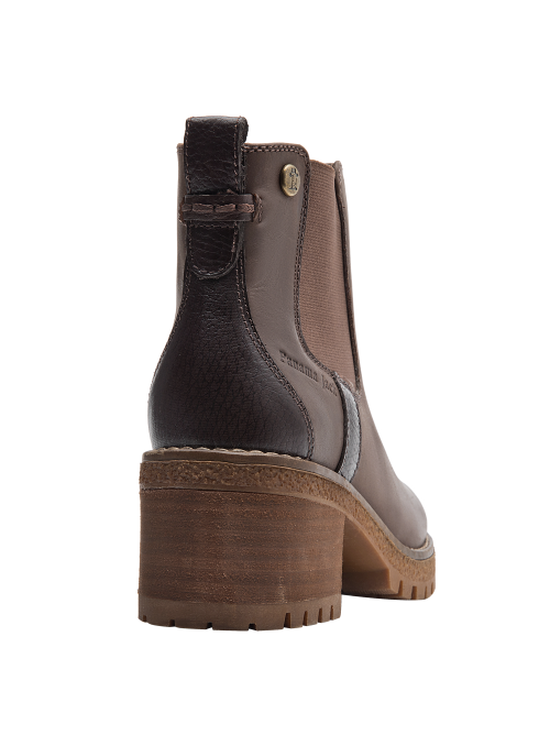 Botín Chelsea café para mujer, de cuero, con taco moderado que ofrece equilibrio entre estilo y funcionalidad.