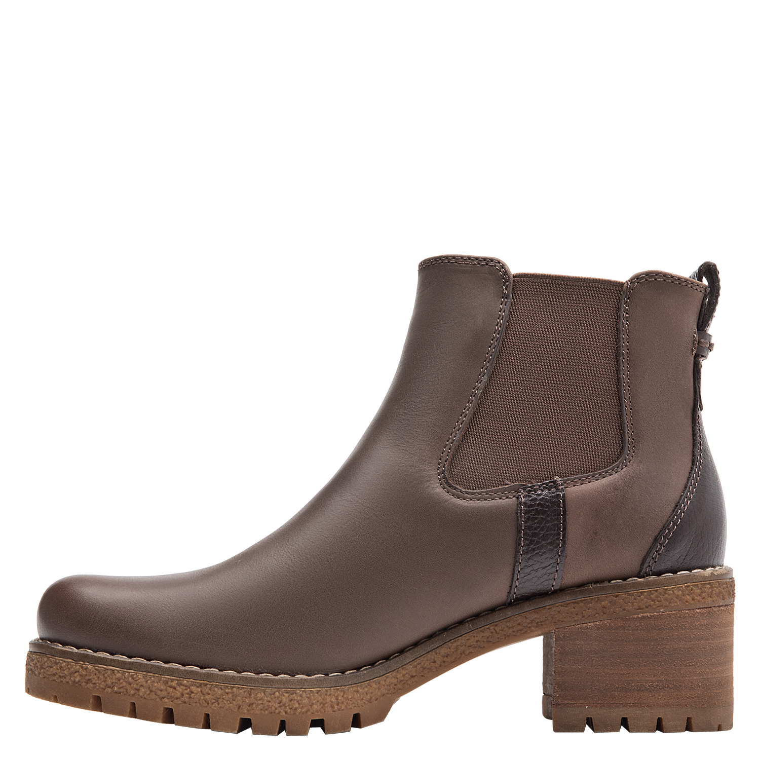 Cuero café en botín Chelsea para mujer, con refuerzo en talón que brinda estabilidad y soporte al caminar.