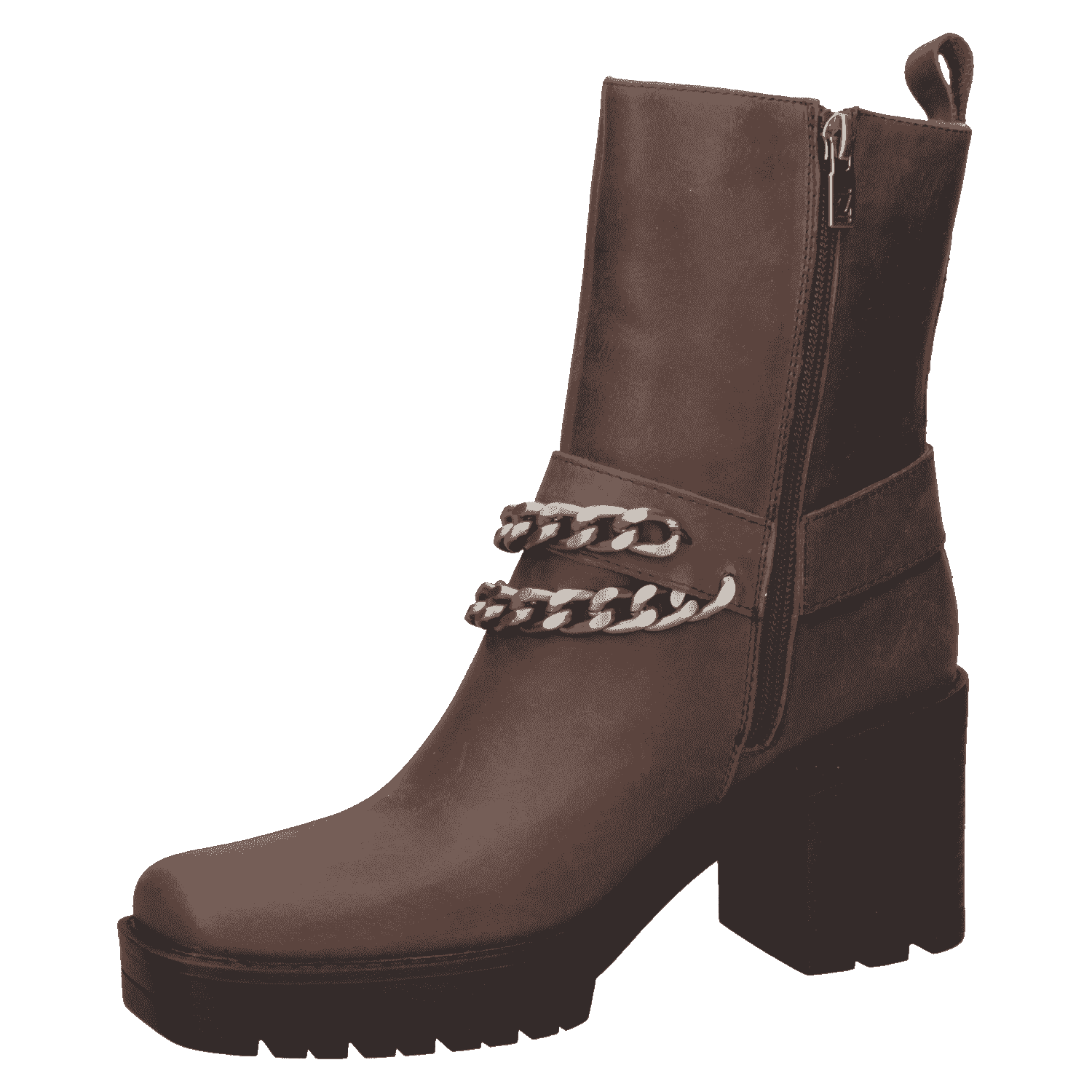 Calzado de cuero café para mujer, diseño audaz y moderno, adecuado para conciertos y salidas casuales. Botín de cuero café para mujer, con tira trasera que facilita calzarlo, combina con jeans pitillo y vestidos. Botín alto de cuero café para mujer, con cinturón decorativo y apliques metálicos, perfecto para ocasiones informales. Calzado de cuero café para mujer, con tacón cuadrado medio y suela chunky, decorado con cadenas metálicas en el empeine. Botín de cuero café para mujer, estilo casual con diseño robusto y moderno, ideal para un look urbano y rockero.