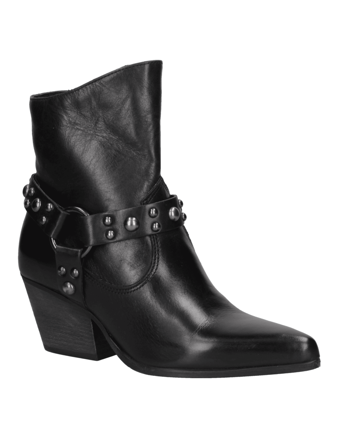 El botín de mujer de MJUS L407 combina un diseño de inspiración vaquera con detalles modernos que capturan la atención. Este botín, confeccionado en cuero, presenta una estructura media que se extiende hasta el tobillo, complementada por un tacón ancho y bajo de 6.5 cm que garantiza comodidad y estabilidad. El empeine liso con acabado pulido y la correa decorativa con tachas metálicas y anillo aportan un toque atrevido y contemporáneo, ideal para quienes buscan un estilo casual pero sofisticado.