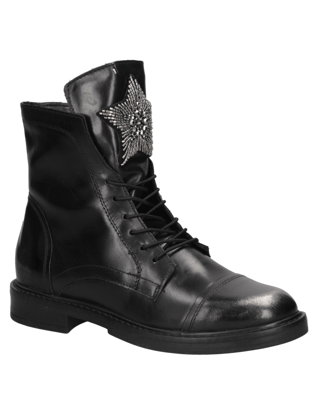 El botín de mujer de MJUS L410 combina un diseño estilizado con detalles sofisticados que capturan la atención. Con un cierre de cordones frontal, ofrece un ajuste firme y seguro, mientras que la caña alta de 14.5 cm proporciona soporte adicional al tobillo. Destacan las pequeñas aplicaciones brillantes en la lengüeta, que añaden un toque de elegancia artesanal. La puntera reforzada y la costura visible no solo aumentan la durabilidad, sino que también aportan un estilo único y moderno. La suela plana y robusta asegura una tracción óptima, ideal para quienes buscan comodidad sin sacrificar el estilo.