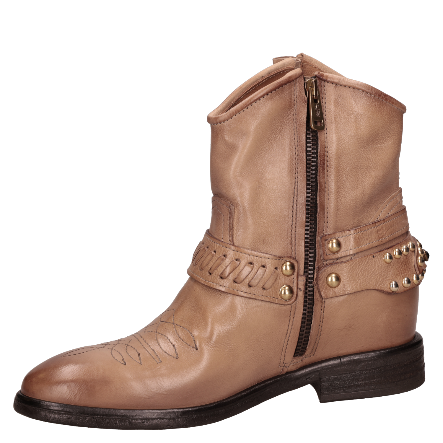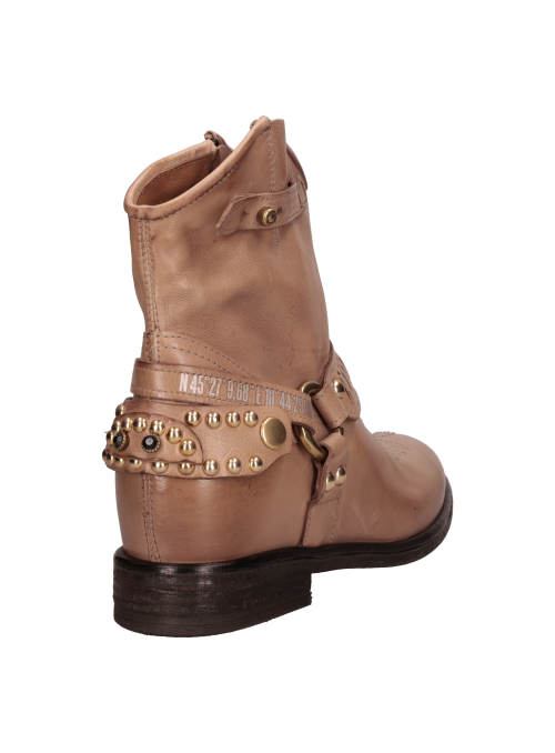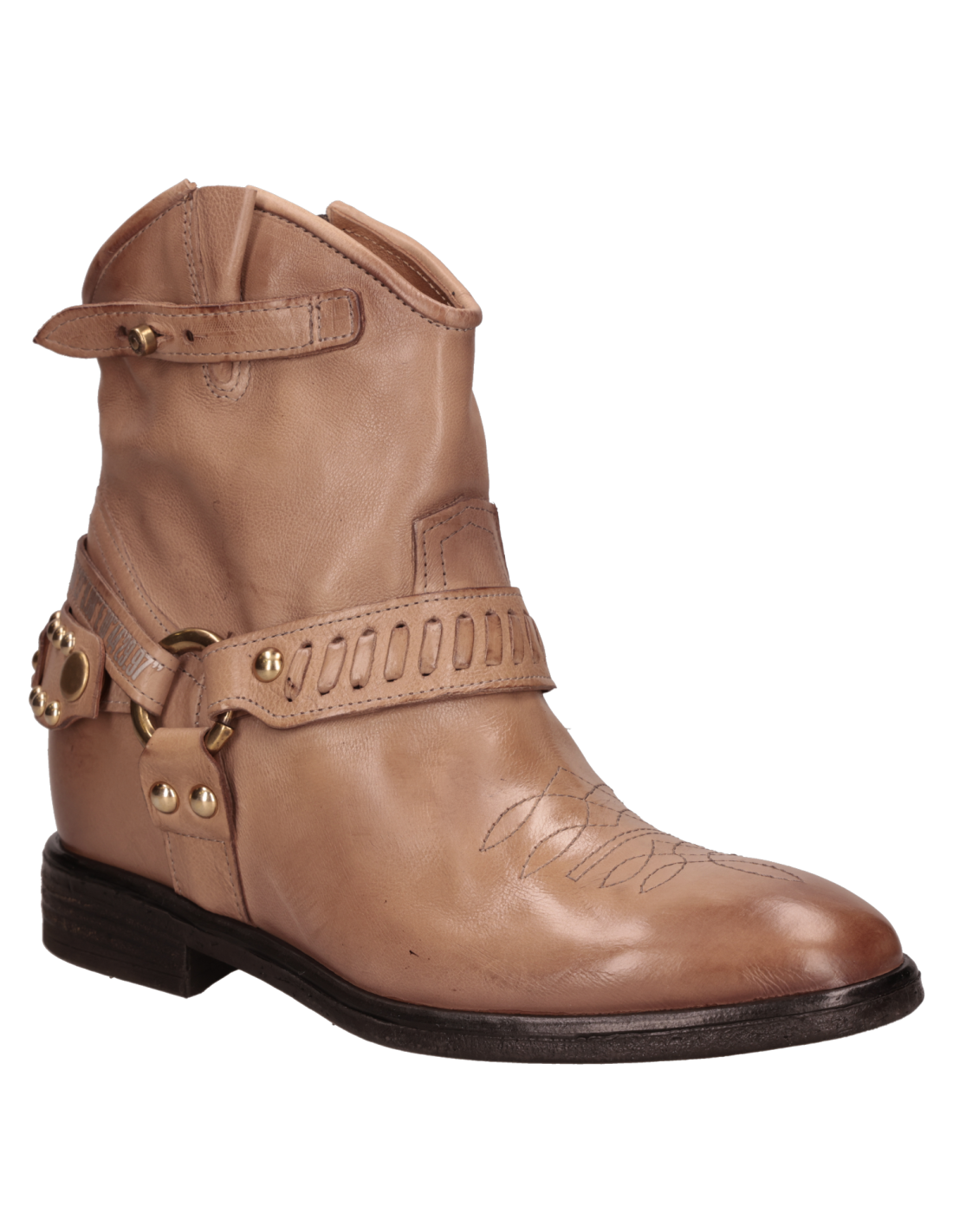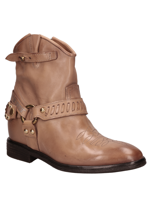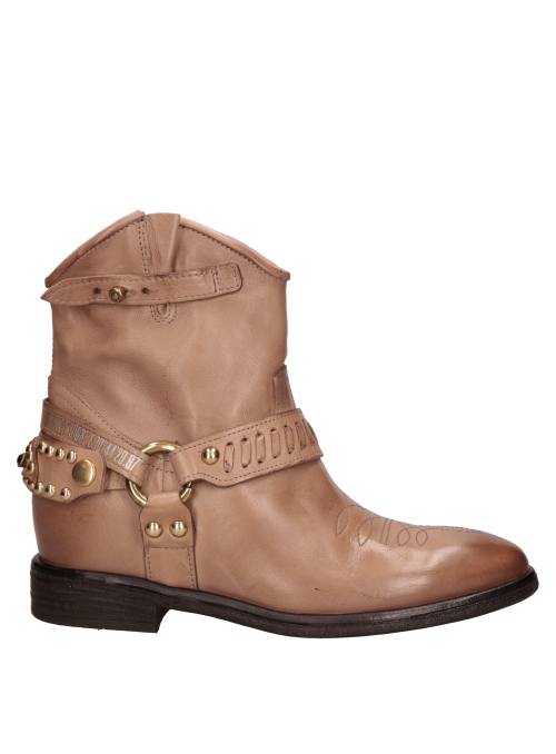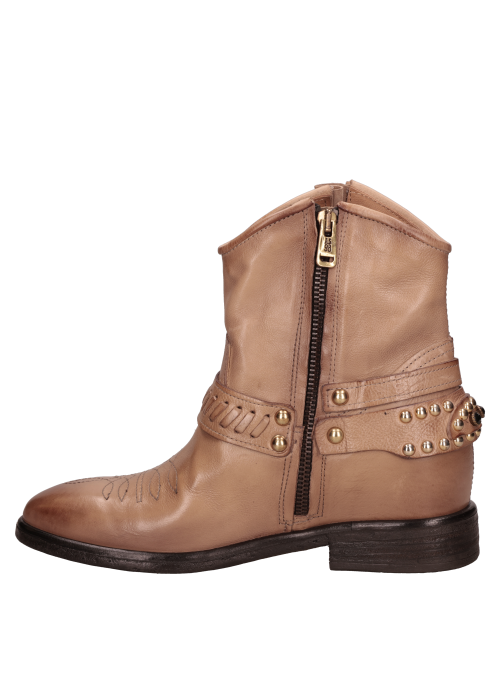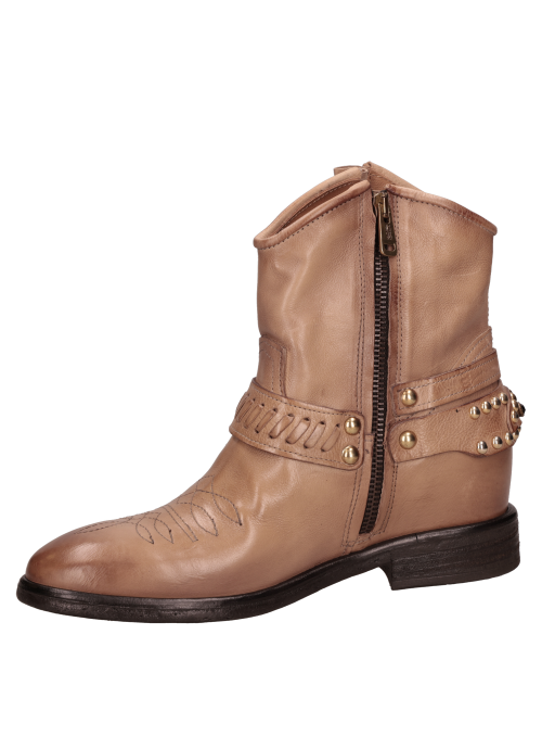 Botín vaquero para mujer de estilo western en color beige, con caña al tobillo, punta redonda y taco bloque de 3 cm. El exterior en cuero y el forro del mismo material ofrecen una sensación suave y un acabado prolijo, ideal para transitar del día a la noche. Líneas limpias y diseño minimalista para un look atemporal y fácil de combinar. Sugerencias de outfit: úsalo con jeans rectos y blusa fluida; con falda midi y chaqueta de cuero; o con pantalón sastre, polera básica y abrigo liviano para un smart casual.