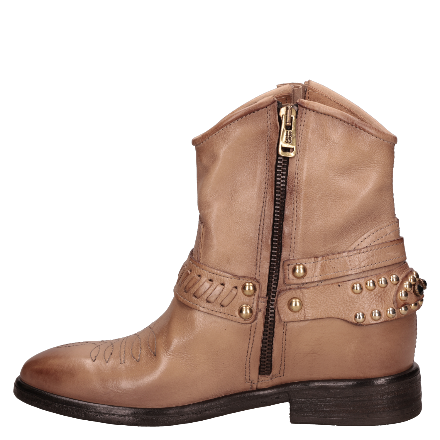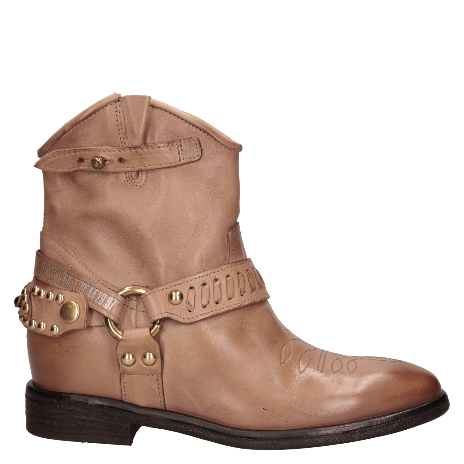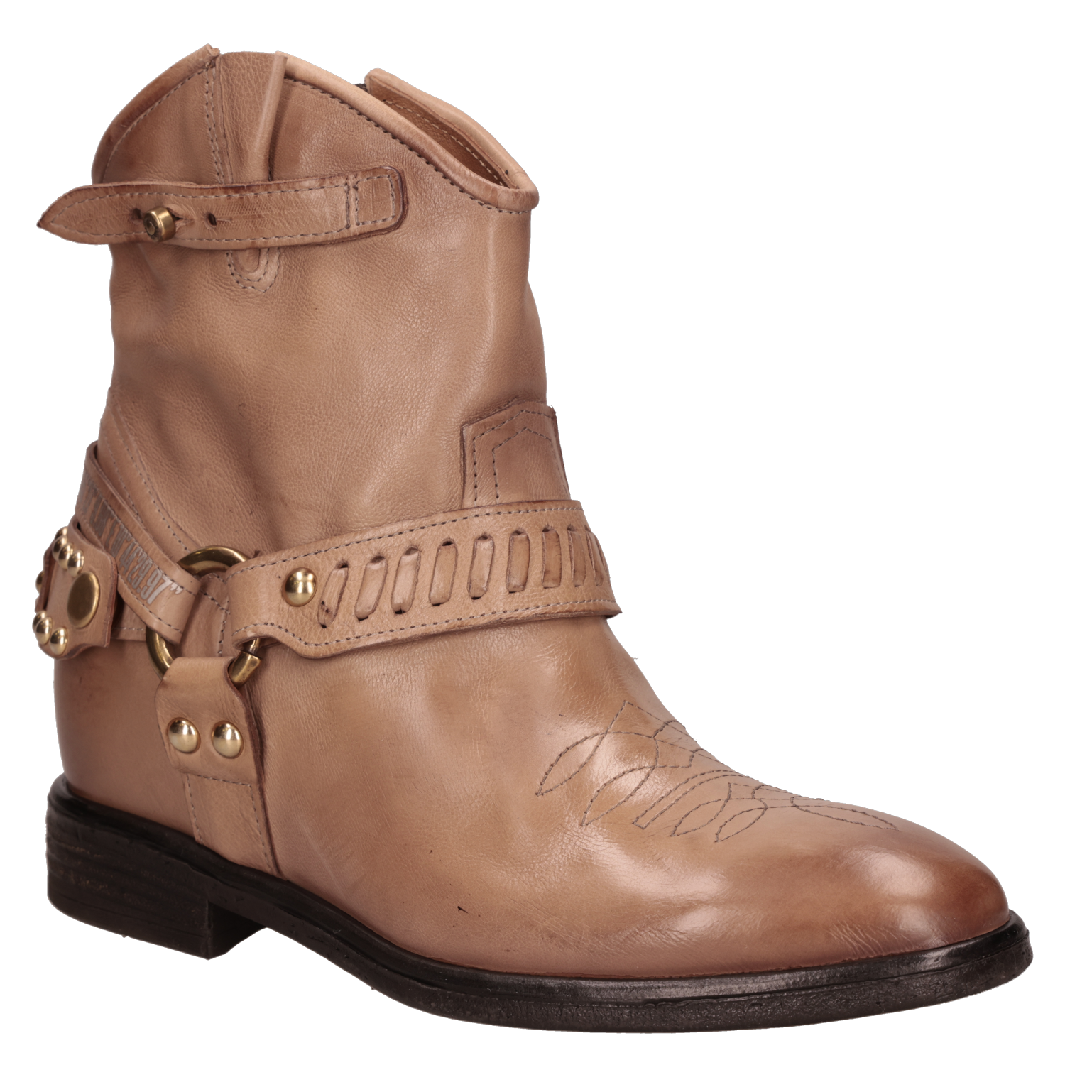Botín vaquero para mujer de estilo western en color beige, con caña al tobillo, punta redonda y taco bloque de 3 cm. El exterior en cuero y el forro del mismo material ofrecen una sensación suave y un acabado prolijo, ideal para transitar del día a la noche. Líneas limpias y diseño minimalista para un look atemporal y fácil de combinar. Sugerencias de outfit: úsalo con jeans rectos y blusa fluida; con falda midi y chaqueta de cuero; o con pantalón sastre, polera básica y abrigo liviano para un smart casual.