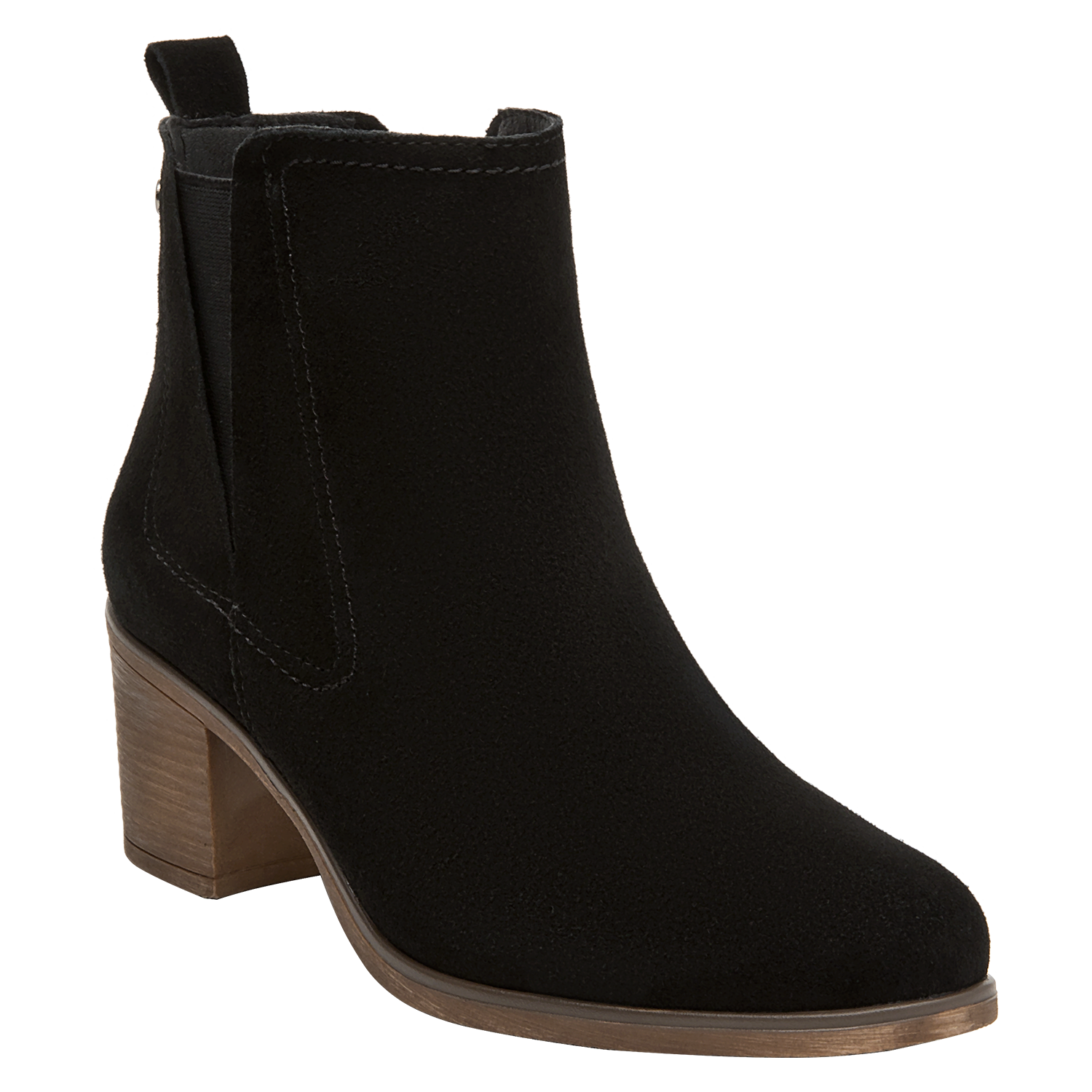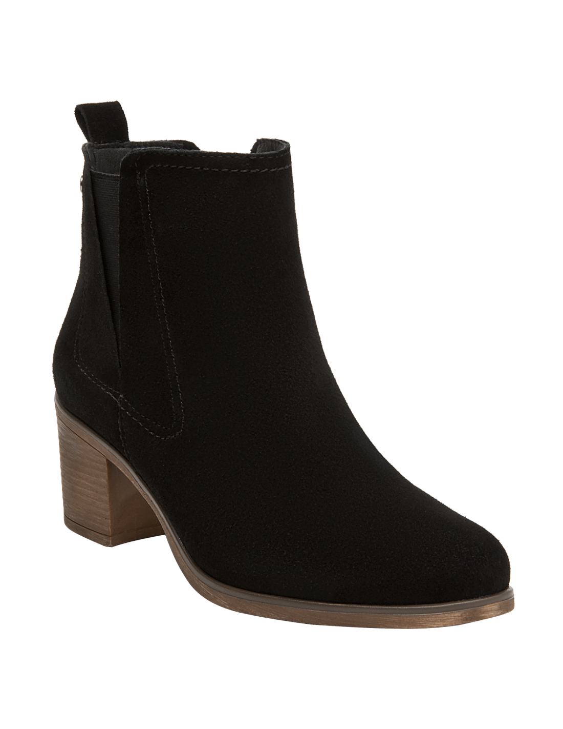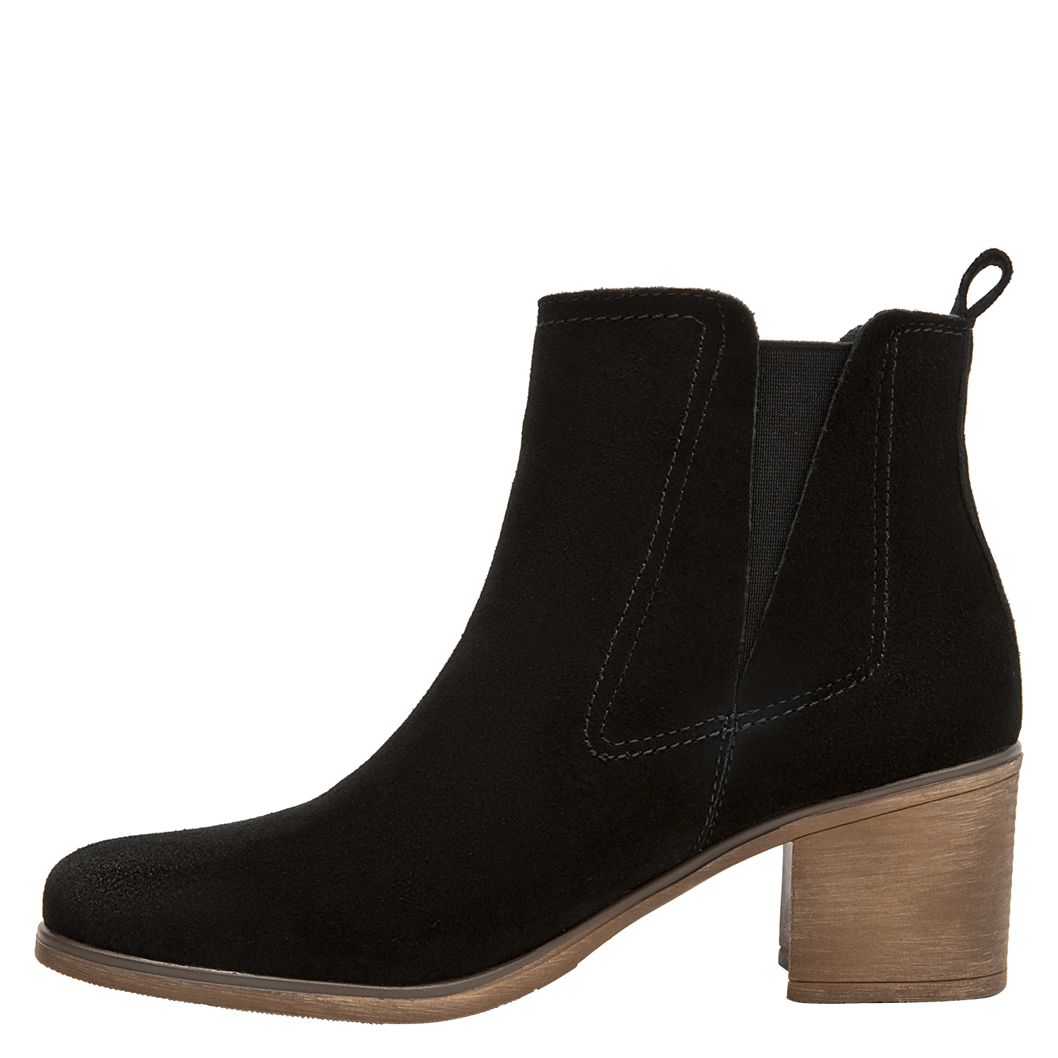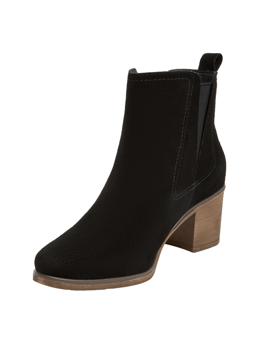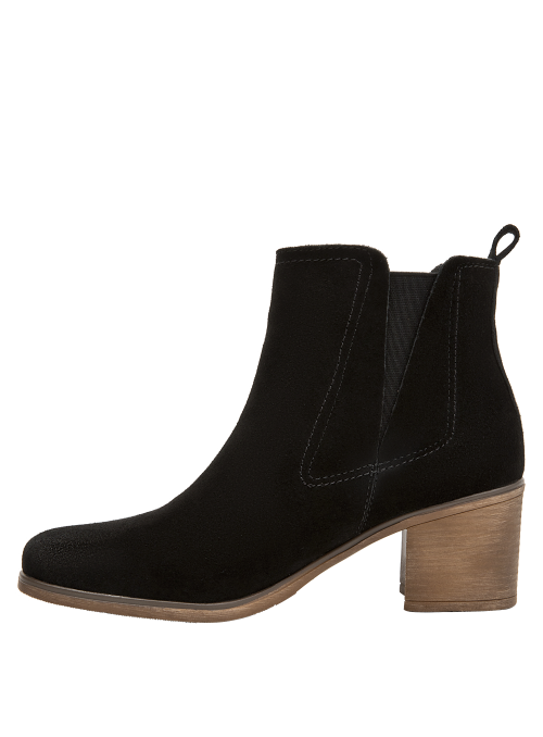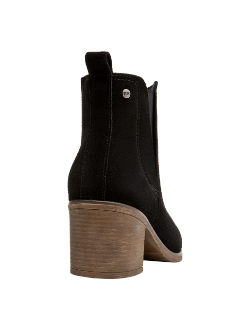 Botín de cuero para mujer en color negro, de estética limpia y contemporánea, con punta puntiaguda y taco bloque de 6 cm que aporta estabilidad y presencia. Elaborado con exterior de cuero y forro sintético/textil, luce acabado liso, costuras discretas y una silueta estilizada que se adapta a ocasiones casuales y semi formales.