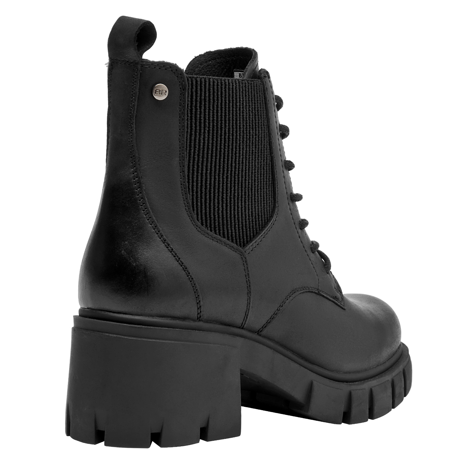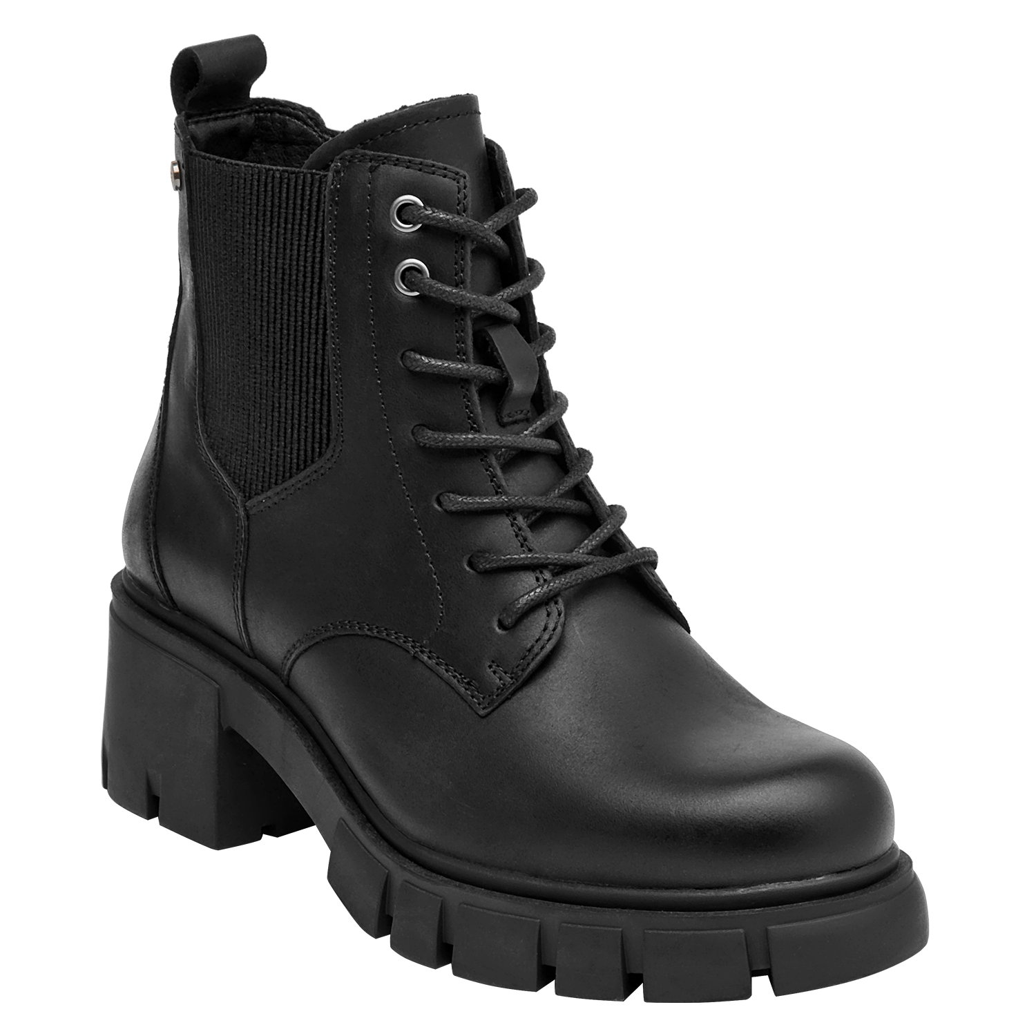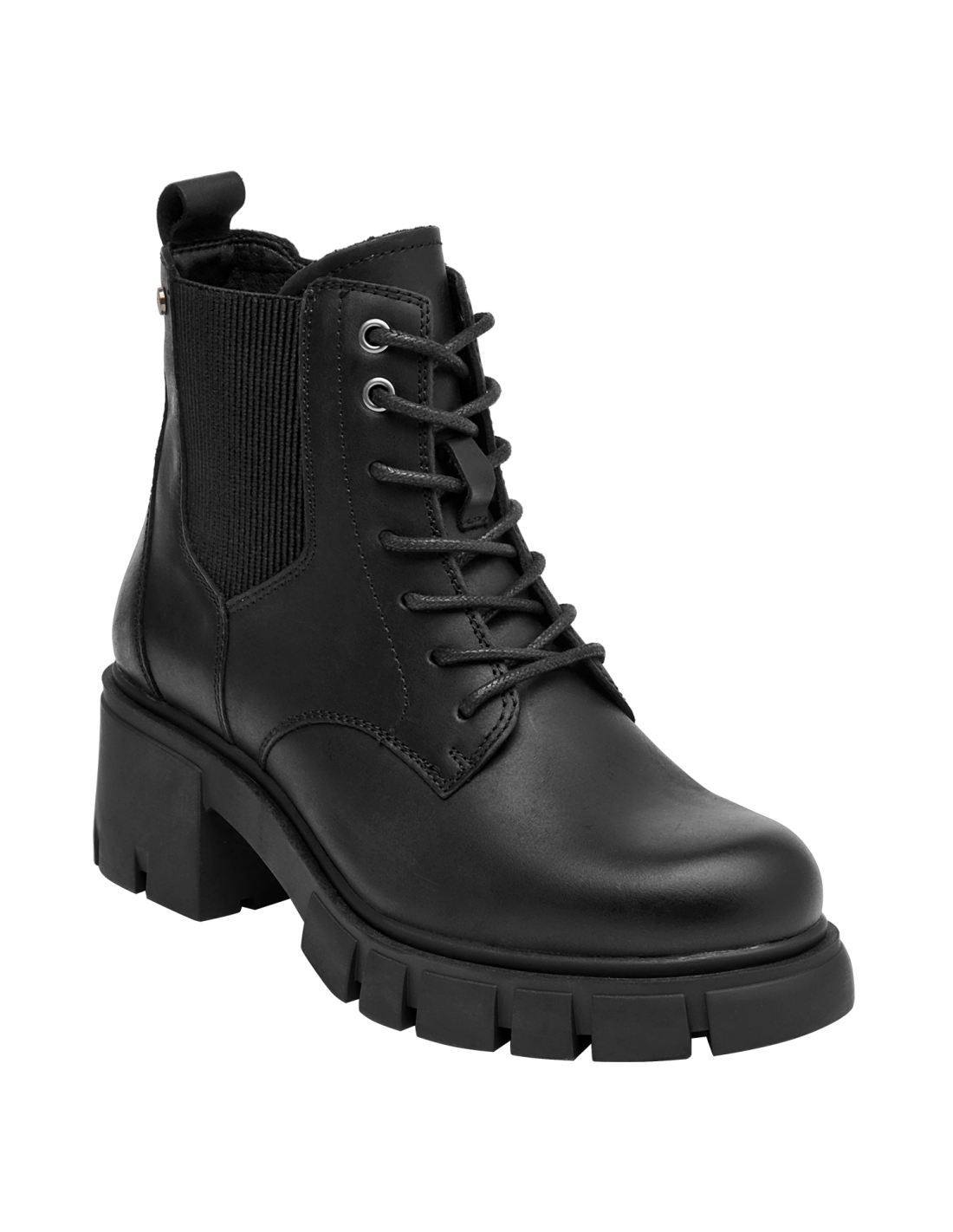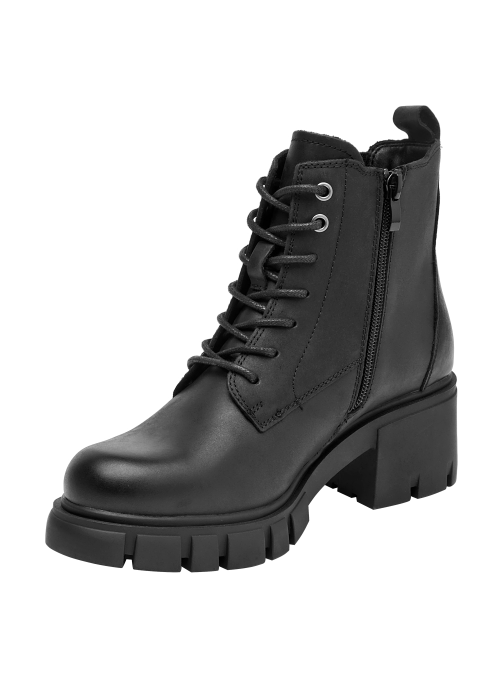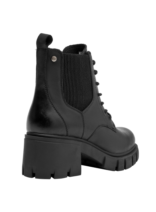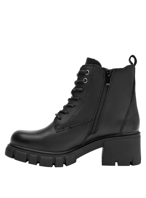 Botín urbano de cuero para mujer en color negro, con punta redonda y taco bloque de 6 cm. La capellada de cuero suma carácter, y el forro sintético/textil aporta ligereza. La altura moderada y la base ancha favorecen un paso estable y un look depurado que se adapta del día a la noche.