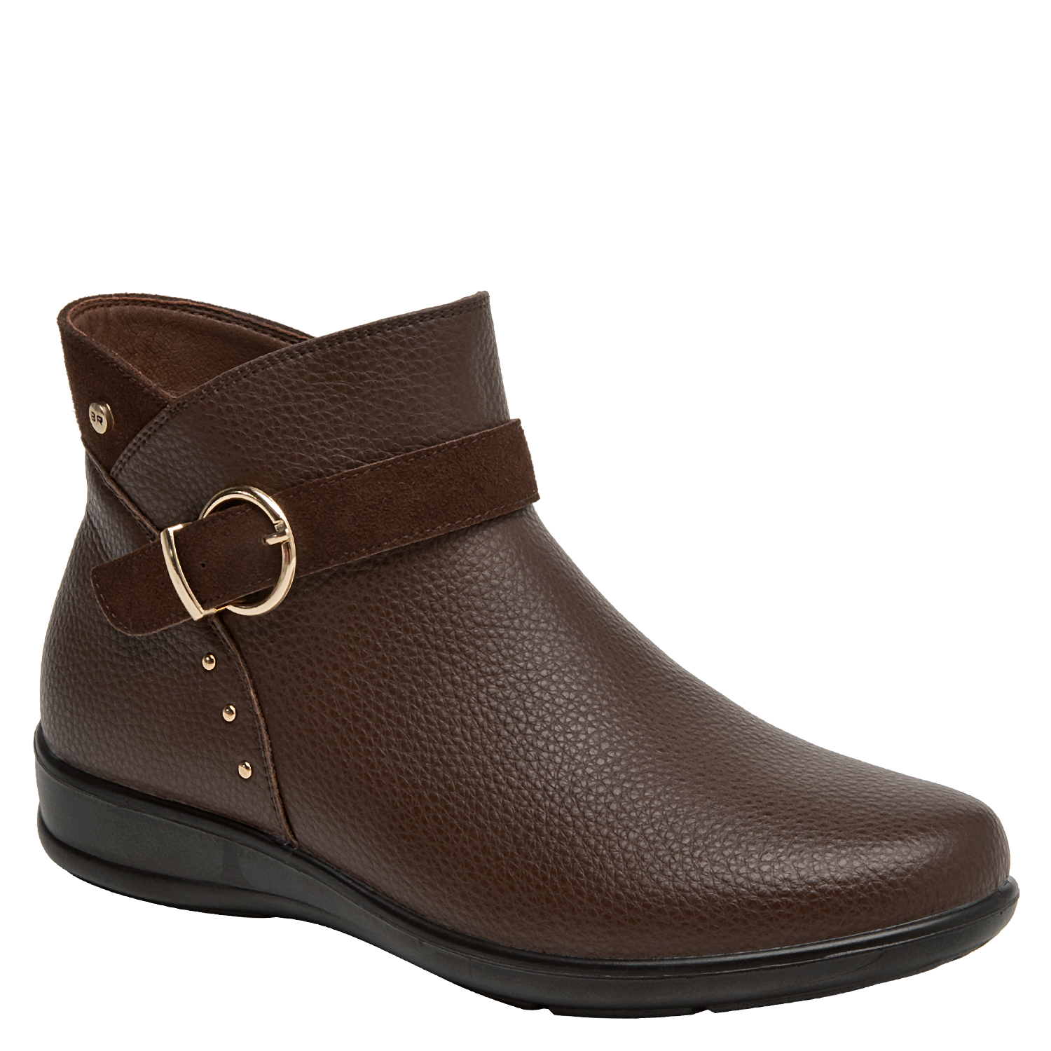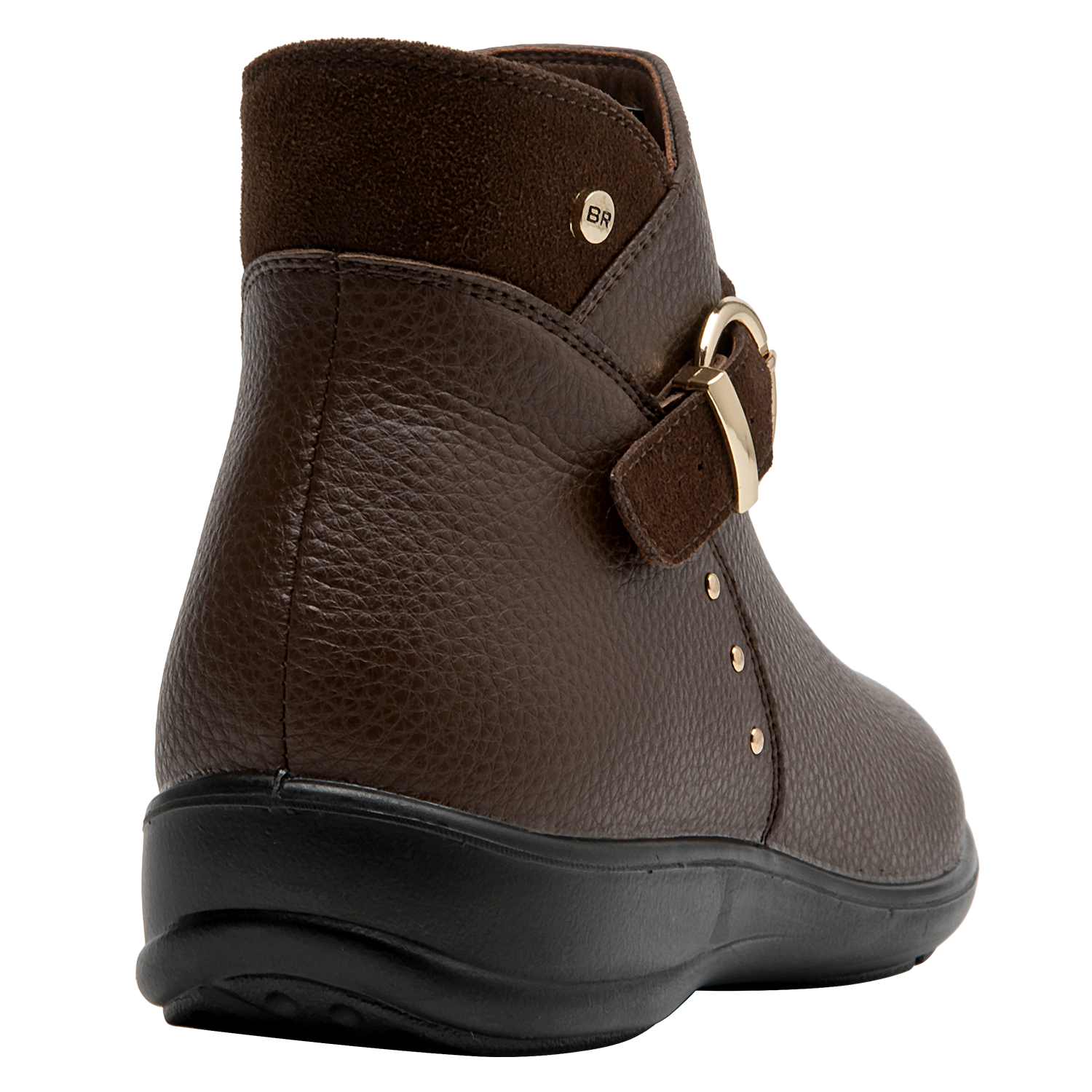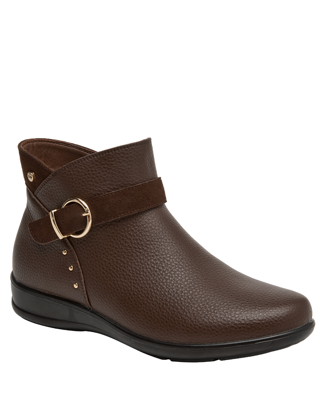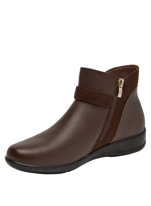 Botín de cuero para mujer de estilo urbano, en color moro, con punta redonda y taco plano de 3 cm que aporta estabilidad al caminar. Su capellada de cuero muestra un acabado liso con costuras discretas y un forro mixto sintético/textil que entrega suavidad interior. La suela de perfil bajo complementa un diseño versátil, pensado para el uso diario sin perder un look pulido y actual.