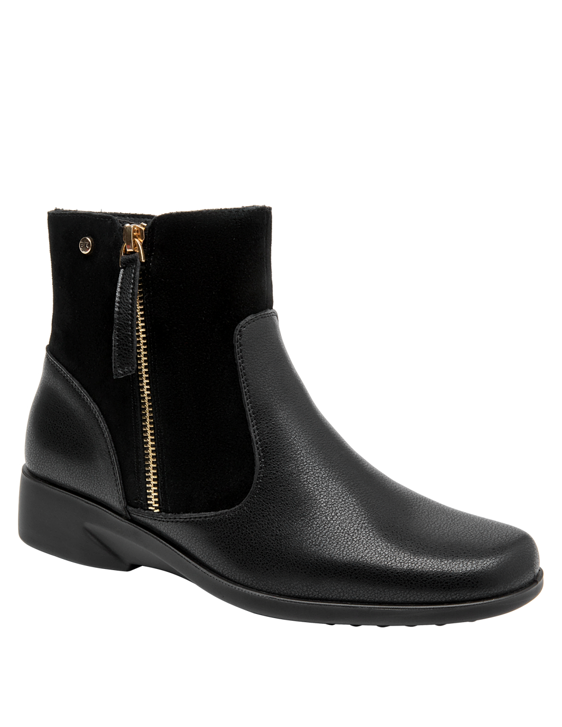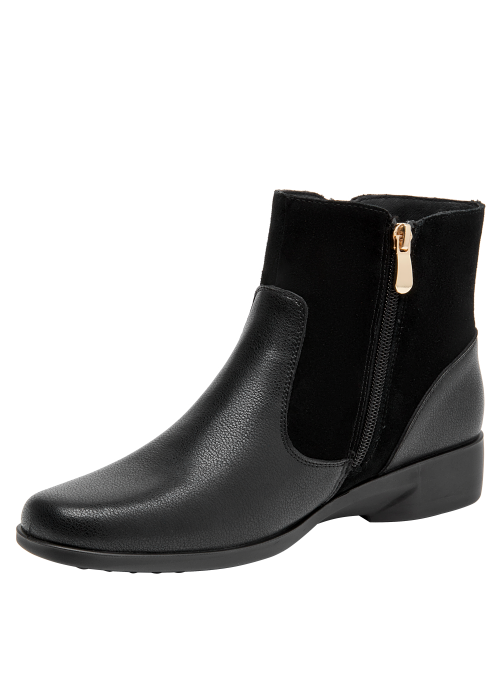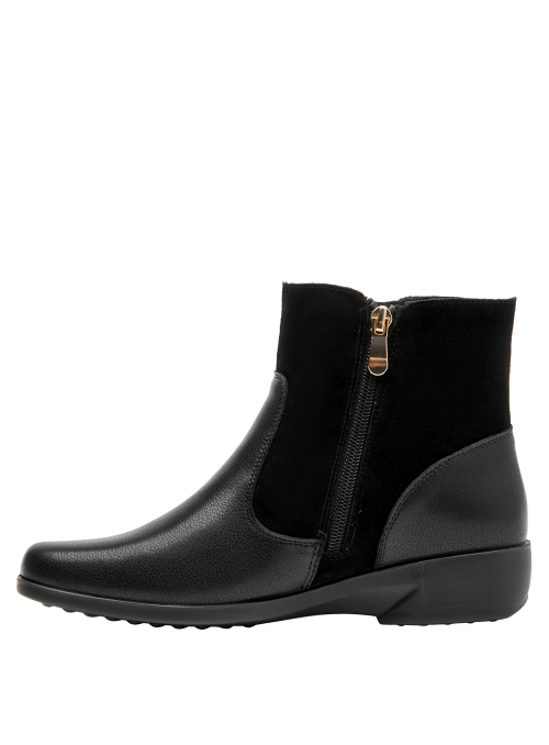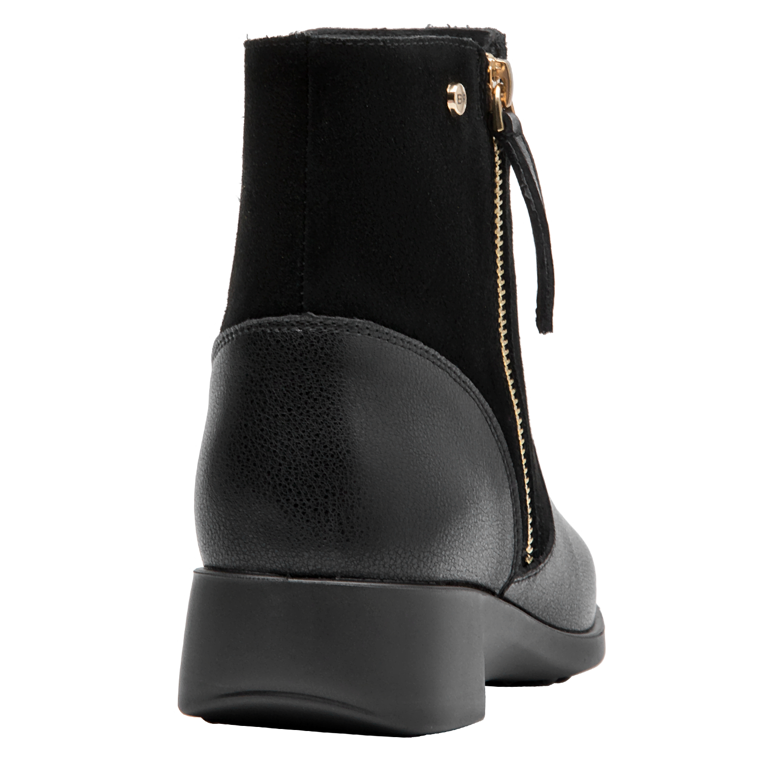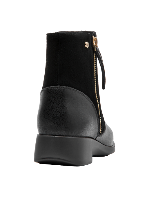 Botín urbano de cuero para mujer en color negro, con punta cuadrada y taco plano de 3 cm. La capellada de cuero presenta un acabado sobrio y atemporal, mientras el forro sintético/textil suma una sensación agradable al contacto. Su silueta de líneas limpias y base estable lo vuelve una elección versátil para el día a día.