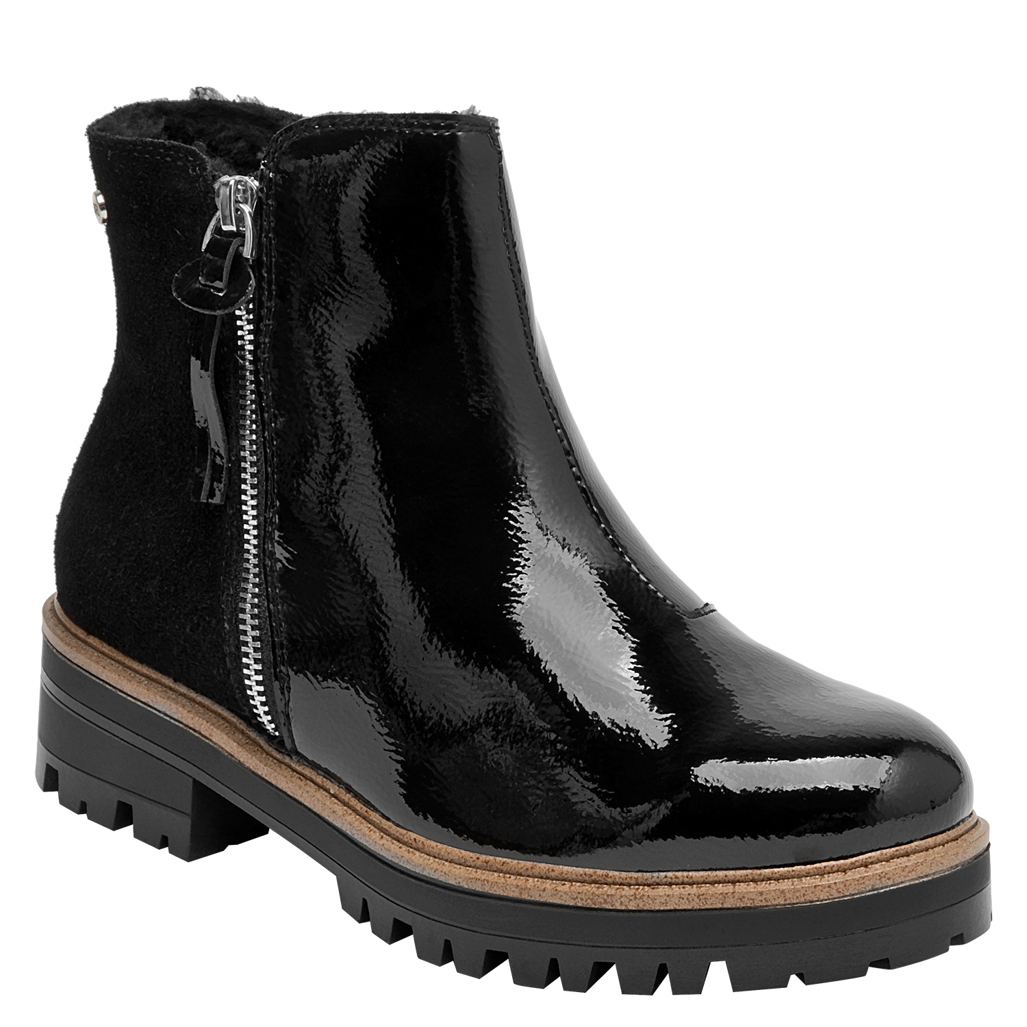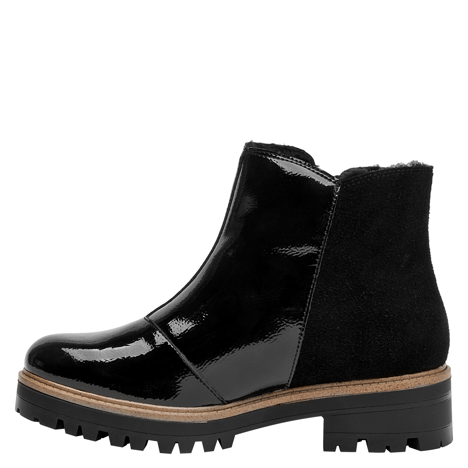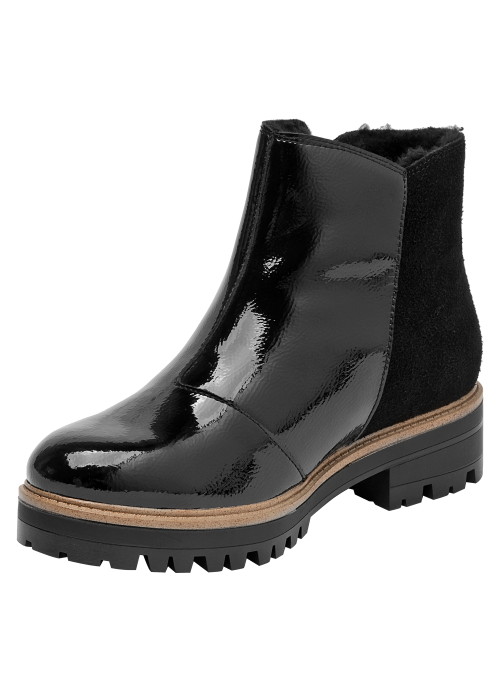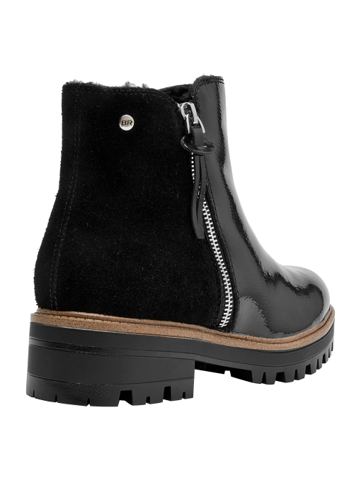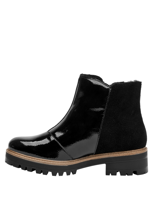 Botín urbano para mujer en color negro, confeccionado en material sintético con forro mixto sintético/textil. Presenta punta redonda y taco bloque de 4 cm que aporta estabilidad y una silueta cómoda para el día a día. De líneas limpias y costuras discretas, su acabado versátil combina fácilmente, mientras su suela resistente acompaña tus pasos con firmeza.